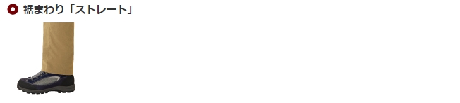 裾まわり:ストレート(裾が登山靴に被る形状で、裾から泥や小石などが入りにくい)