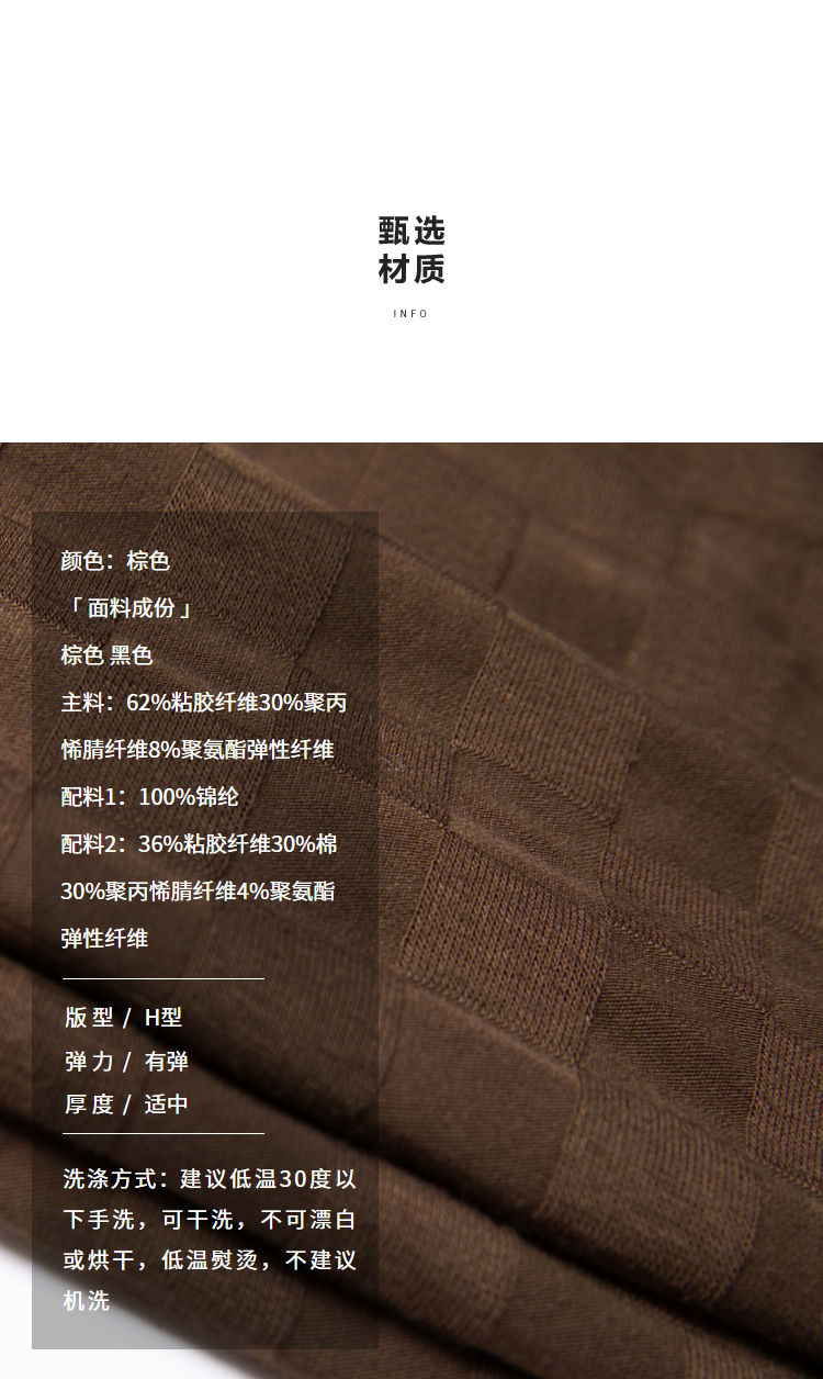 材質成分 黏膠纖維(黏膠纖維)62% 聚丙烯腈纖維(壓克力纖維)30% 聚氨酯彈性纖維(氨綸)8%