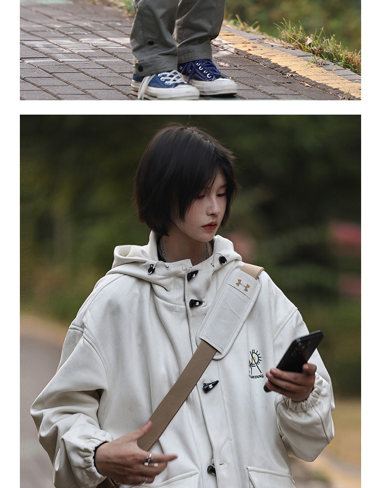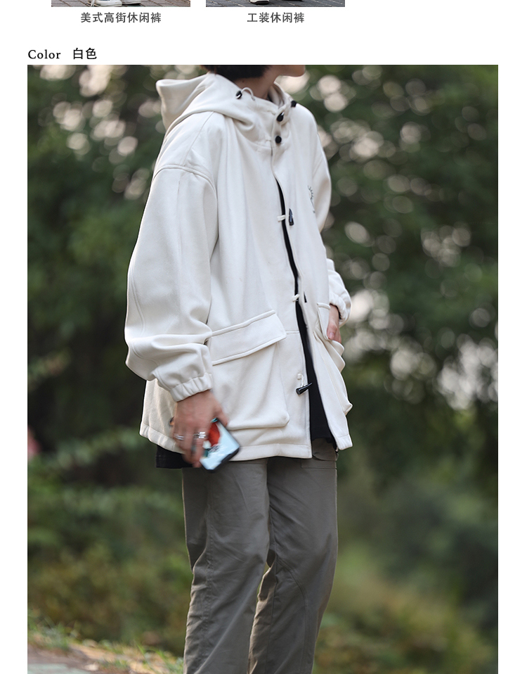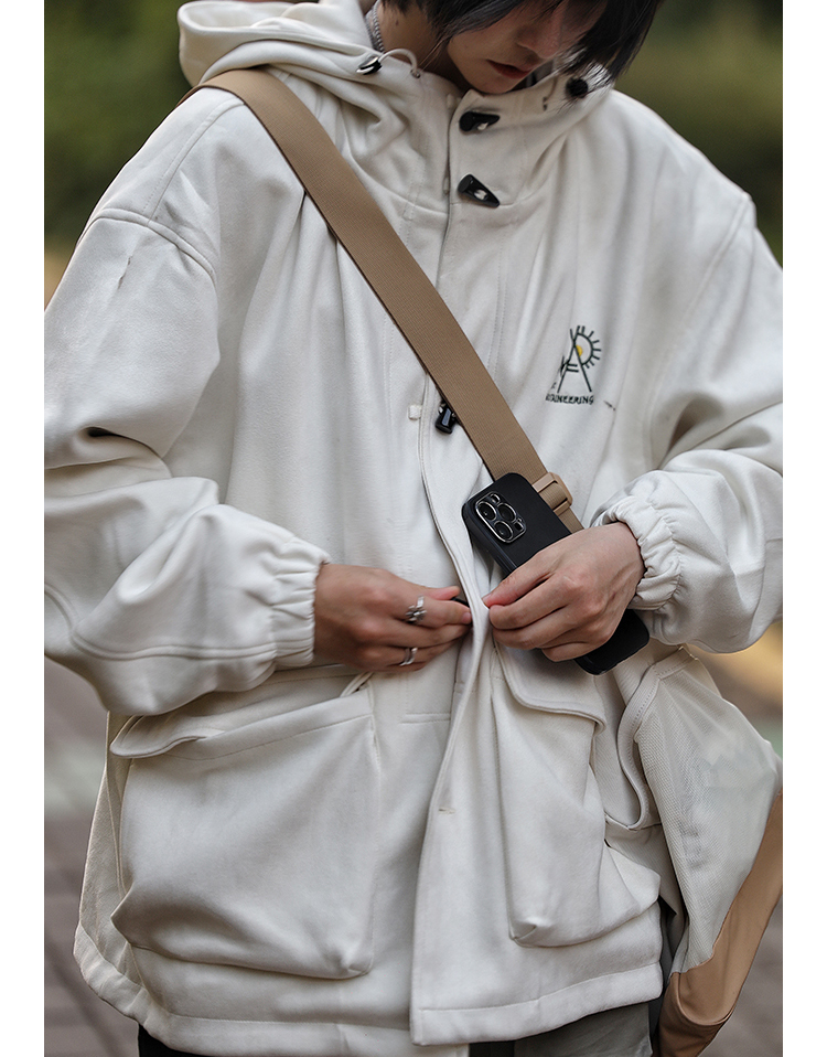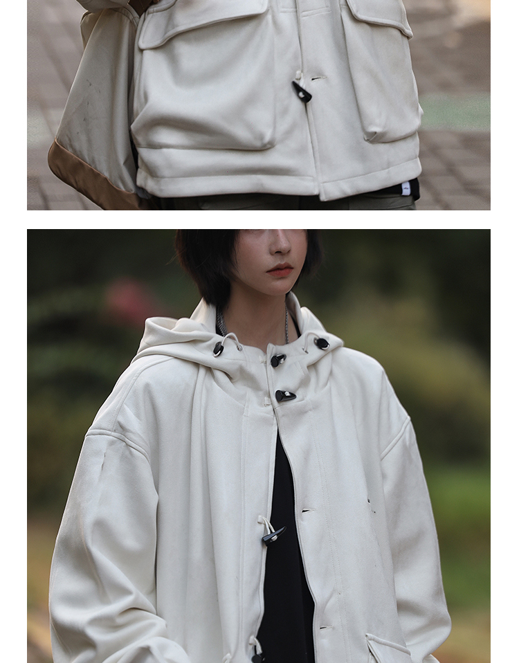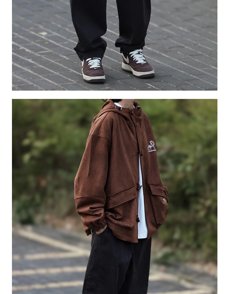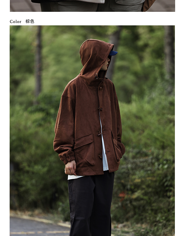 Nobodyknows 秋冬日系簡約麂皮牛角扣連帽夾克情侶休閒男衛衣外套