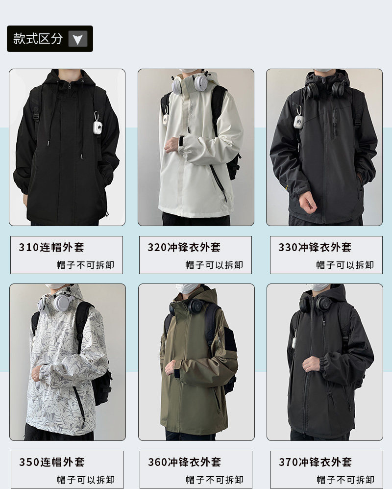 顏色分類 320黑色三合一,320白色三合一,320黑色一體絨加絨加厚,黑色連帽衝鋒衣320,白色連帽衝鋒衣320,灰色連帽衝鋒衣320,藏青連帽衝鋒衣320,米白色連帽衝鋒衣330,黑色連帽衝鋒衣330,灰色連帽衝鋒衣330,黑色連帽衝鋒衣350,白色連帽衝鋒衣350,軍綠連帽衝鋒衣330,350黑色三合一,350白色三合一