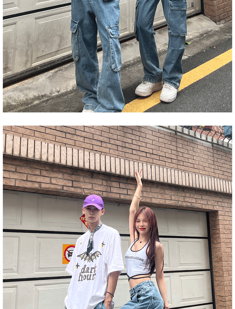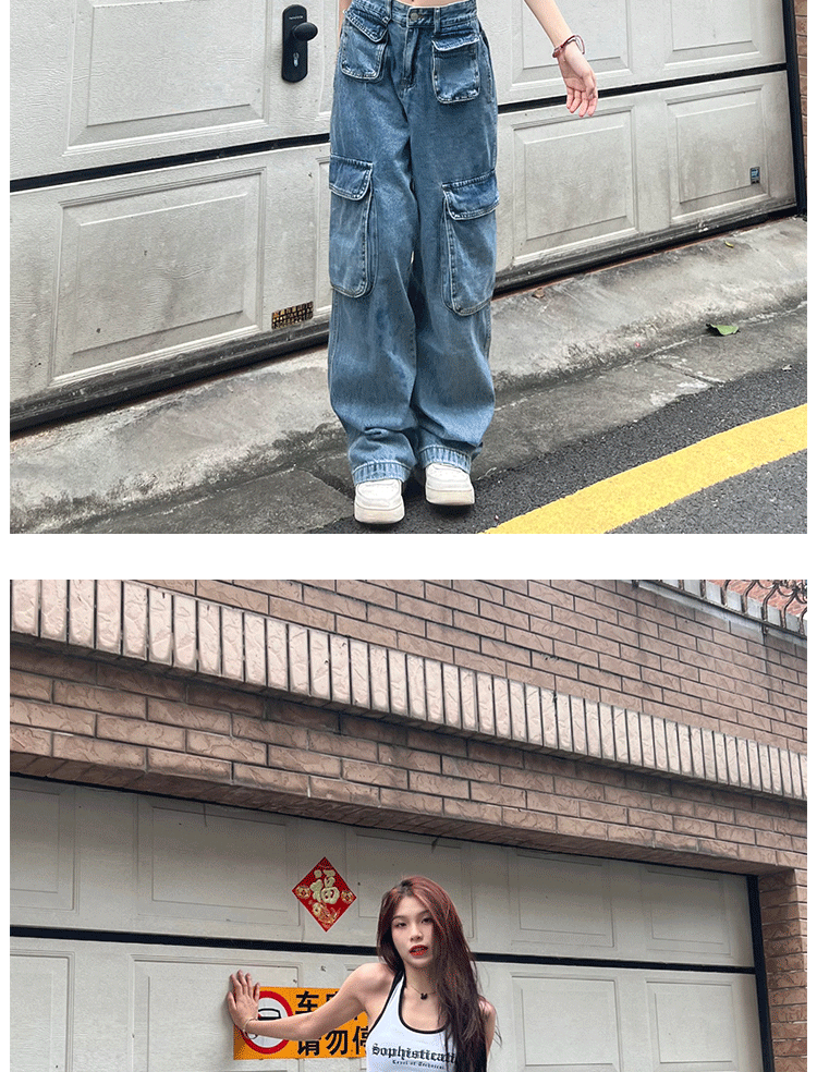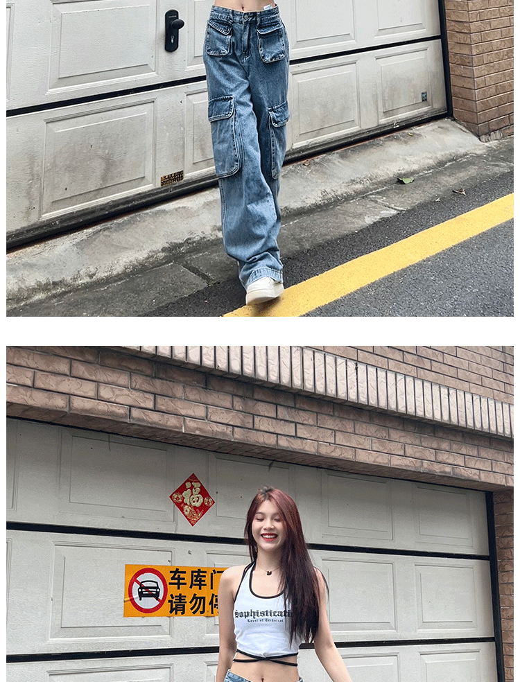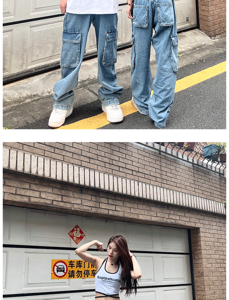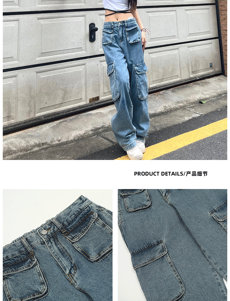 1N1N原創美式街頭多口袋做舊水洗淺色牛仔褲女辣妹低腰情侶休閒褲