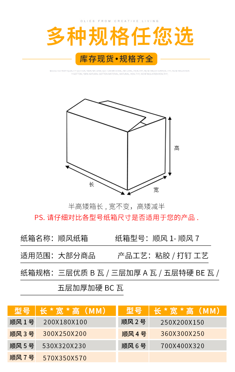 瓦楞 SF2号250*200*180mm(20个),SF3号300*250*200mm(10个),SF4号360*300*250mm(10个),SF5号530*320*230mm10个,SF6号700*400*320mm10个,SF7号570*350*570mm10个,SF1#200*180*100MM20个