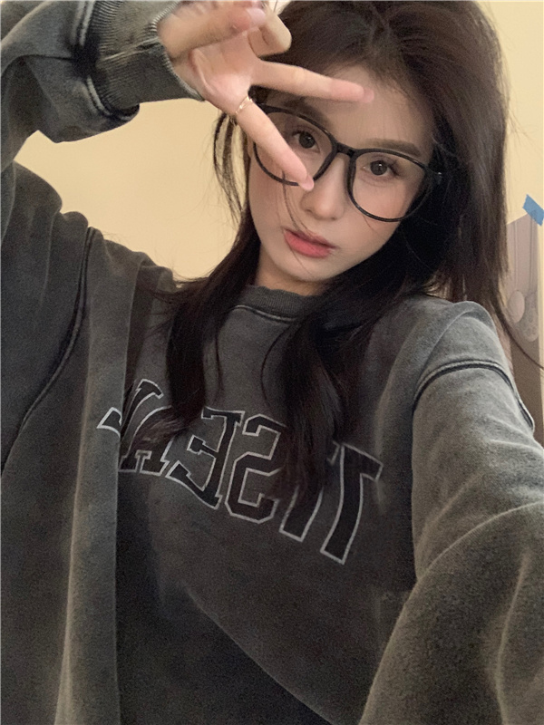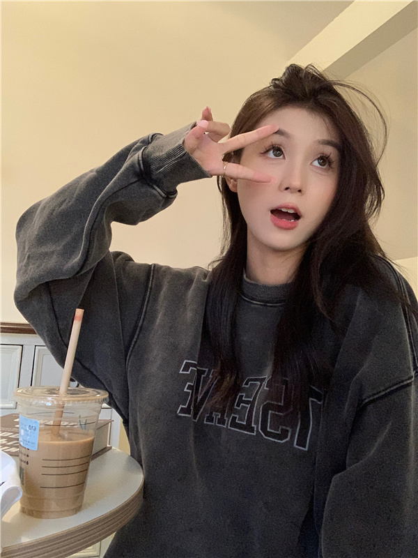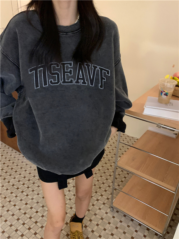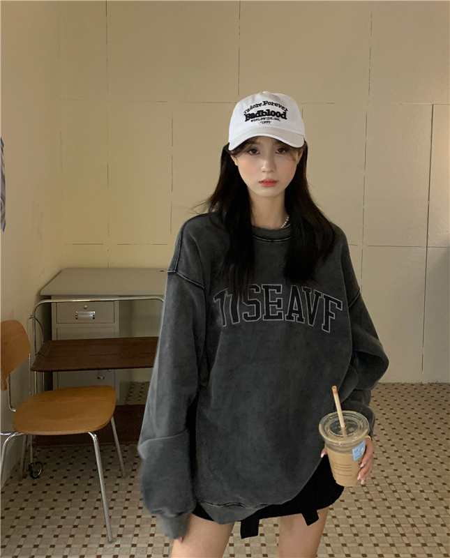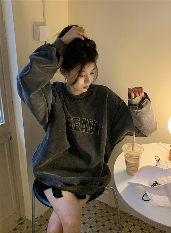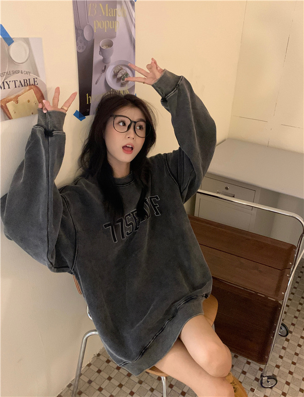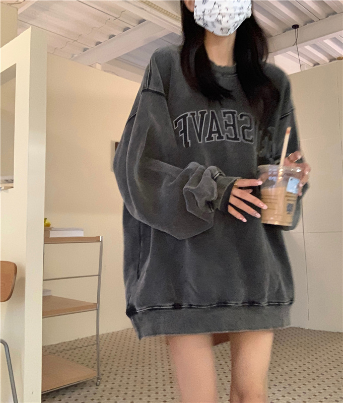 美式復古做舊休閒百搭厚棉T外套女秋季圓領無帽套頭寬鬆中長版上衣