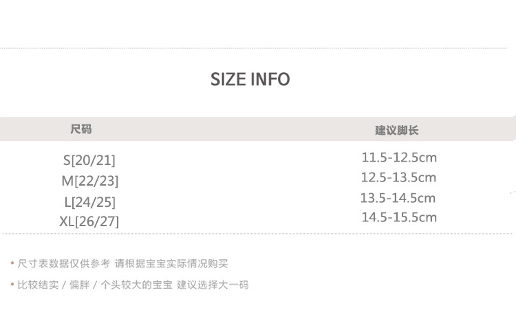 童袜尺码 20-21【脚长11.5cm-12.5cm】,22-23【脚长12.5cm-13.5cm】,24-25【脚长13.5cm-14.5cm】,26-27【脚长14.5cm-15.5cm】