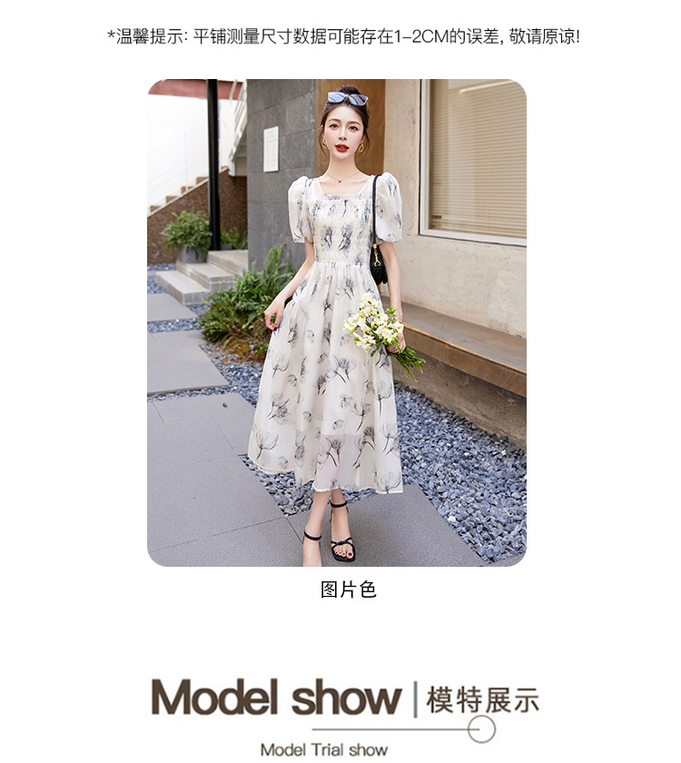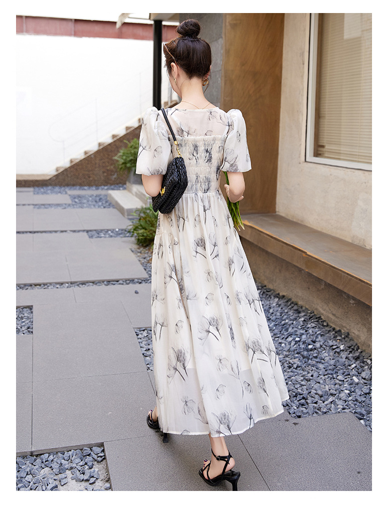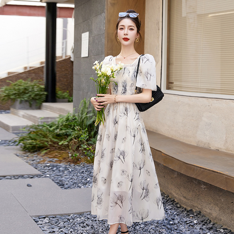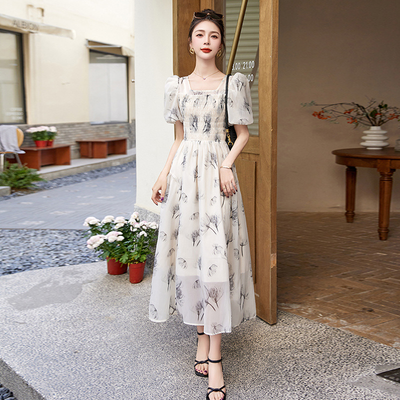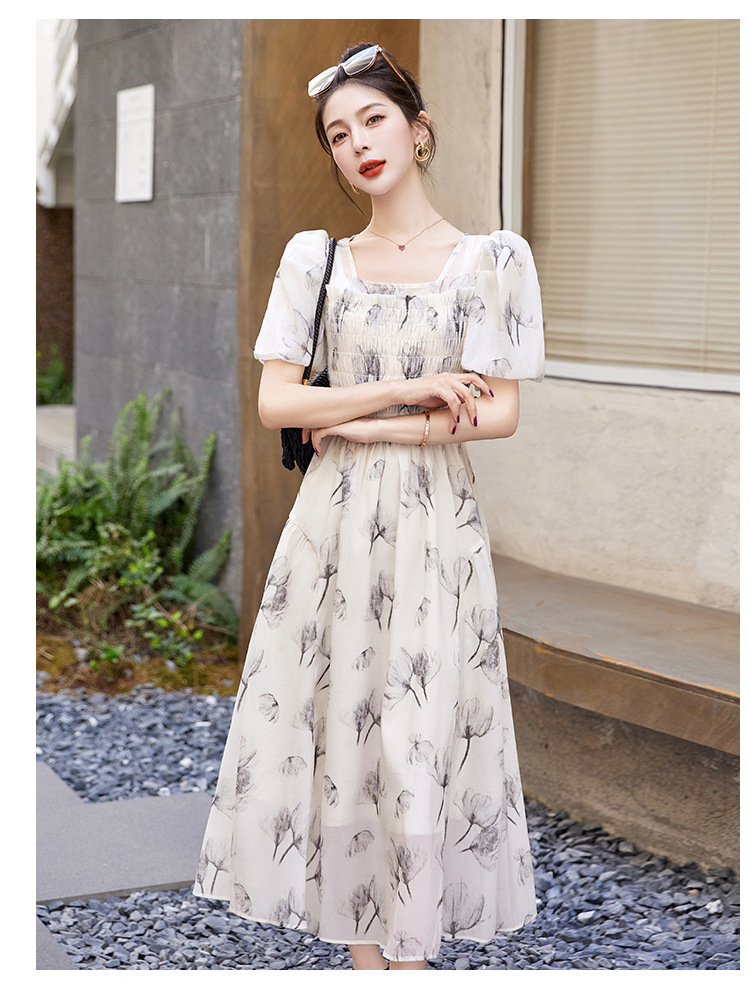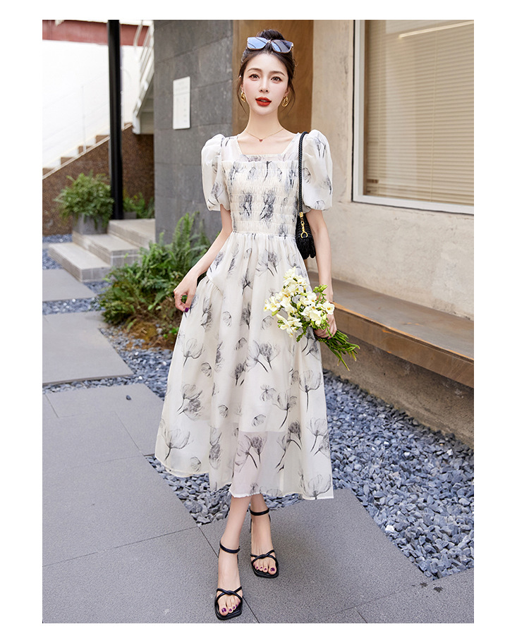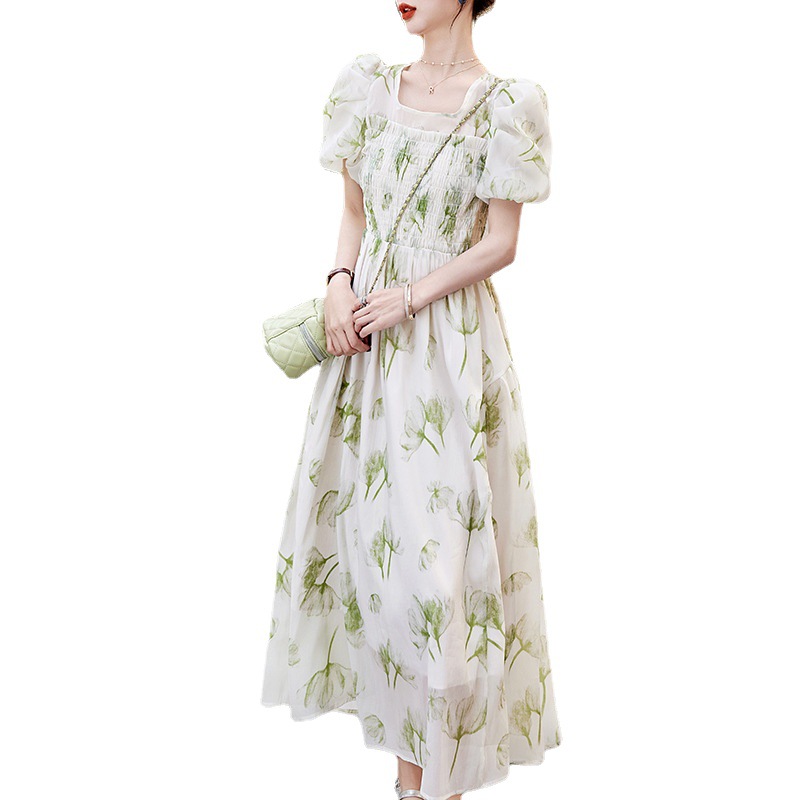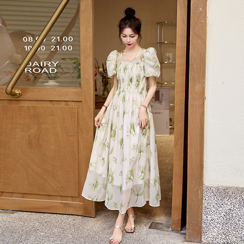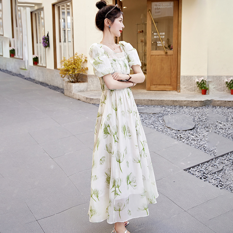 碎花连衣裙2023夏季新款茶歇法式设计感小众短袖泡泡袖仙女长裙子