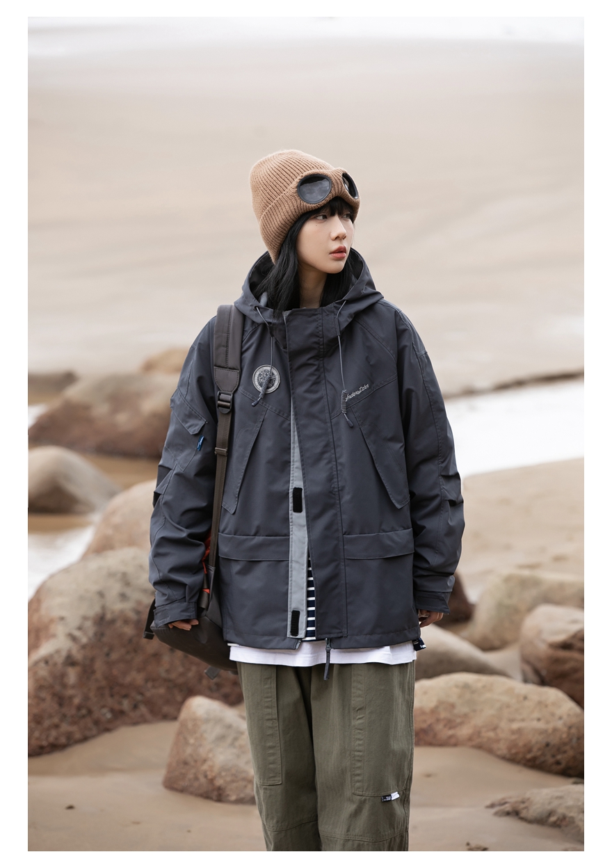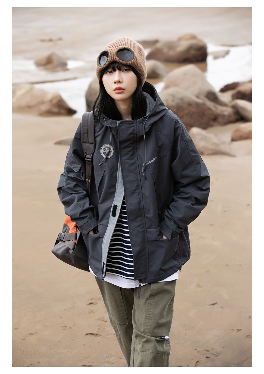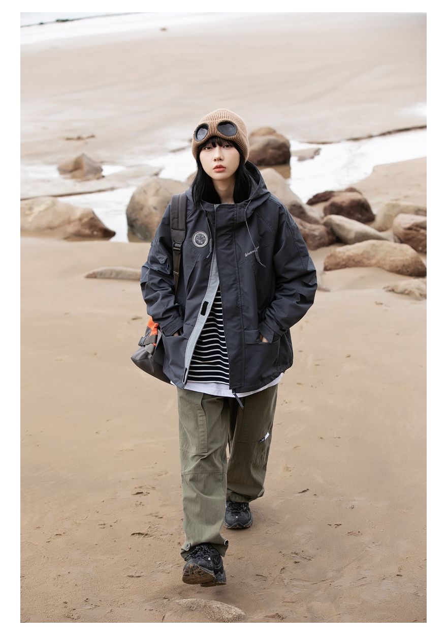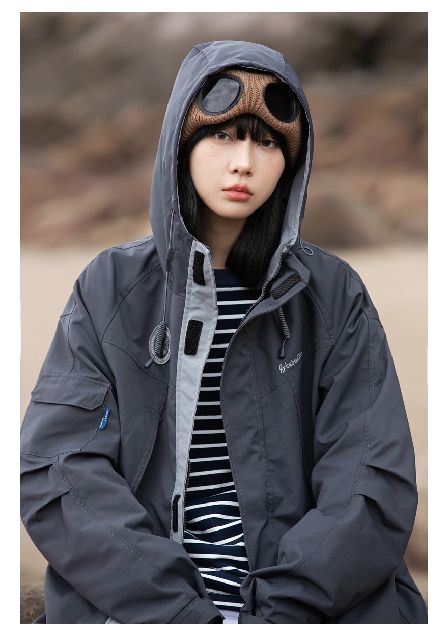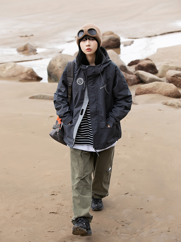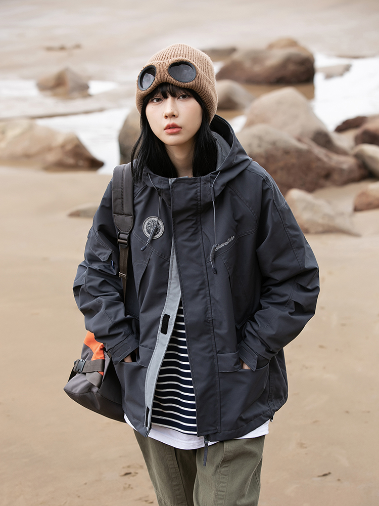 ORDERLINESS 日系潮牌戶外布貼連帽工裝外套女寬鬆情侶衝鋒衣夾克