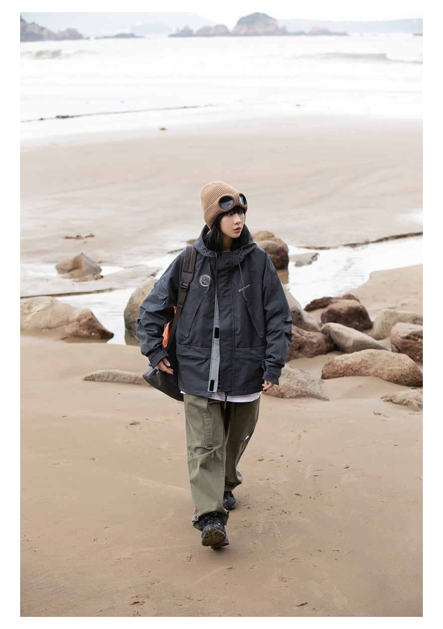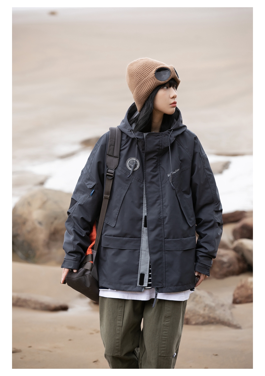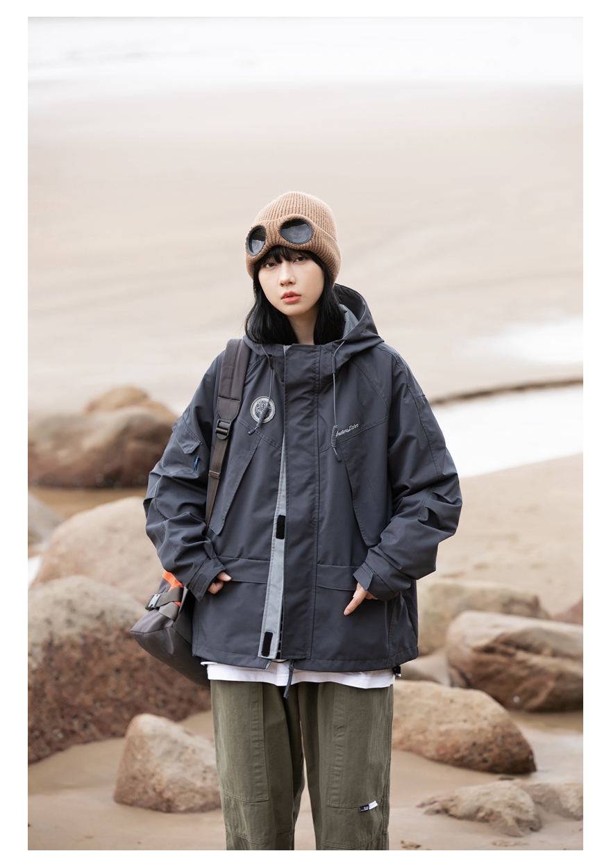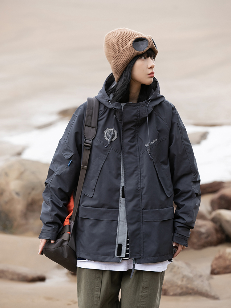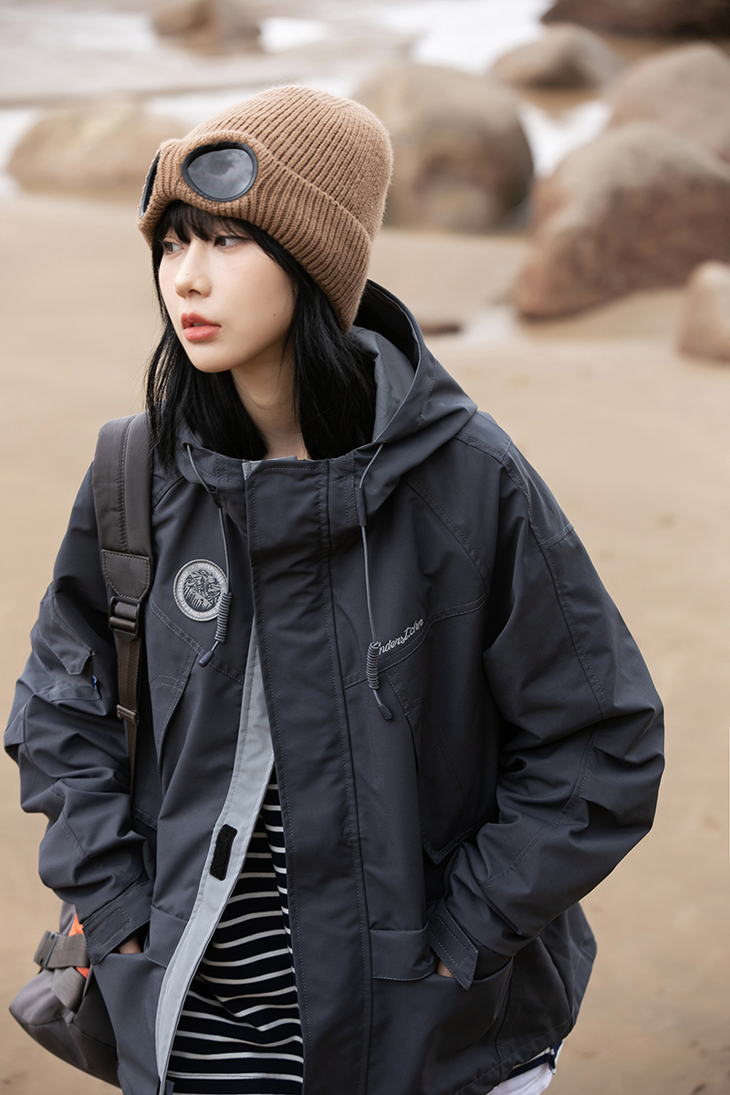 ORDERLINESS 日系潮牌戶外布貼連帽工裝外套女寬鬆情侶衝鋒衣夾克