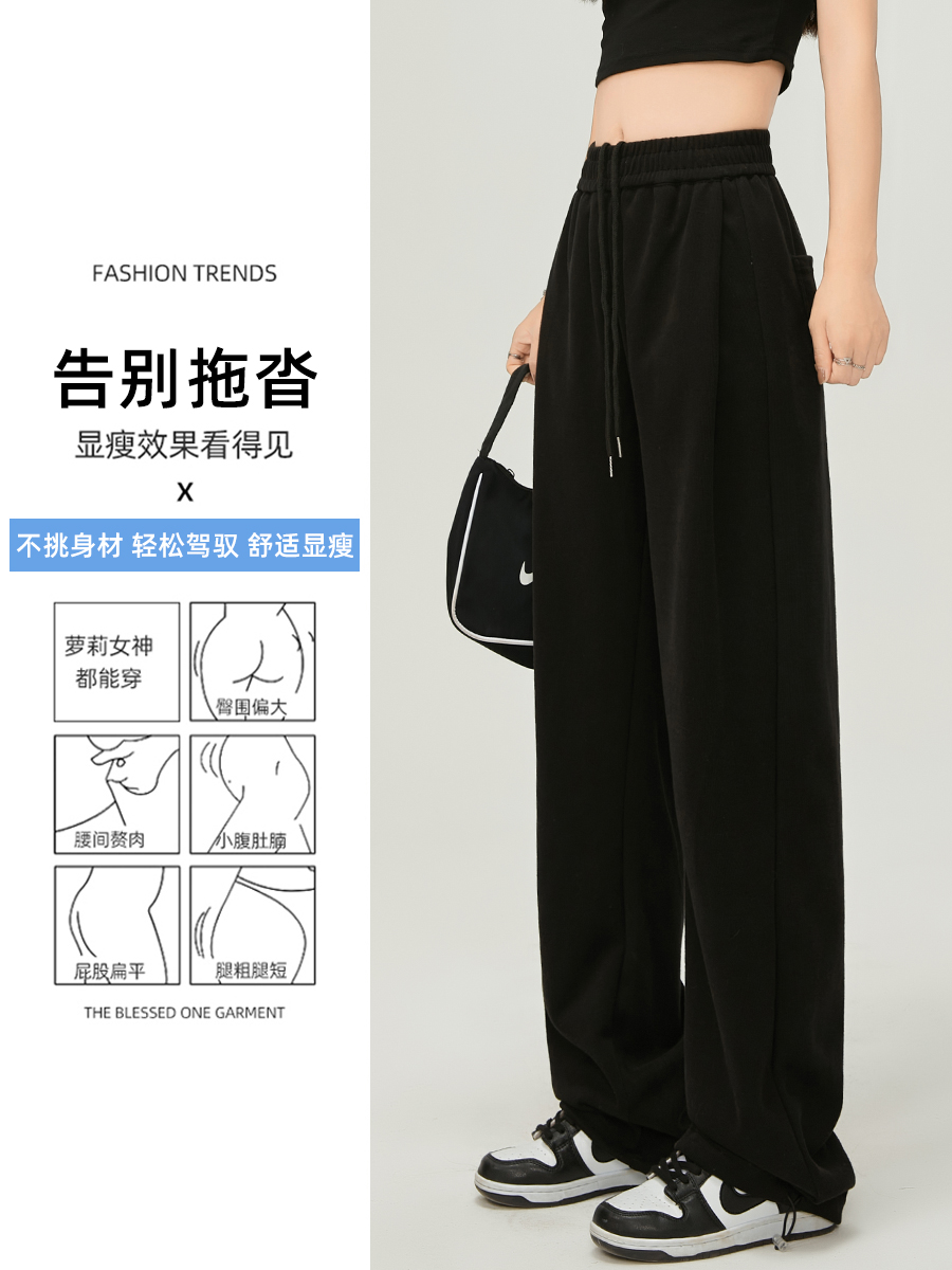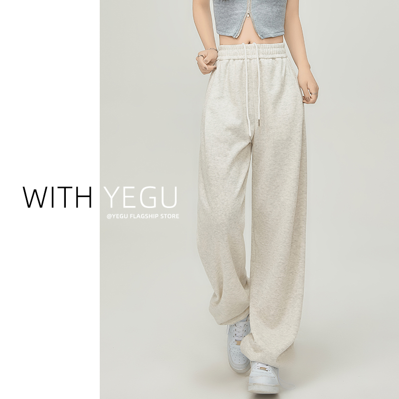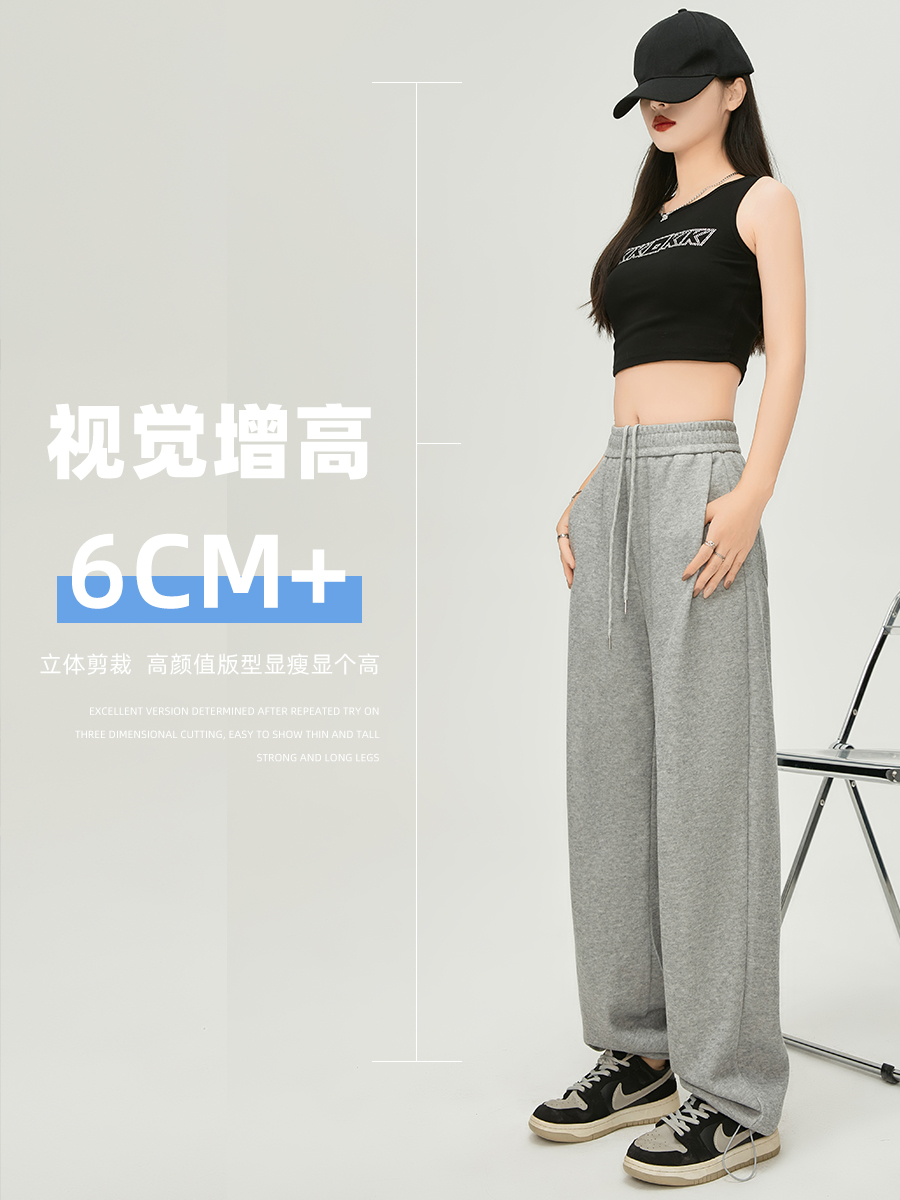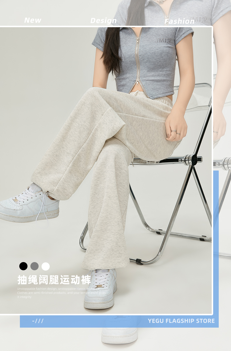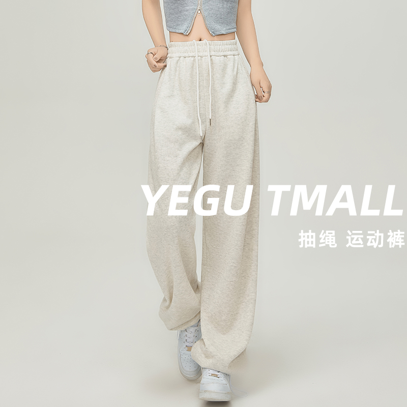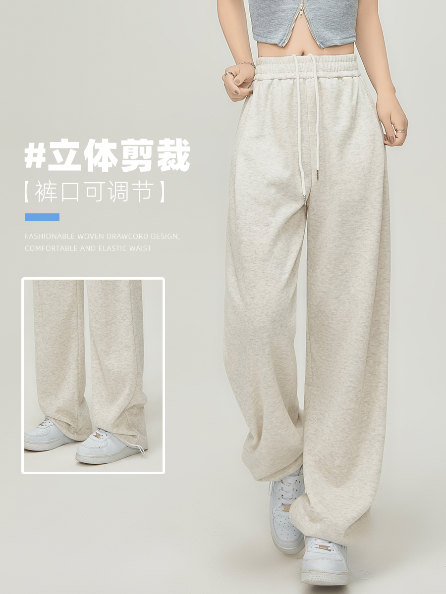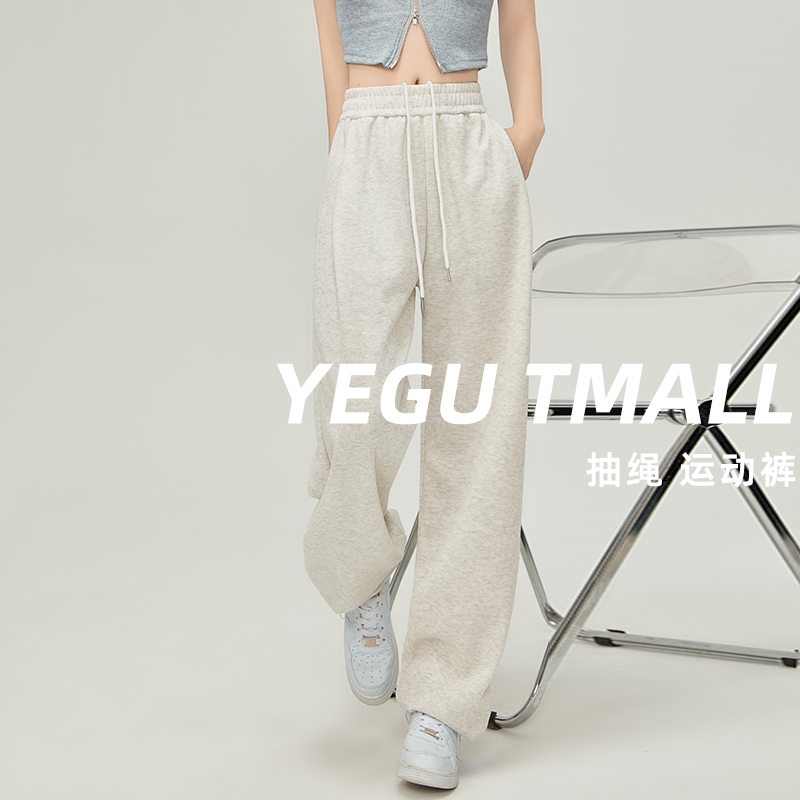 美式白灰色運動褲女春夏秋季2023高腰抽繩束口褲寬鬆闊腿休閒厚棉褲