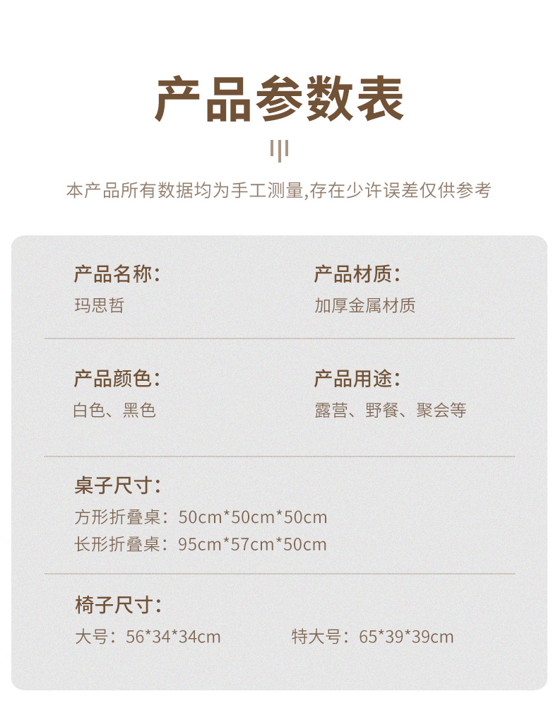 顏色分類 黑色方桌50cm(送收納袋+桌布) 黑色長桌95cm(送收納袋+桌布) 黑色長桌120cm(送收納袋+桌布) 米色方桌50cm(送收納袋+桌布) 米色長桌95cm(送收納袋+桌布) 米色長桌120cm(送收納袋+桌布) ↓↓以下爲桌椅套裝(摺疊凳款)↓↓ 黑色方桌+2把大號椅(送套餐收納包+桌布) 黑色方桌+4把大號椅(送套餐收納包+桌布) 黑色長桌95+4把大號椅(送套餐收納包+桌布) 黑色長桌95+6把大號椅(送套餐收納包+桌布) 米色方桌+2把大號椅(送套餐收納包+桌布) 米色方桌+4把大號椅(送套餐收納包+桌布) 米色長桌95+4把大號椅(送套餐收納包+桌布) 米色長桌95+6把大號椅(送套餐收納包+桌布) 黑色方桌+2把特大號椅(送套餐收納包+桌布) 黑色方桌+4把特大號椅(送套餐收納包+桌布) 黑色長桌95+4把特大號椅(送套餐收納包+桌布) 黑色長桌95+6把特大號椅(送套餐收納包+桌布) 黑色長桌120+6把大號椅(送套餐收納包+桌布) 黑色長桌120+6把特大號椅(送套餐收納包+桌布) 米色方桌+2把特大號椅(送套餐收納包+桌布) 米色方桌+4把特大號椅(送套餐收納包+桌布) 米色長桌95+4把特大號椅(送套餐收納包+桌布) 米色長桌95+6把特大號椅(送套餐收納包+桌布) 米色長桌120+6把大號椅(送套餐收納包+桌布) 米色長桌120+6把特大號椅(送套餐收納包+桌布) ↓↓以下爲桌椅套裝(月亮椅款)↓↓ 黑色方桌+2把月亮椅(送套餐收納包+桌布) 米色方桌+2把月亮椅(送套餐收納包+桌布) 黑色長桌95+4把月亮椅(送套餐收納包+桌布) 米色長桌95+4把月亮椅(送套餐收納包+桌布) ↓↓以下爲桌椅套裝(克米特椅款)↓↓ 黑色方桌+2把中號克米特椅(送套餐收納包+桌布) 米色方桌+2把中號克米特椅(送套餐收納包+桌布) 黑色長桌95+4把中號克米特椅(送套餐收納包+桌布) 米色長桌95+4把中號克米特椅(送套餐收納包+桌布) ↓↓以下爲露營套裝↓↓ 精緻露營套餐一【黑化風/1-2人】 精緻露營套餐二【黑化風/2-4人】 精緻露營套餐三【黑化風/2-4人】 精緻露營套餐四【黑化風/4-6人】 精緻露營套餐一【淡雅風/1-2人】 精緻露營套餐二【淡雅風/2-4人】 精緻露營套餐三【淡雅風/2-4人】 精緻露營套餐四【淡雅風/4-6人】 卡其色中號克米特椅*2+收納袋 黑色中號克米特椅*2+收納袋 ♥店內可單獨購買其他桌椅♥