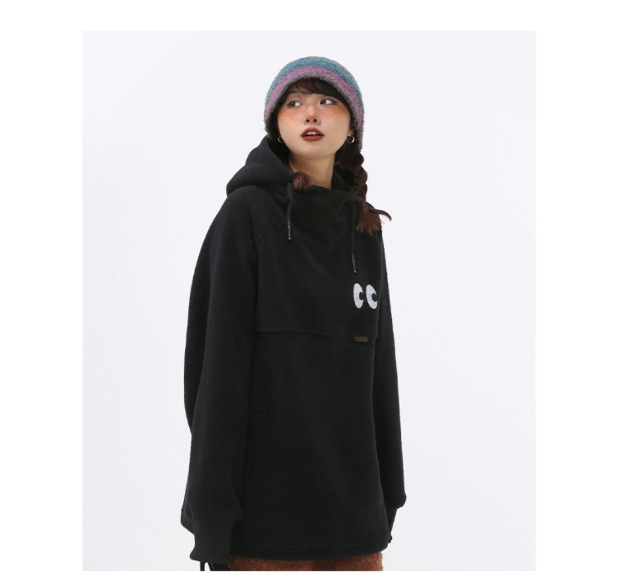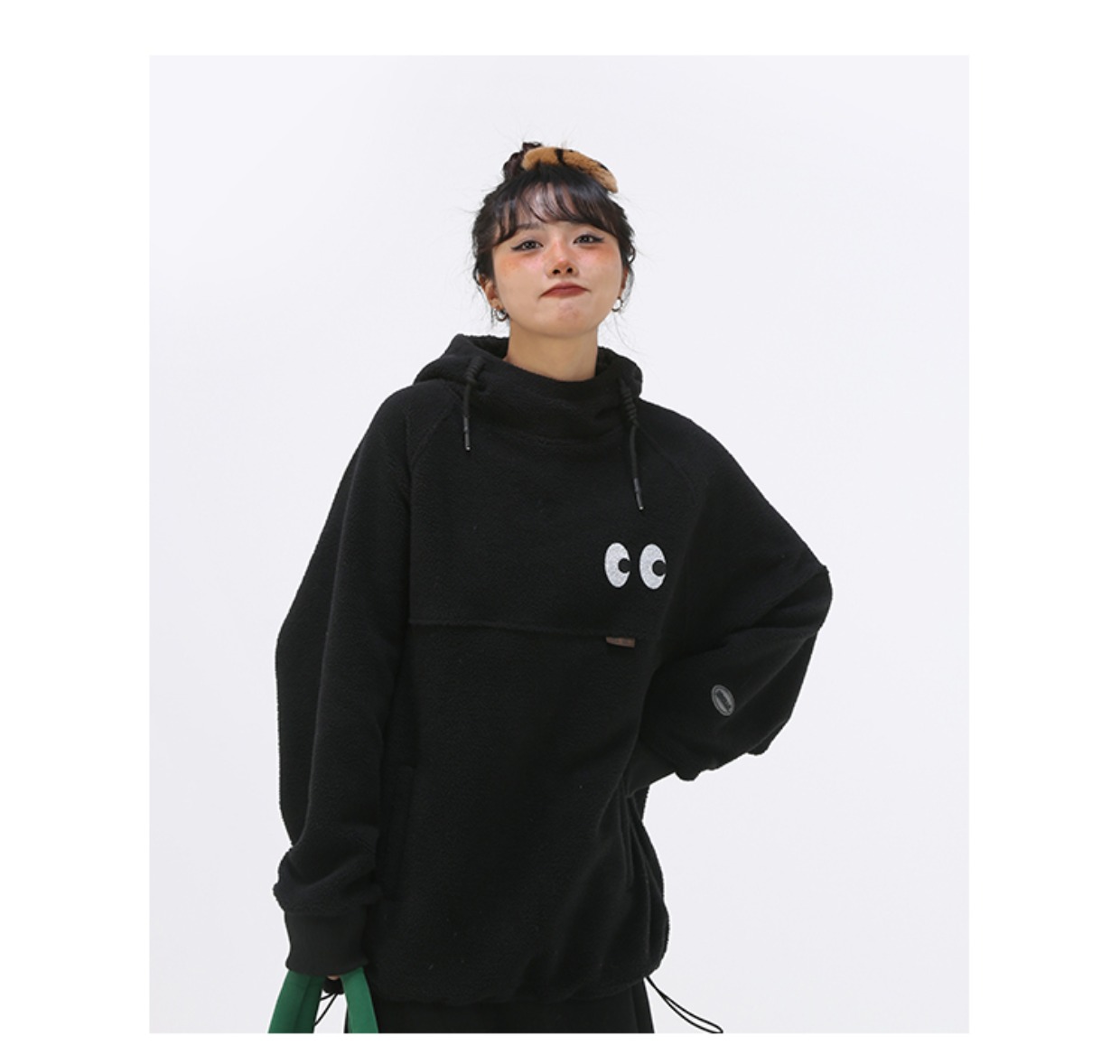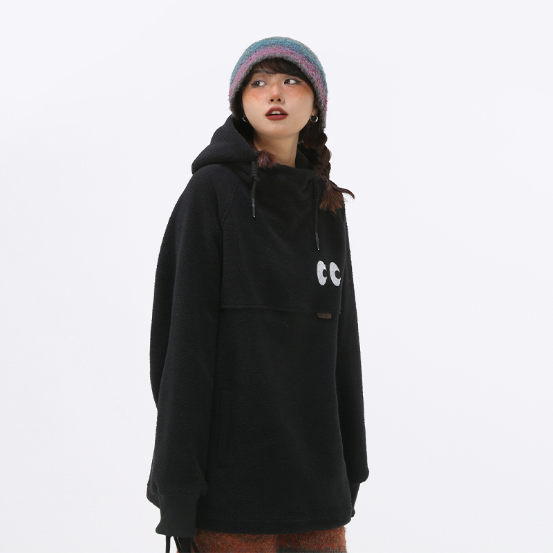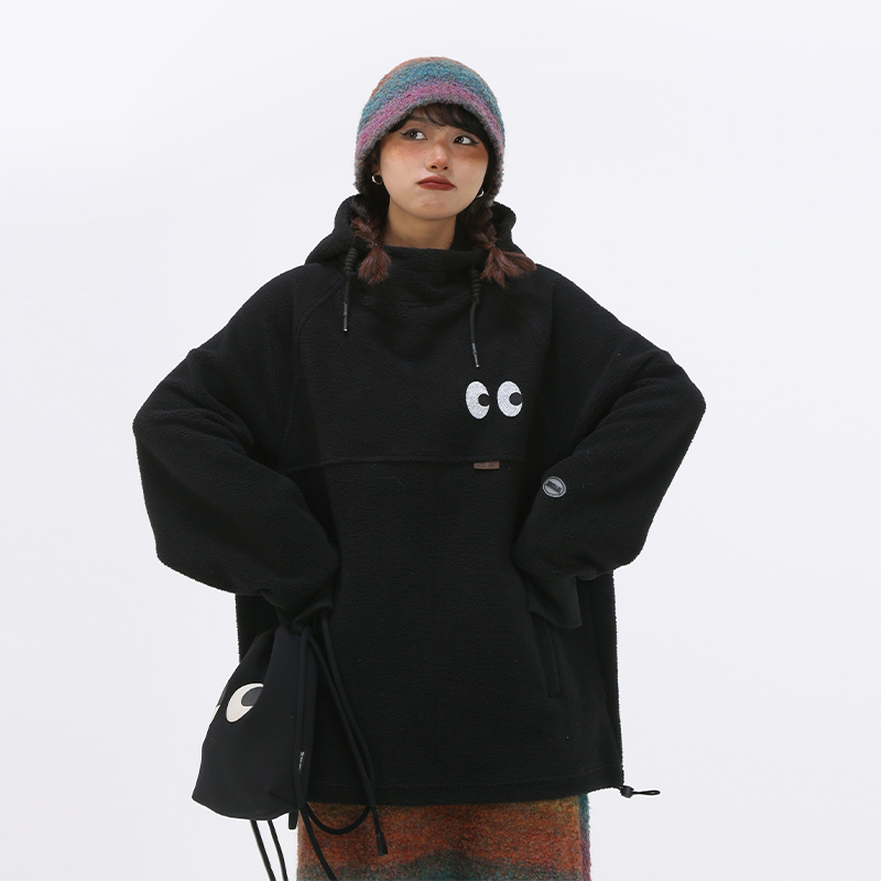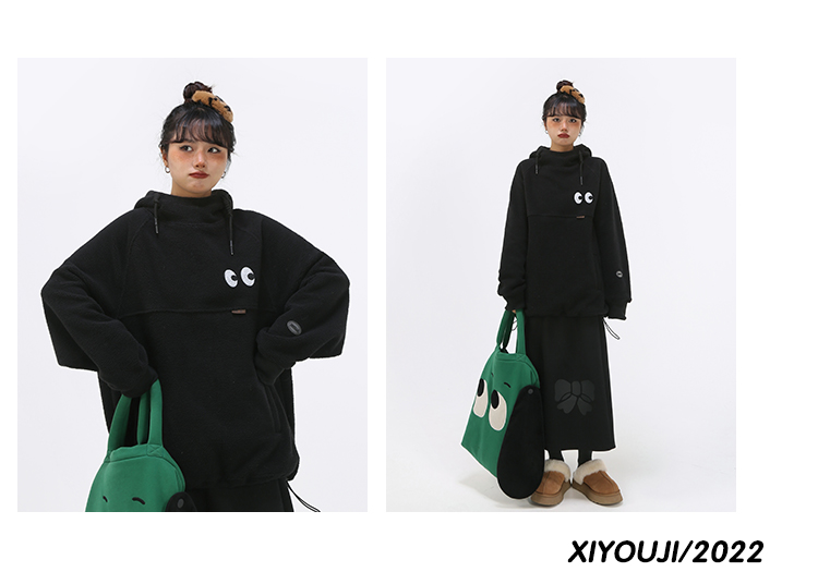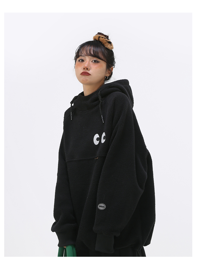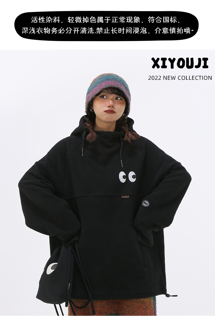 嬉遊記原創2023冬新款黑色寬鬆搖粒絨連帽運動衫女加絨保暖休閒上衣