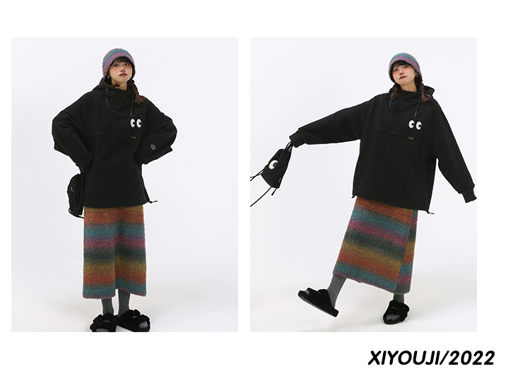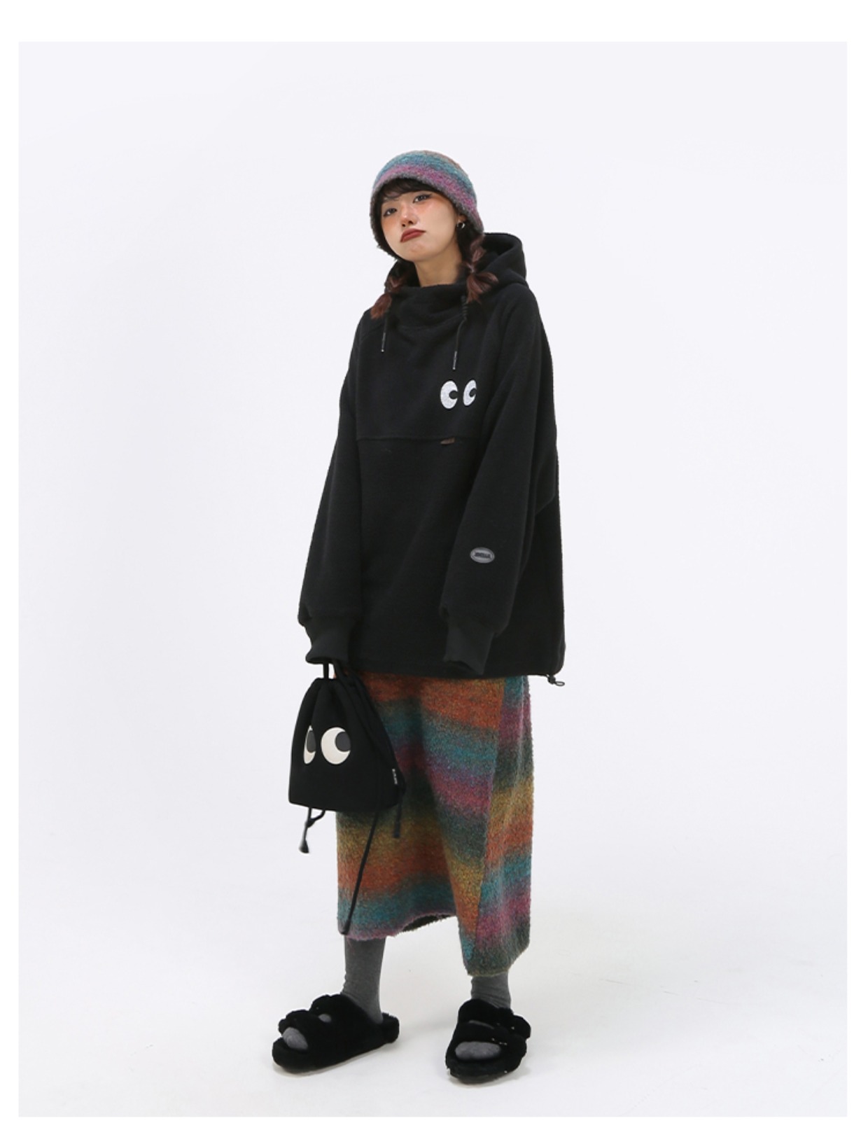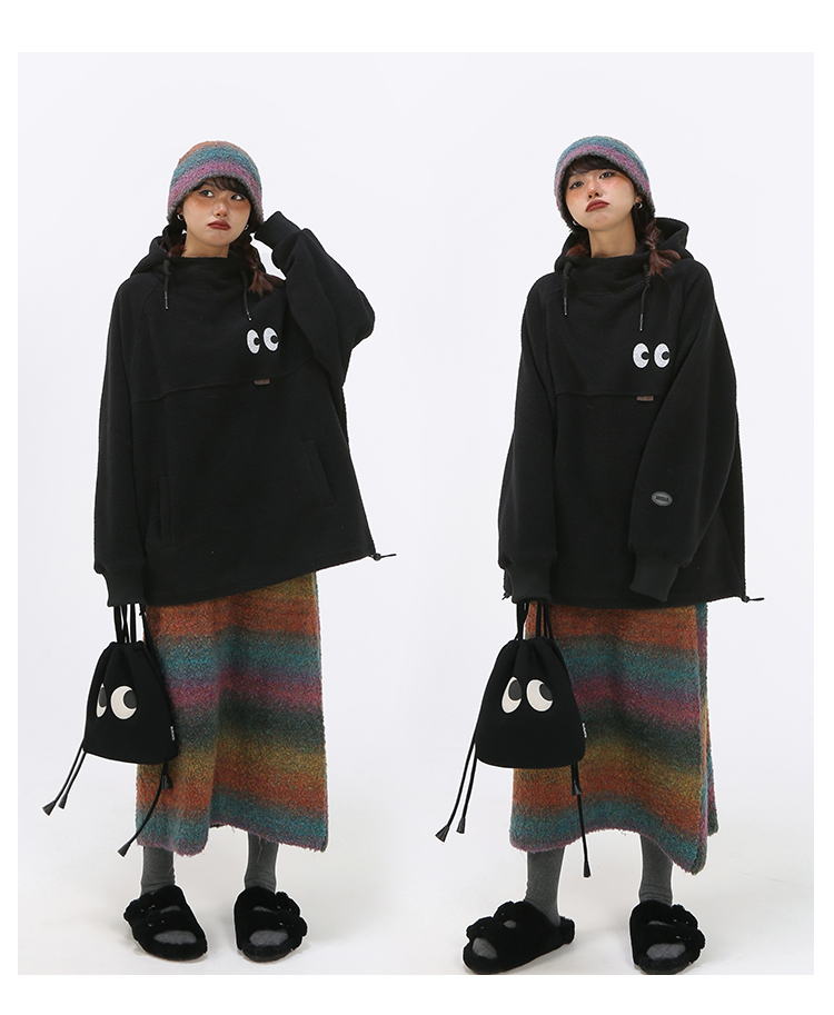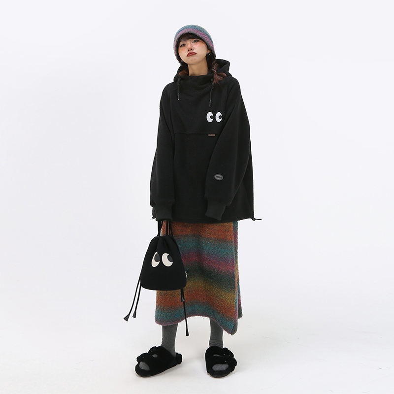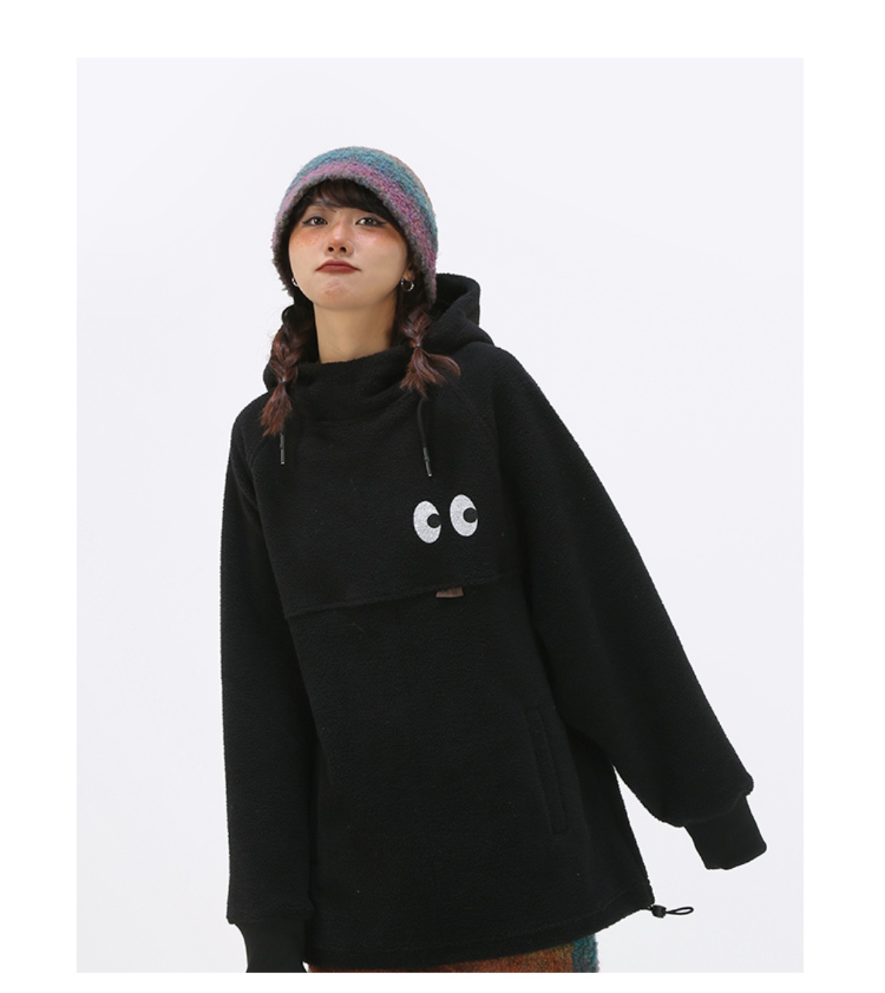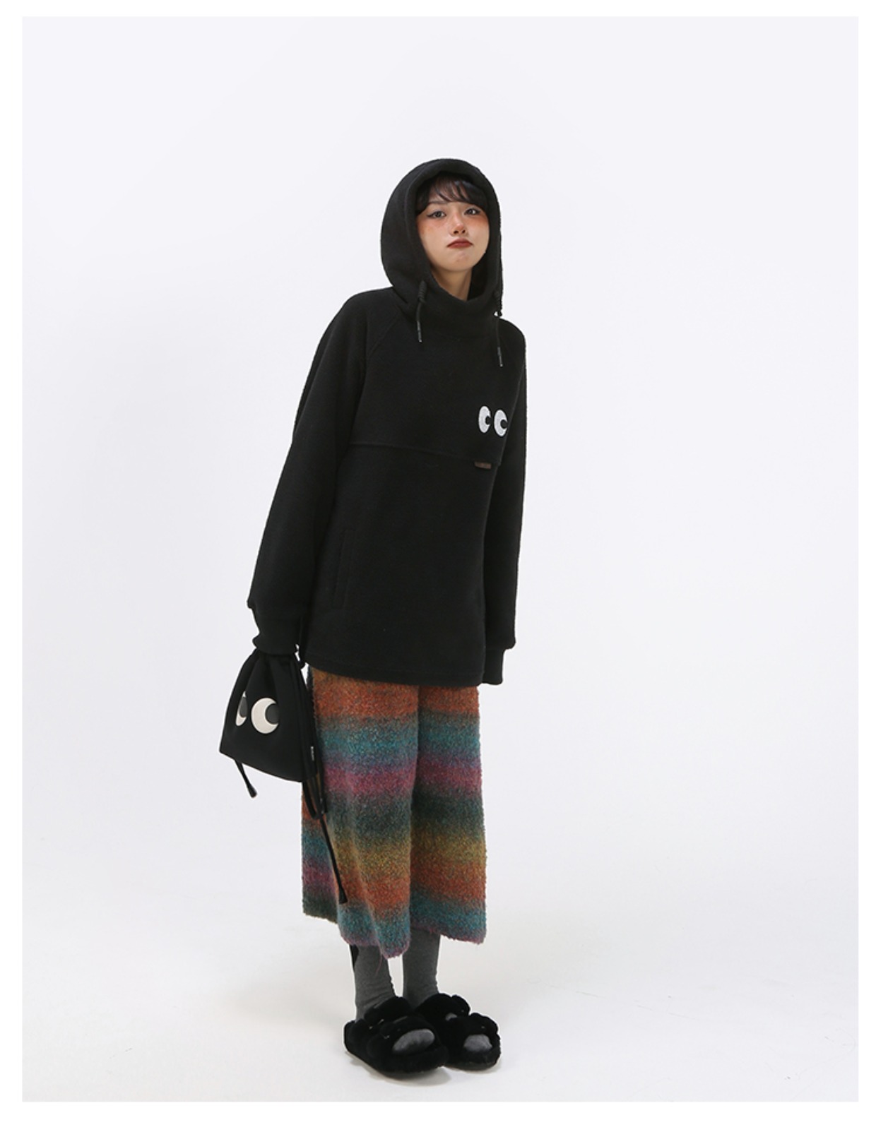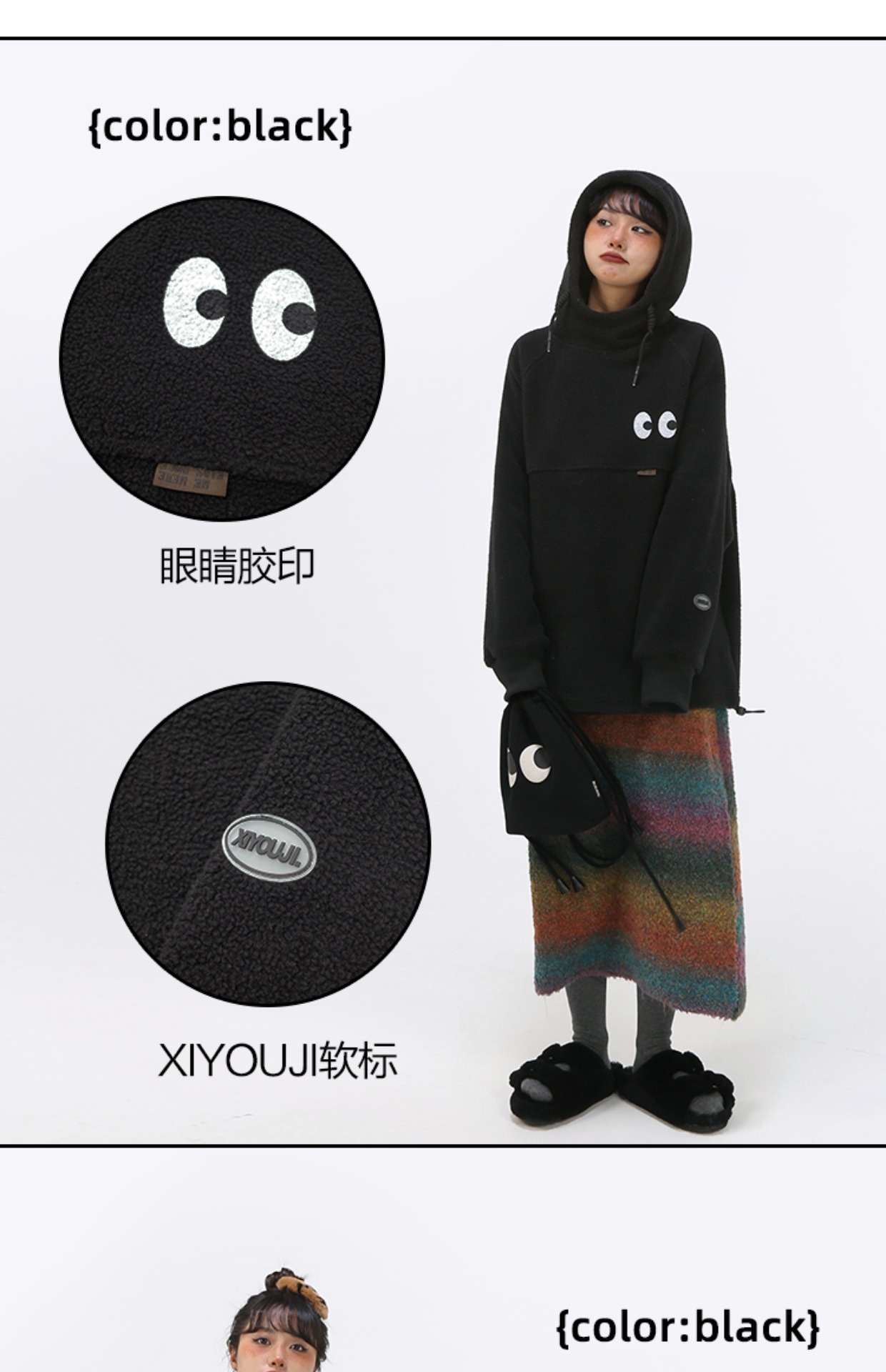 嬉遊記原創2023冬新款黑色寬鬆搖粒絨連帽運動衫女加絨保暖休閒上衣