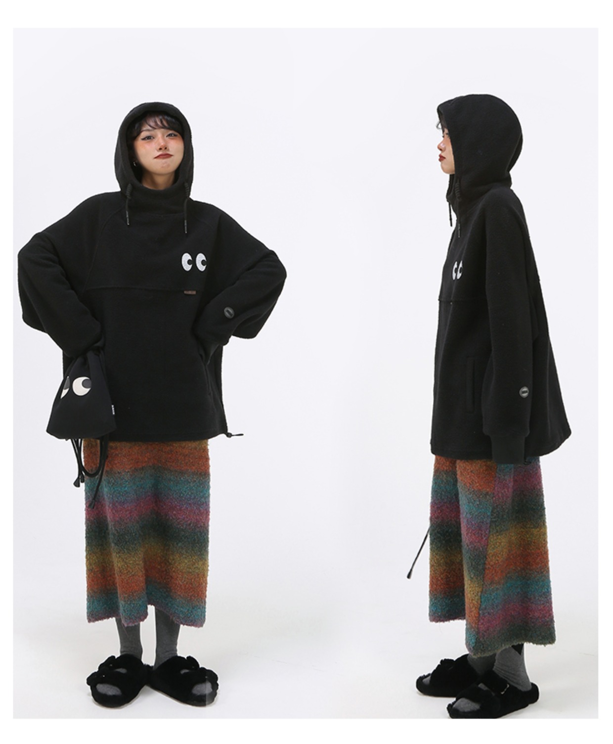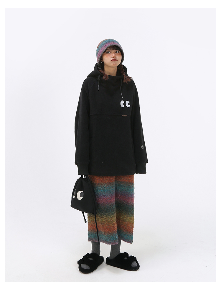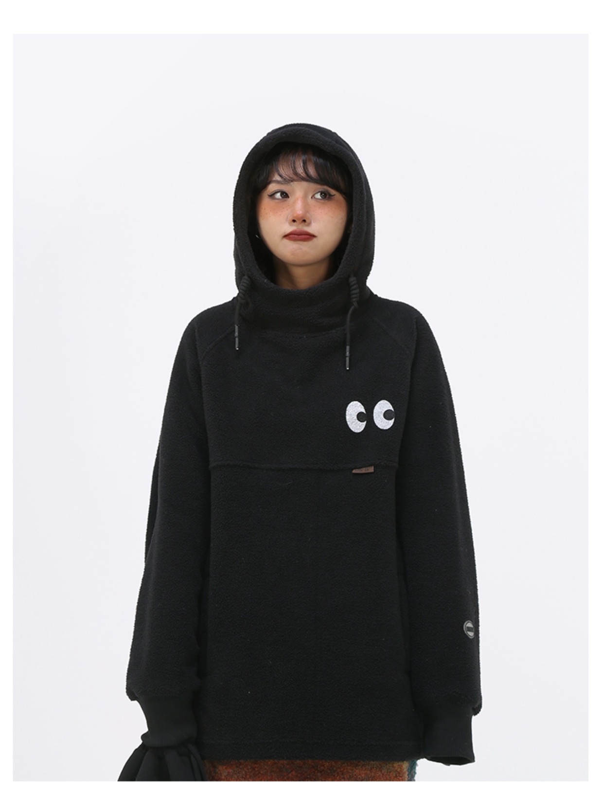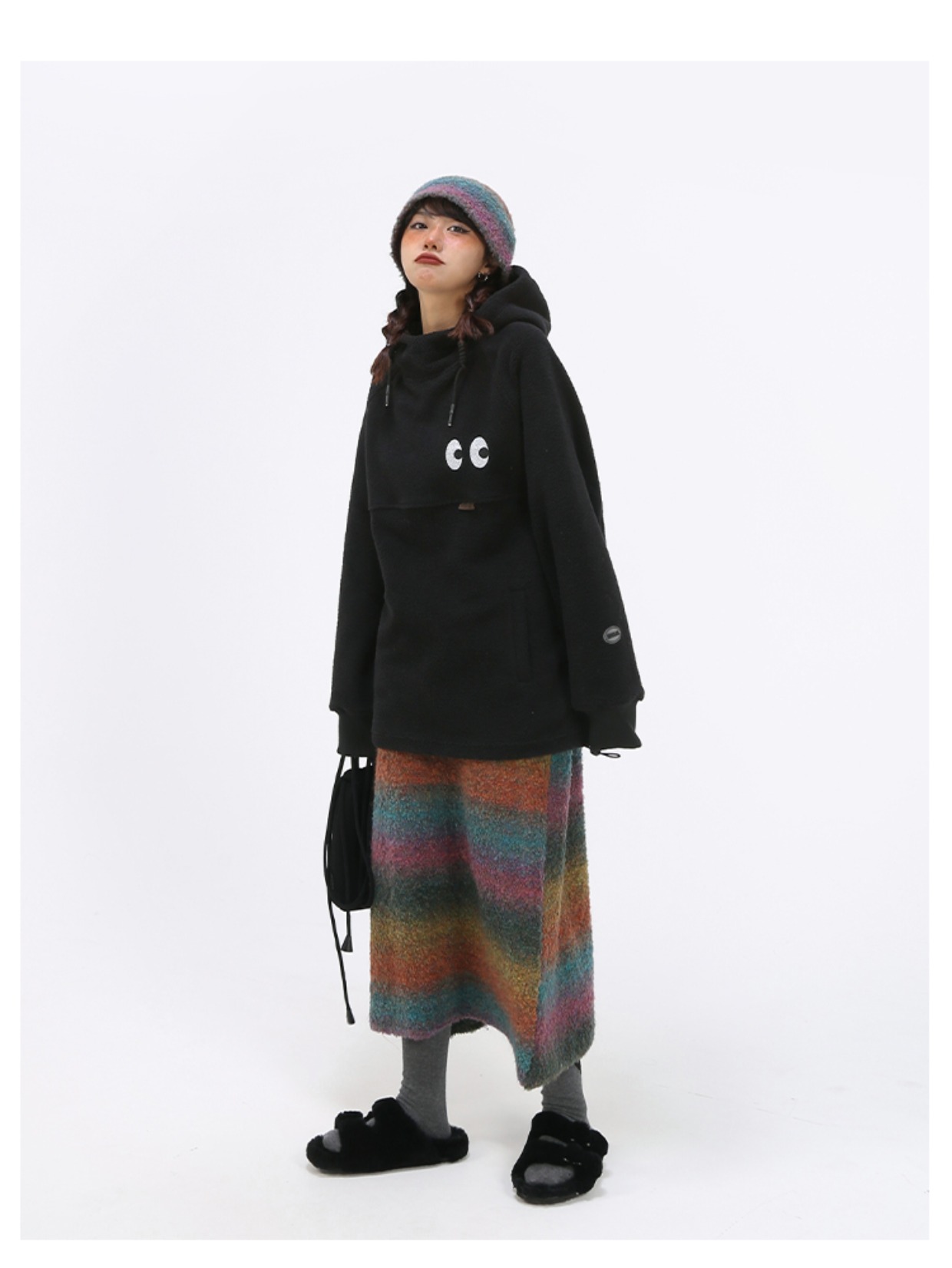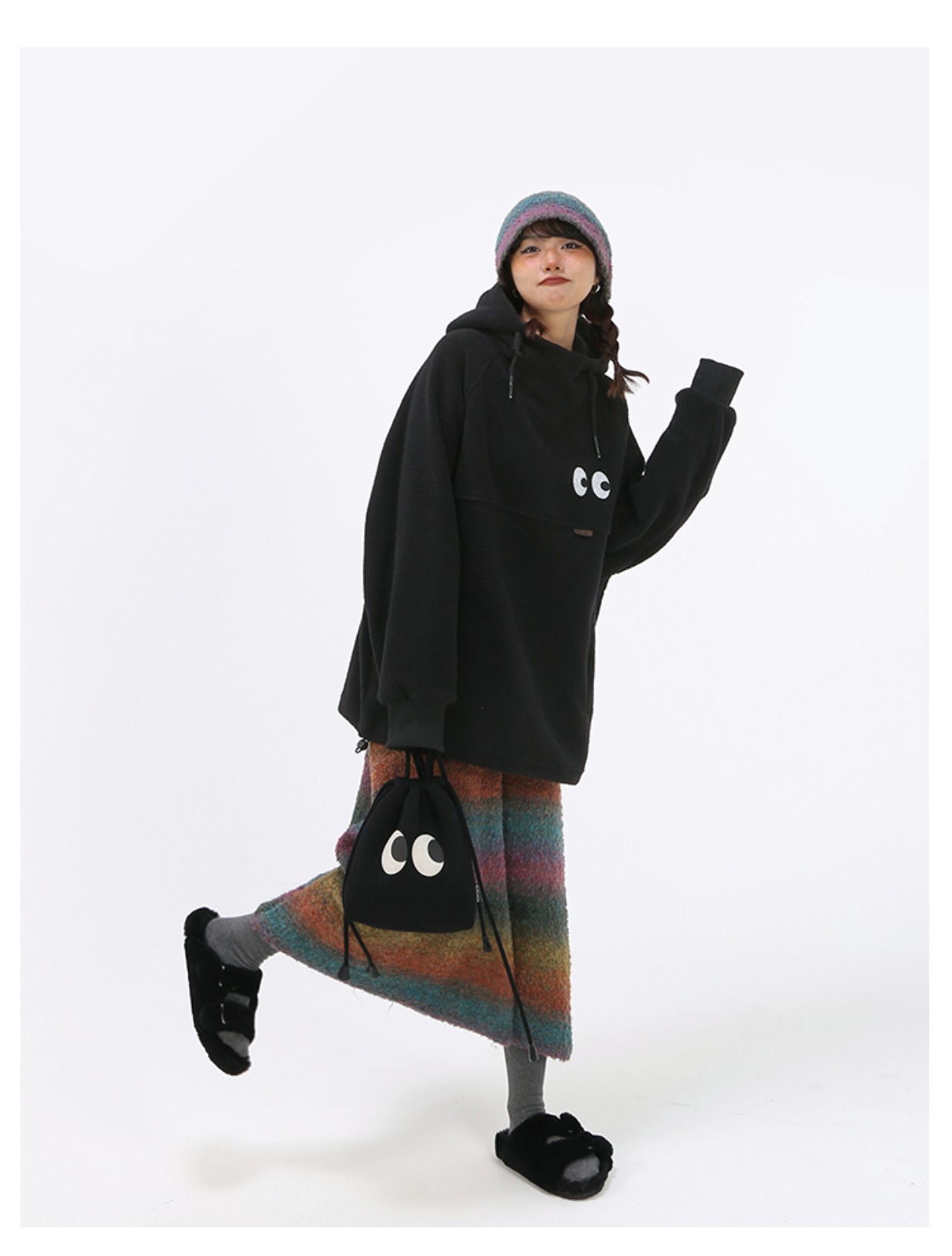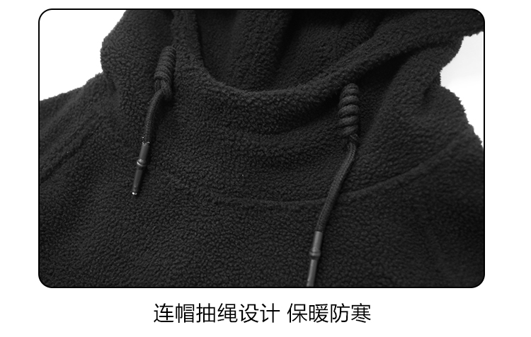 嬉遊記原創2023冬新款黑色寬鬆搖粒絨連帽運動衫女加絨保暖休閒上衣