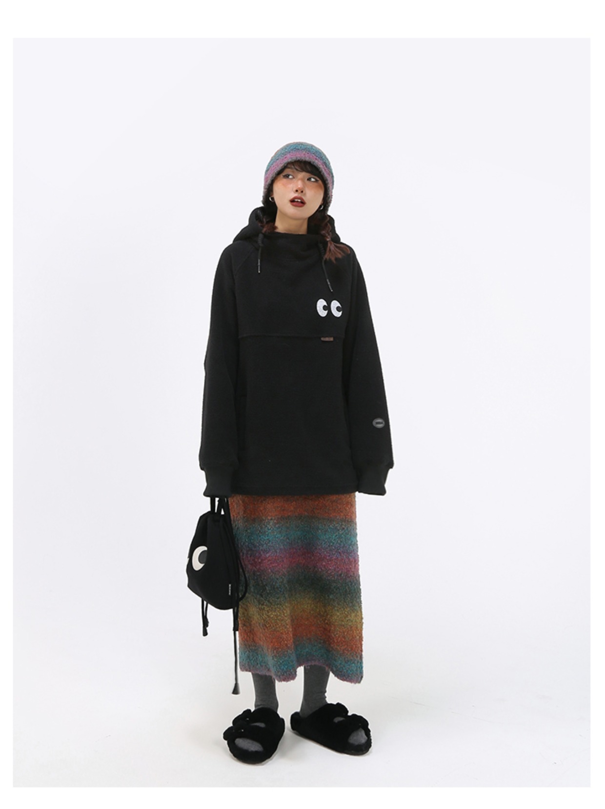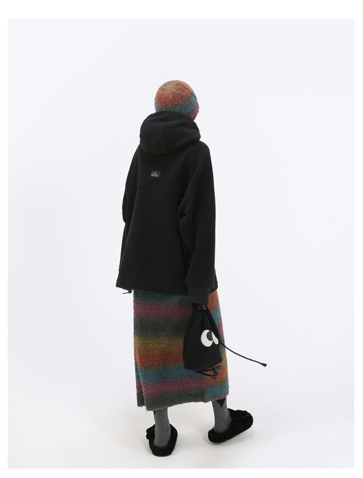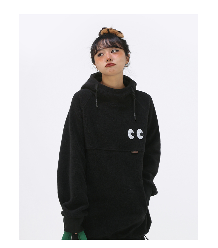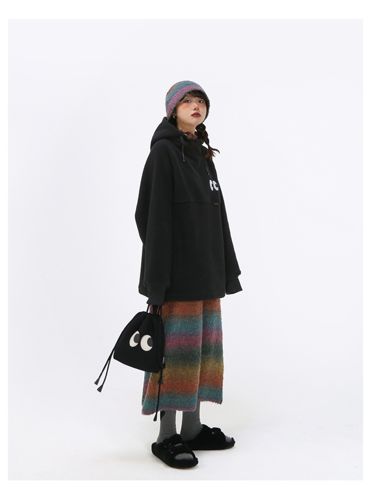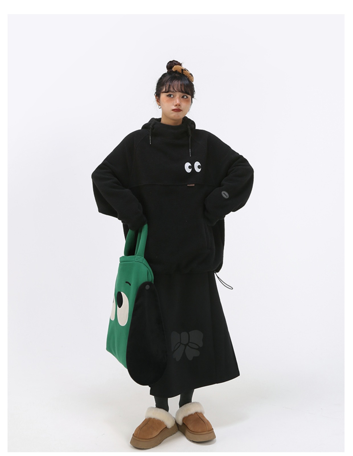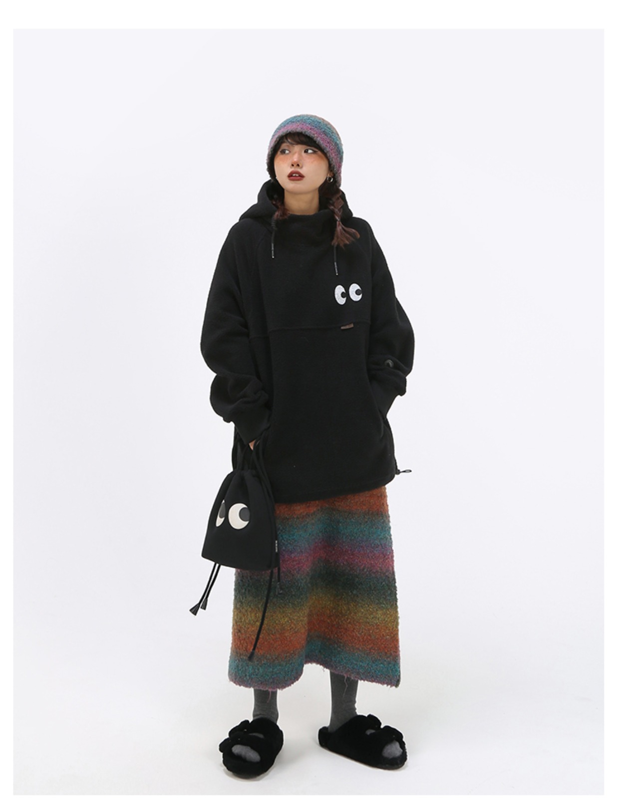 嬉遊記原創2023冬新款黑色寬鬆搖粒絨連帽運動衫女加絨保暖休閒上衣