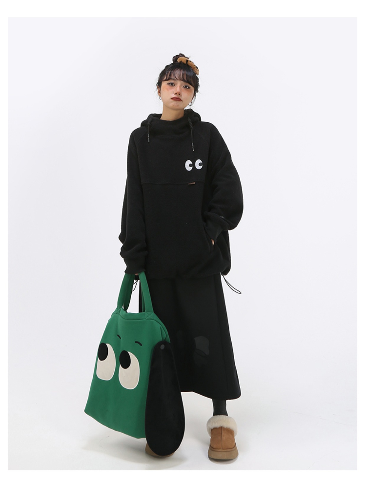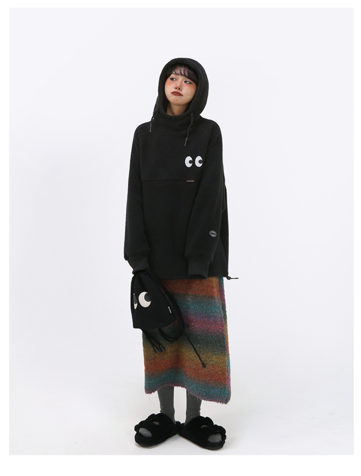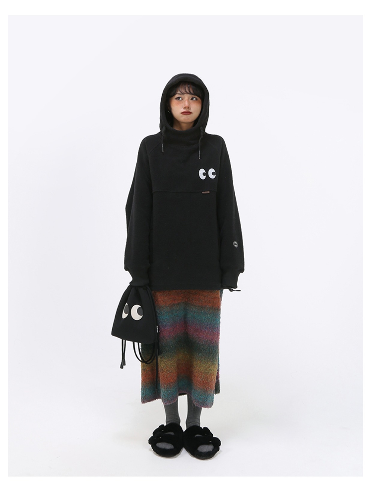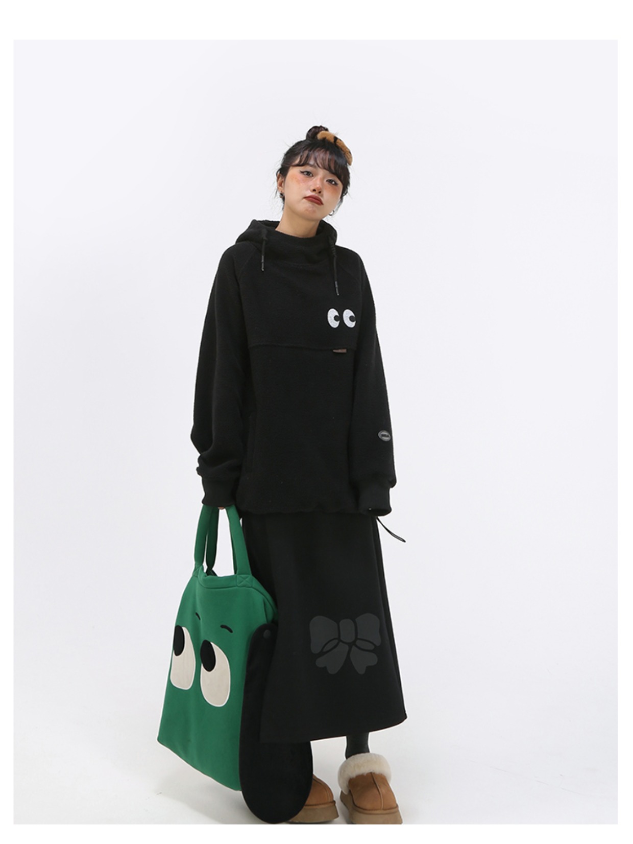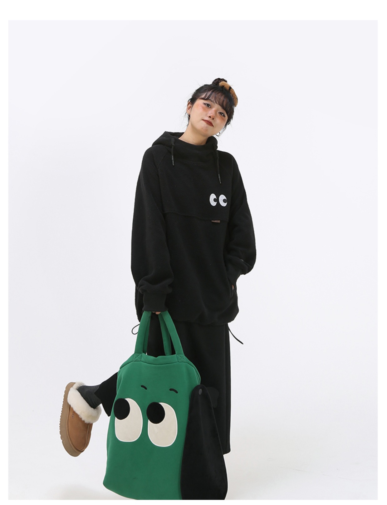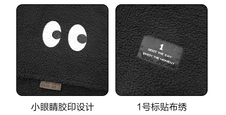 嬉遊記原創2023冬新款黑色寬鬆搖粒絨連帽運動衫女加絨保暖休閒上衣