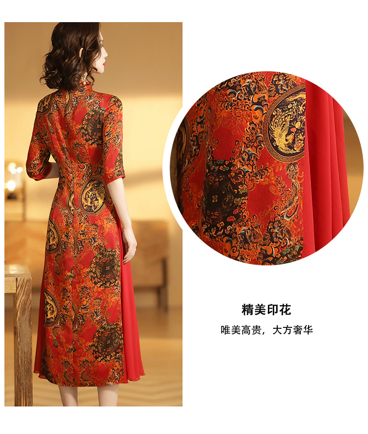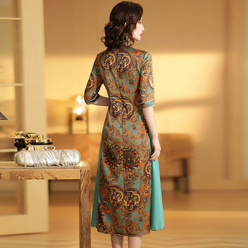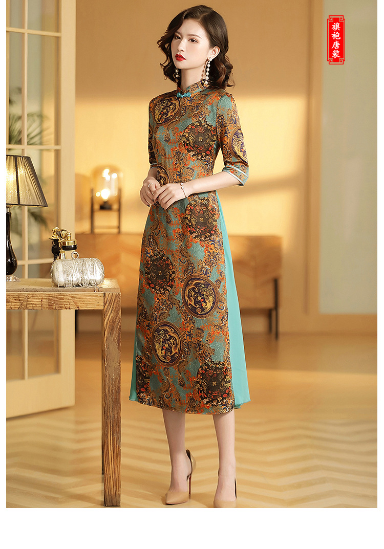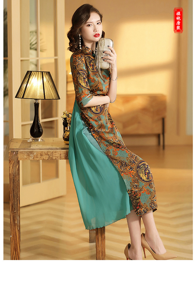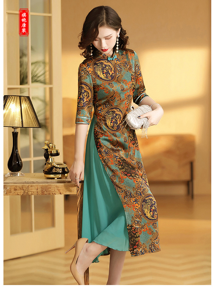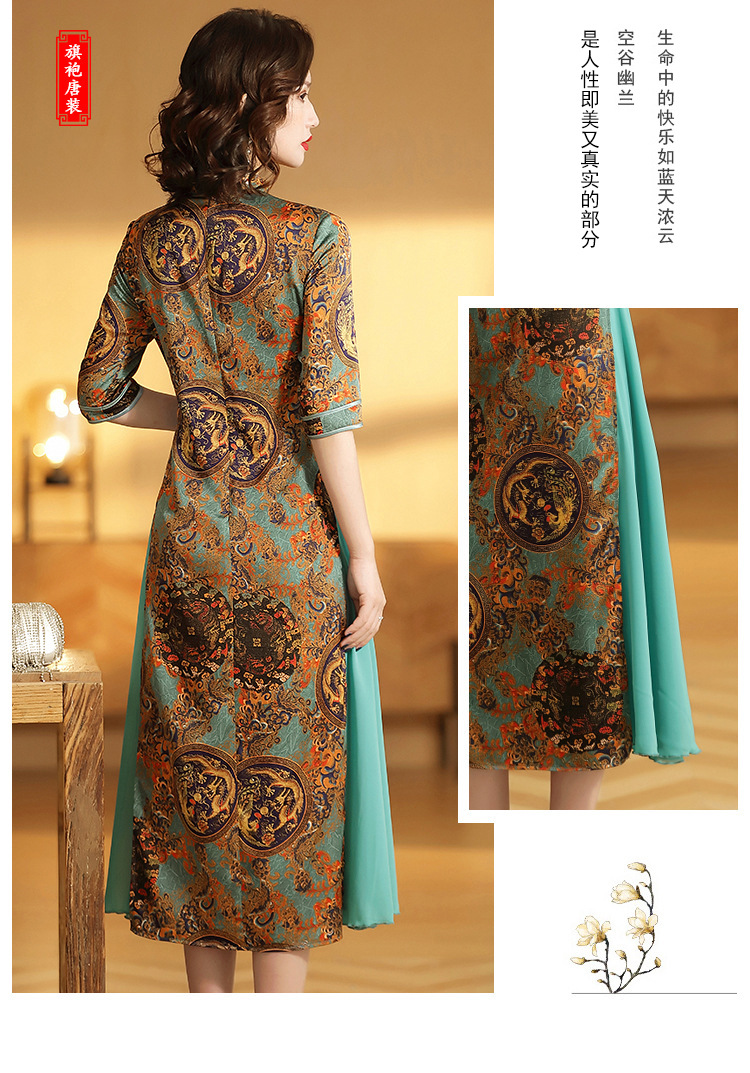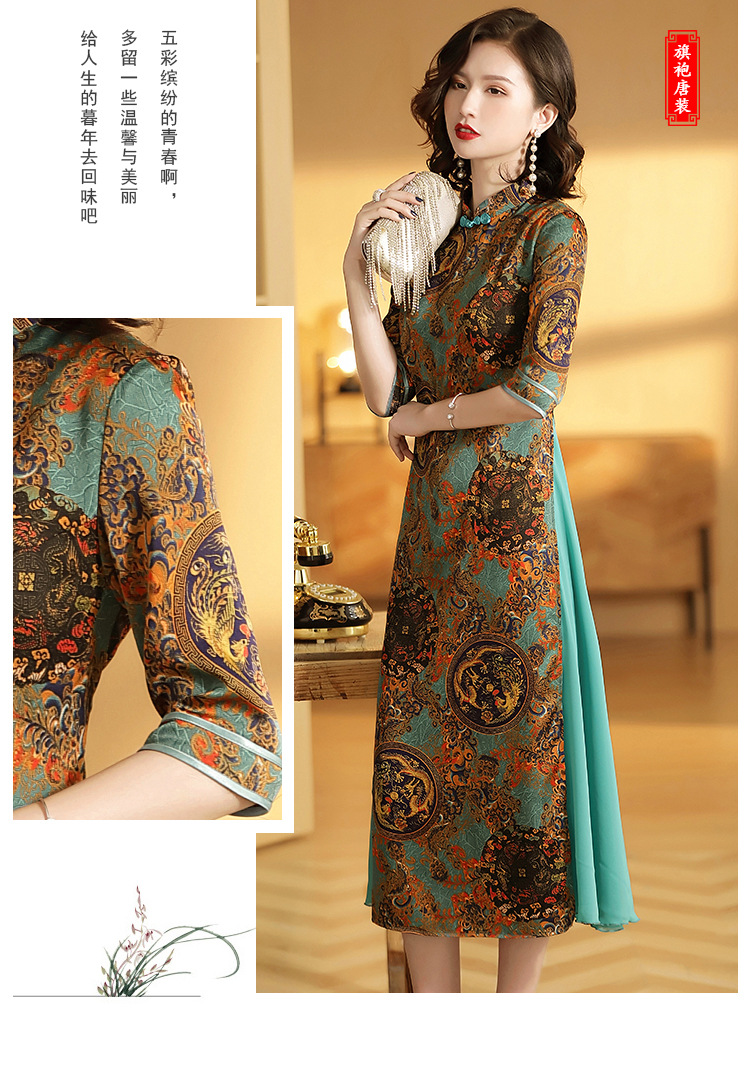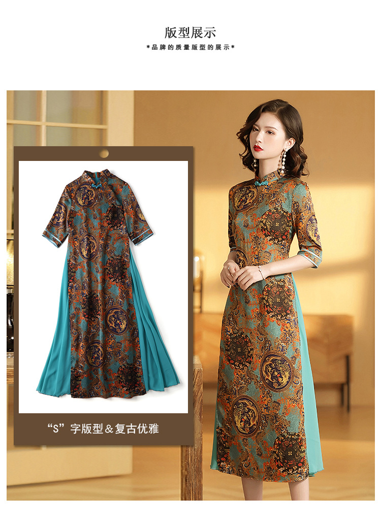 时尚高档印花拼接中袖连衣裙秋季复古民国风修身时装改良长旗袍裙