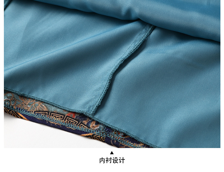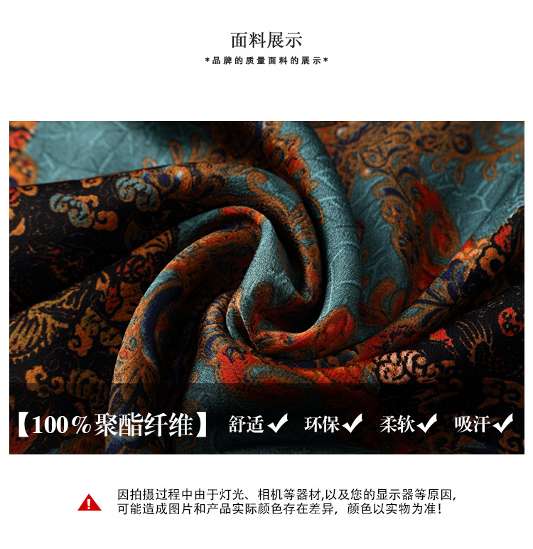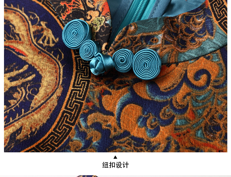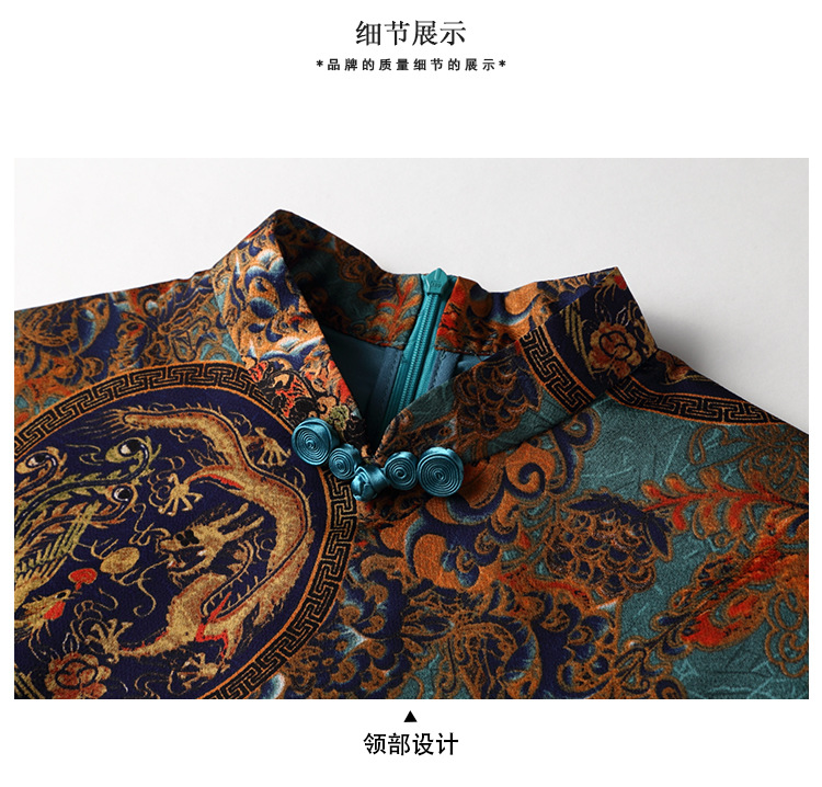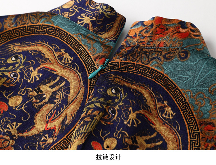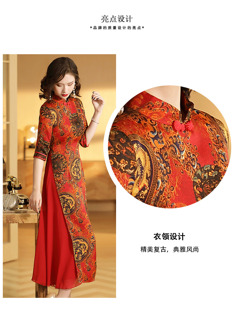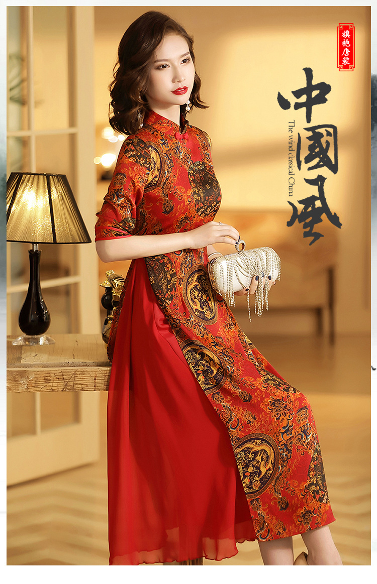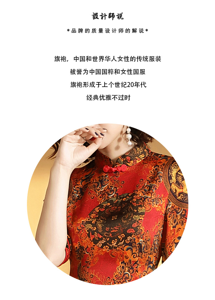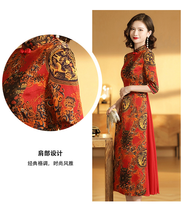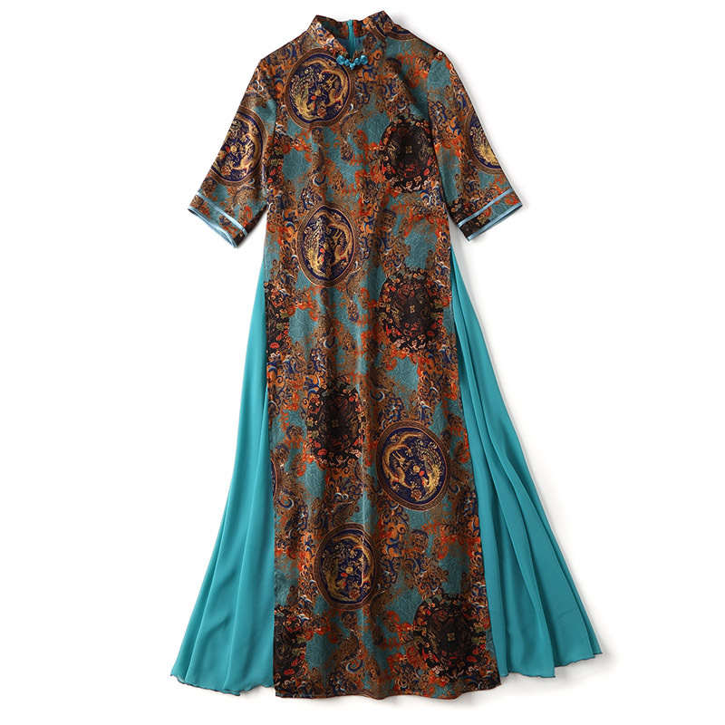 时尚高档印花拼接中袖连衣裙秋季复古民国风修身时装改良长旗袍裙