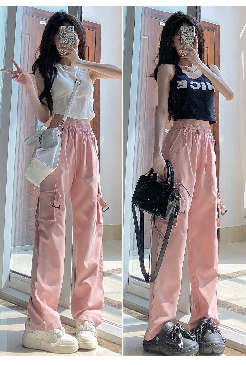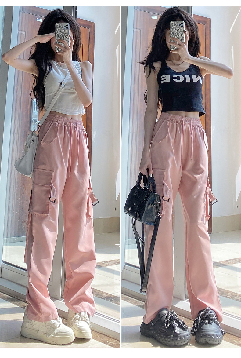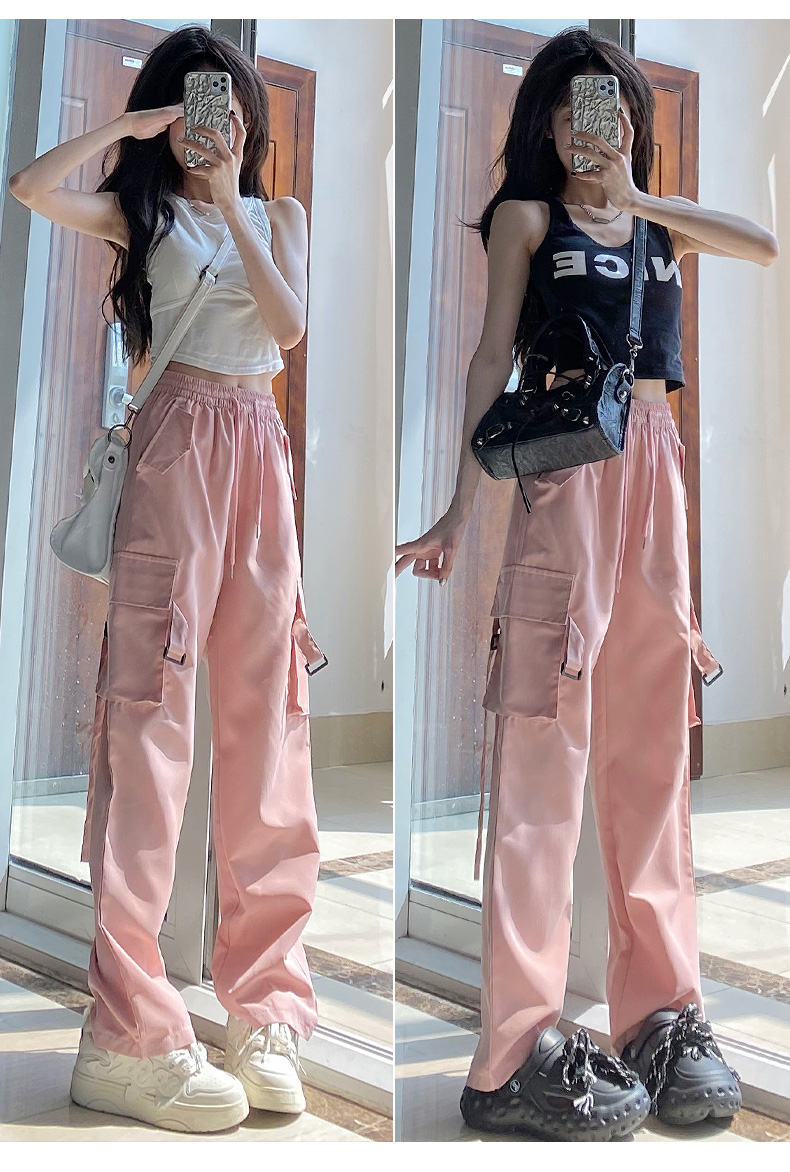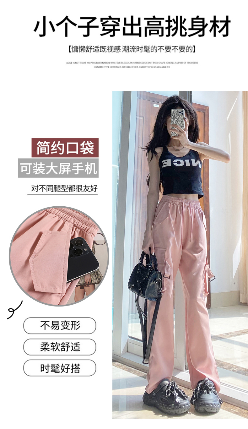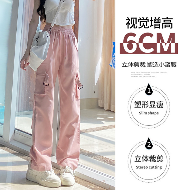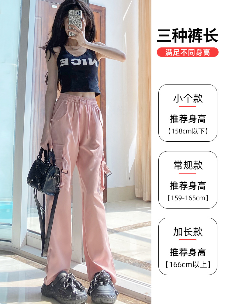 粉色工裝褲女春秋2023新款高腰顯瘦垂感闊腿窄版休閒美式速乾運動