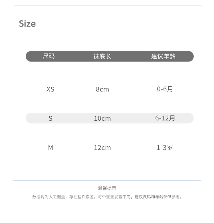 童袜尺码 XS码0-6个月,S码6-12个月,M码1-3岁