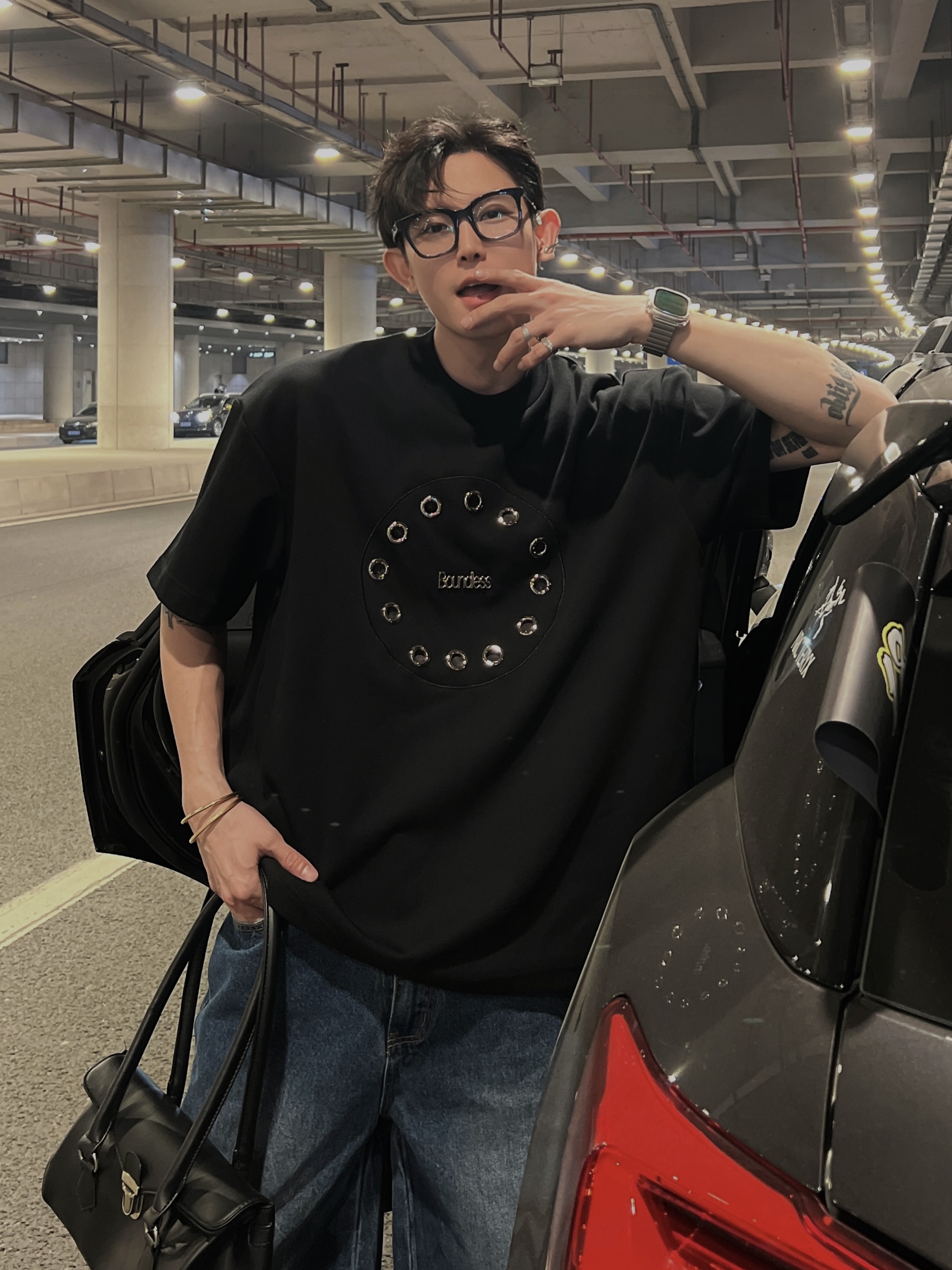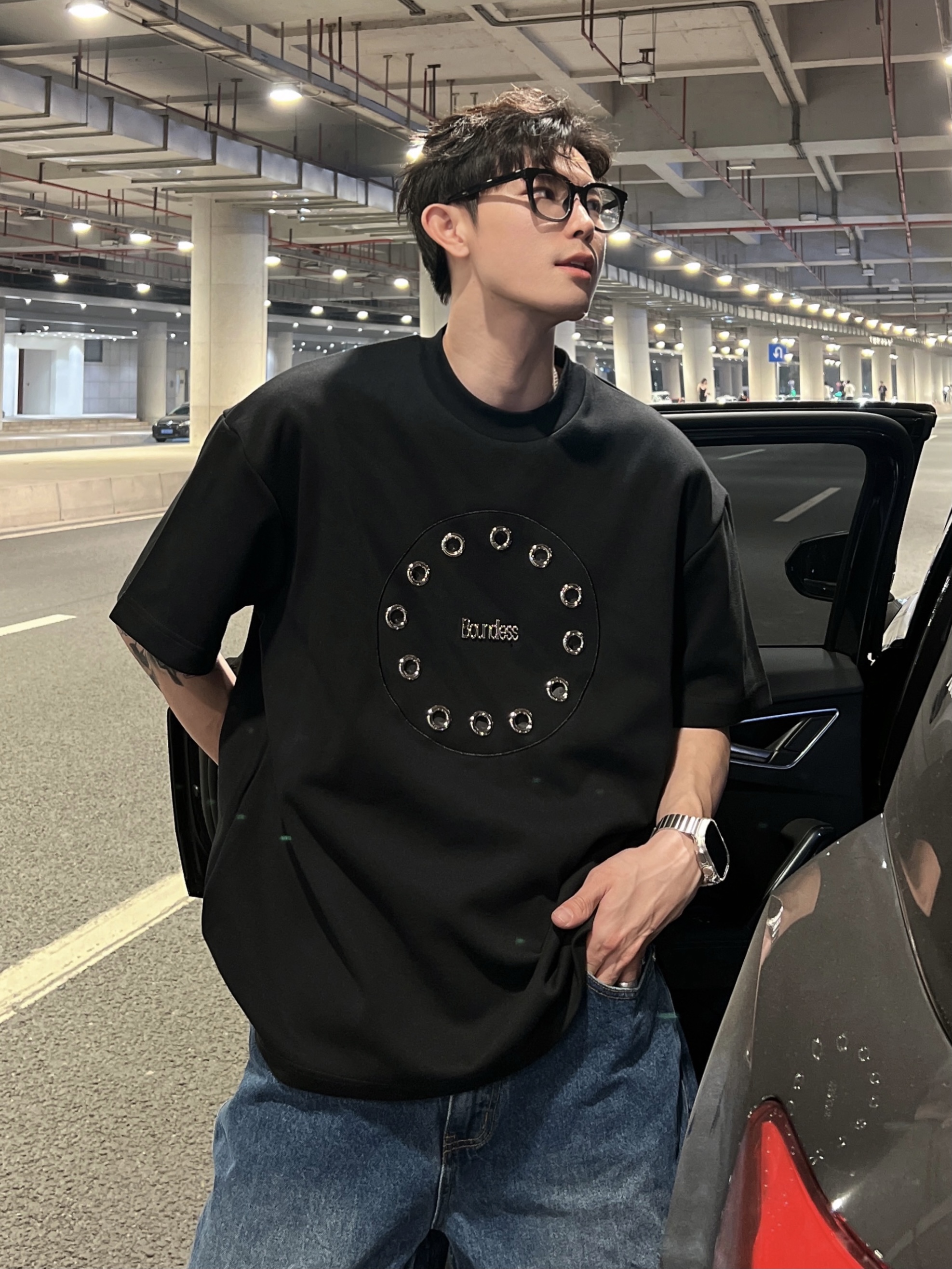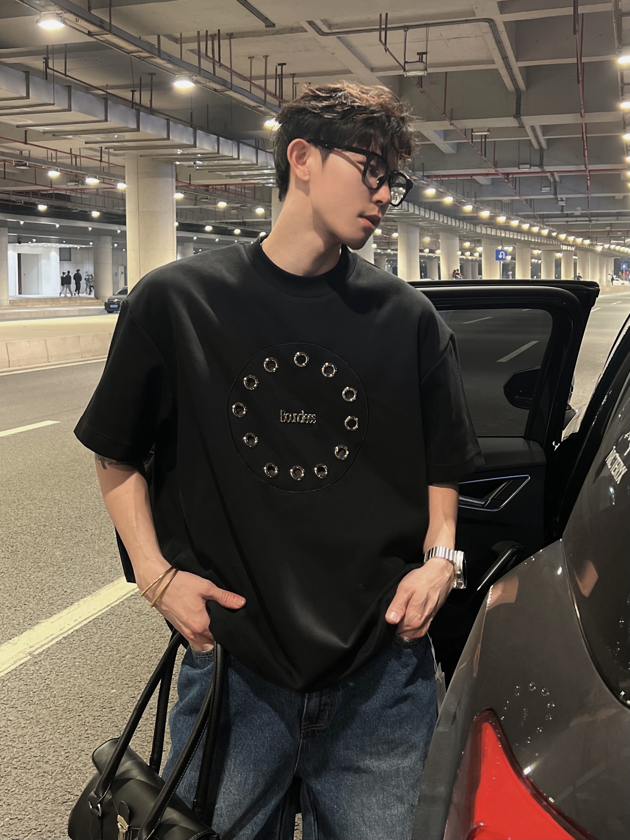 THREE23SS夏季原創小眾高級感金屬圓環設計感短袖T恤百搭上衣潮酷