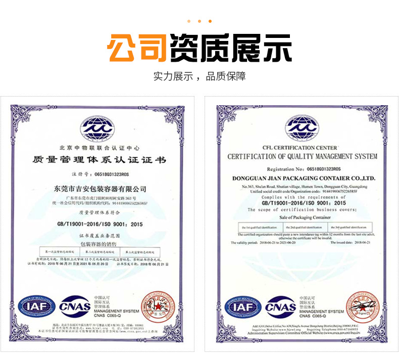东莞市吉安包装容器有限公司创立于2000年8月1日,是中国知名品牌企业。已通过ISO 9001质量管理体系资质认证,加入了中国中空协会,并获得《中国知名品牌》,《质量检验·国家标准合格产品》等荣誉称号。根据材质的不同,我们的产品分为塑料容器、铁质容器、铝材容器、玻璃容器、纸质容器等五大类。按产品的名称分为塑料桶、塑料瓶、包装桶、涂料桶、机油桶、油脂桶、化工罐、胶水瓶、铁桶、铁罐、铝瓶、铝罐、阻隔瓶、 高阻隔瓶等,容量从3ML至1000L多种规格,多种款式。适合包装的产品包括:化学试剂、化工原料、化工助剂、饲料添加剂、油墨、油漆、树脂农药、日用化学品、聚氨脂、胶粘剂,广泛应用于化工、建筑、食品、医疗、生物等各领域。