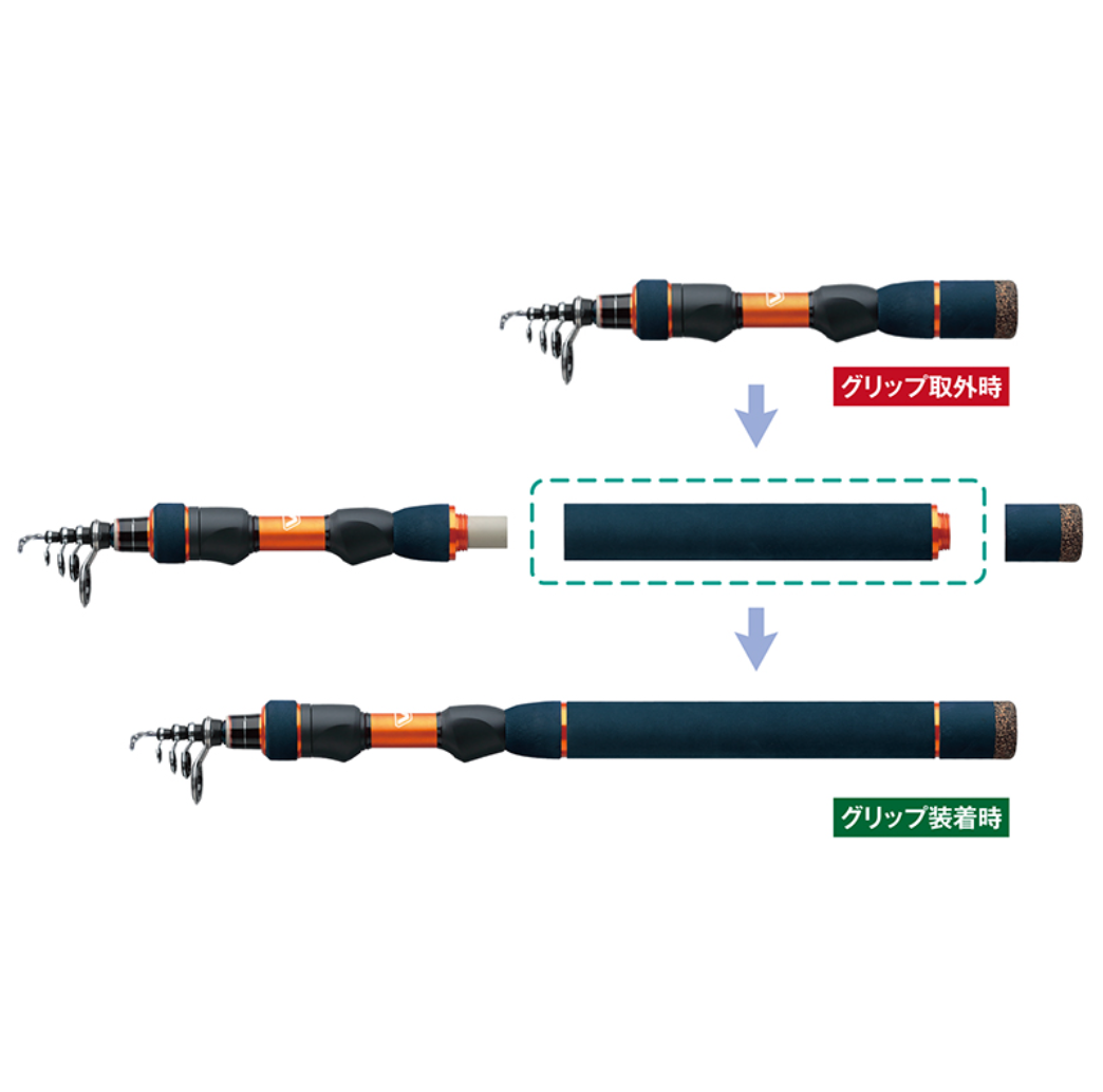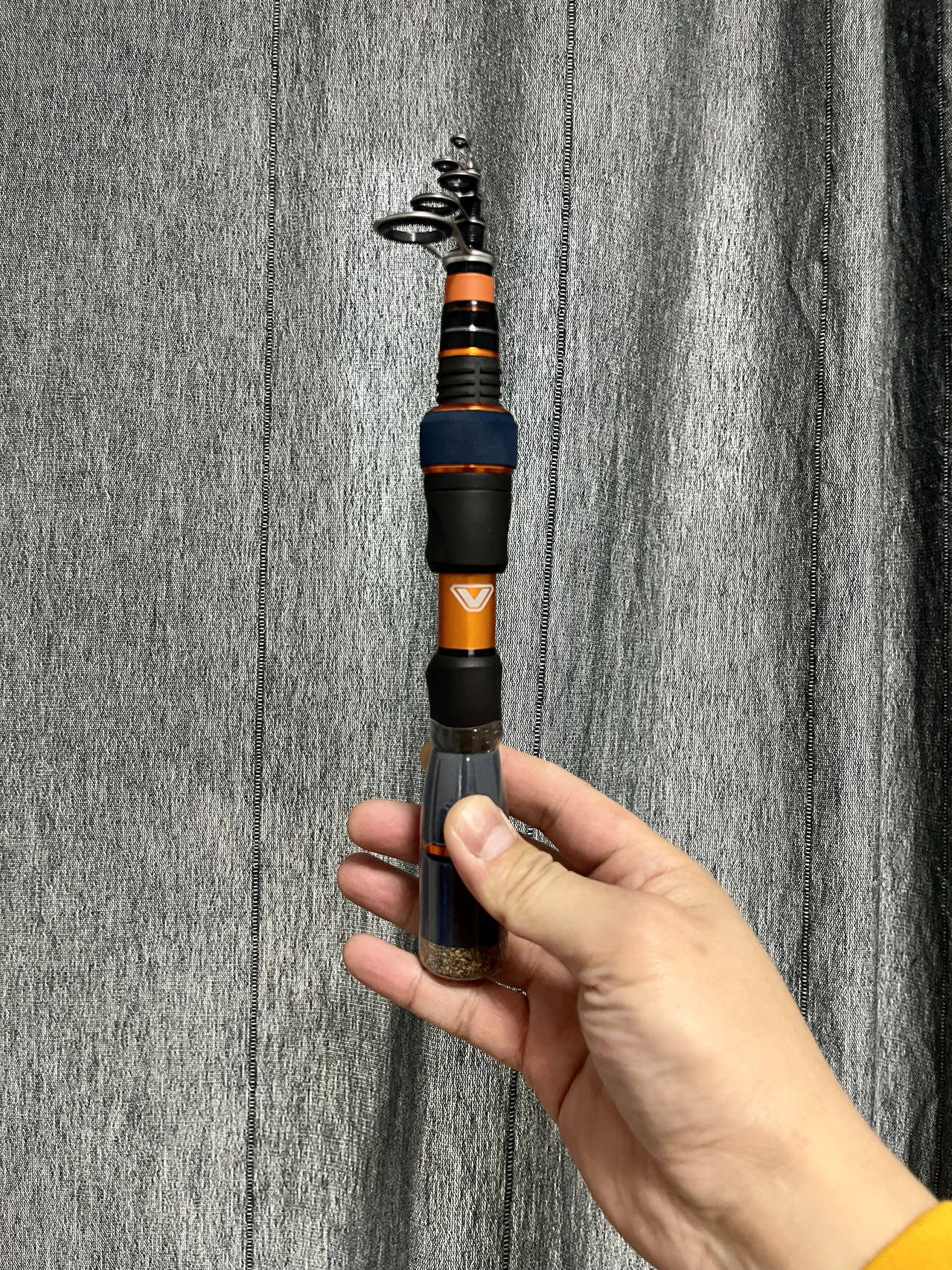 鱼竿收拢尺寸24cm,展开后164cm,加上随鱼竿附赠的延长把手,总长度可达181cm。无延长把手时单手操作便携灵敏,加上延长把手回鱼更稳,可以双手远投。