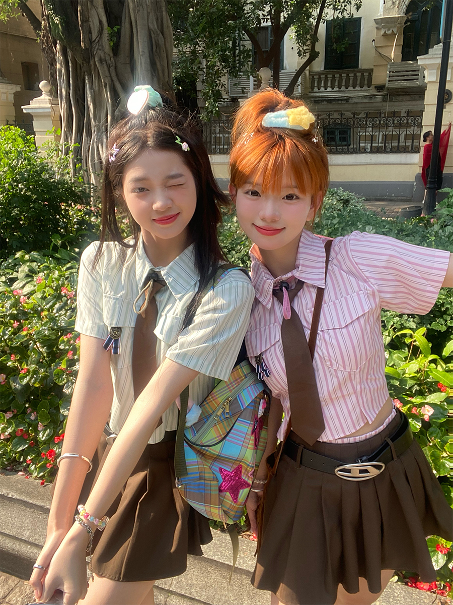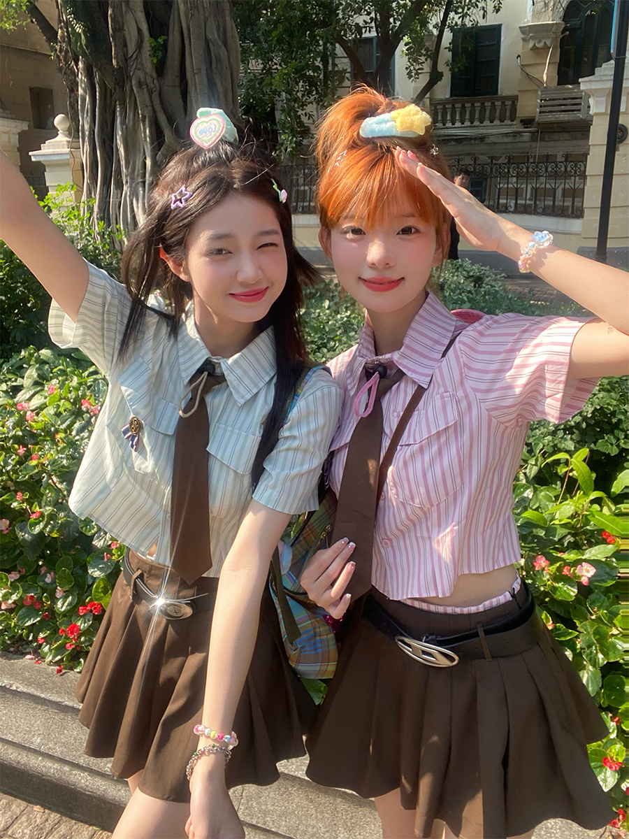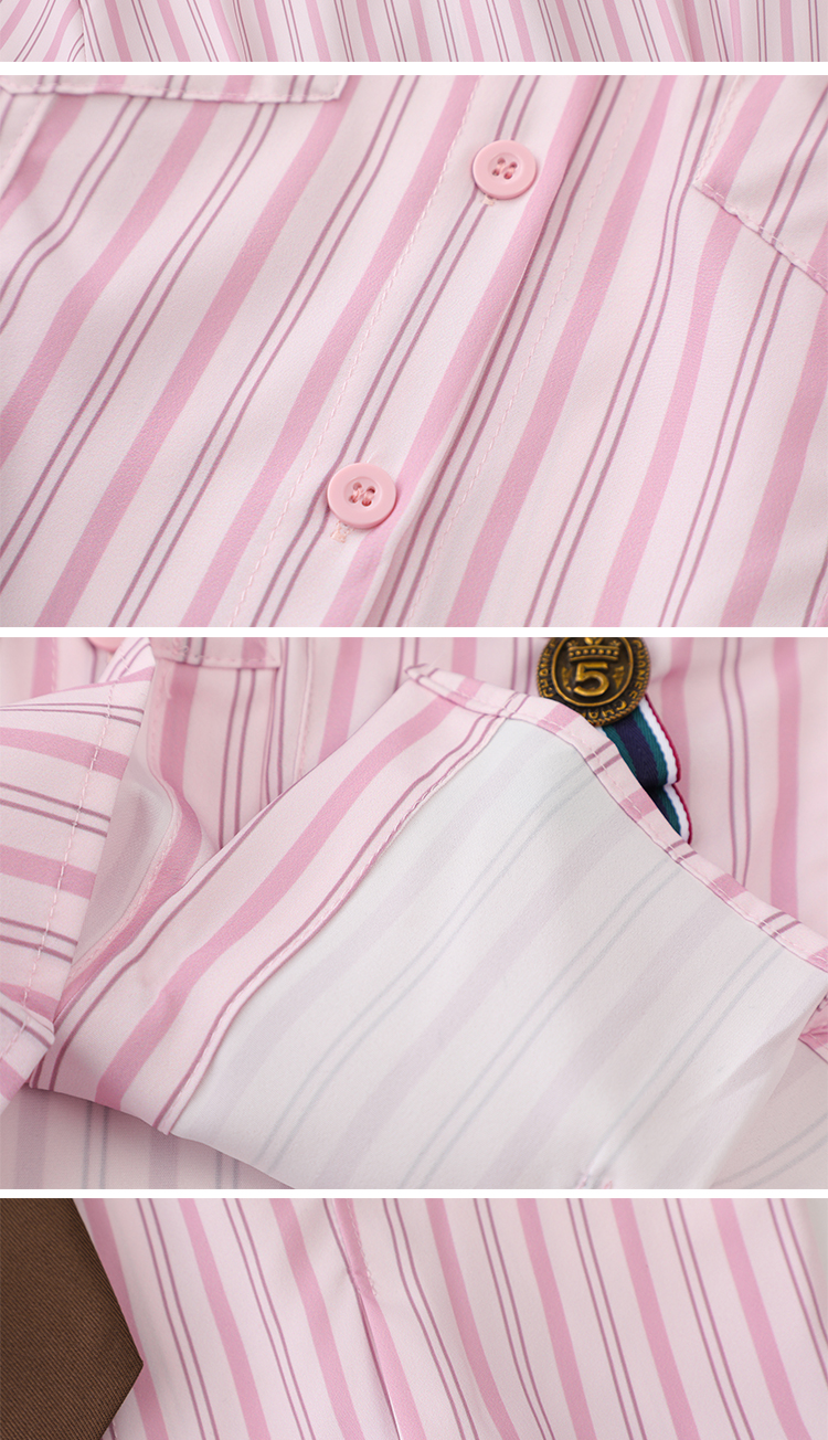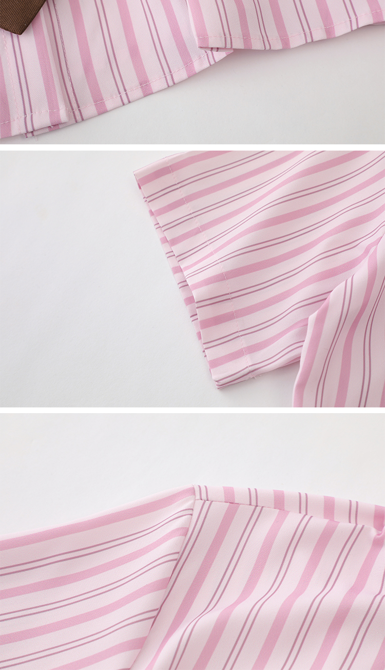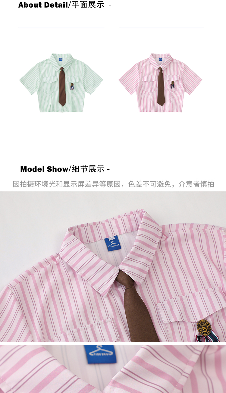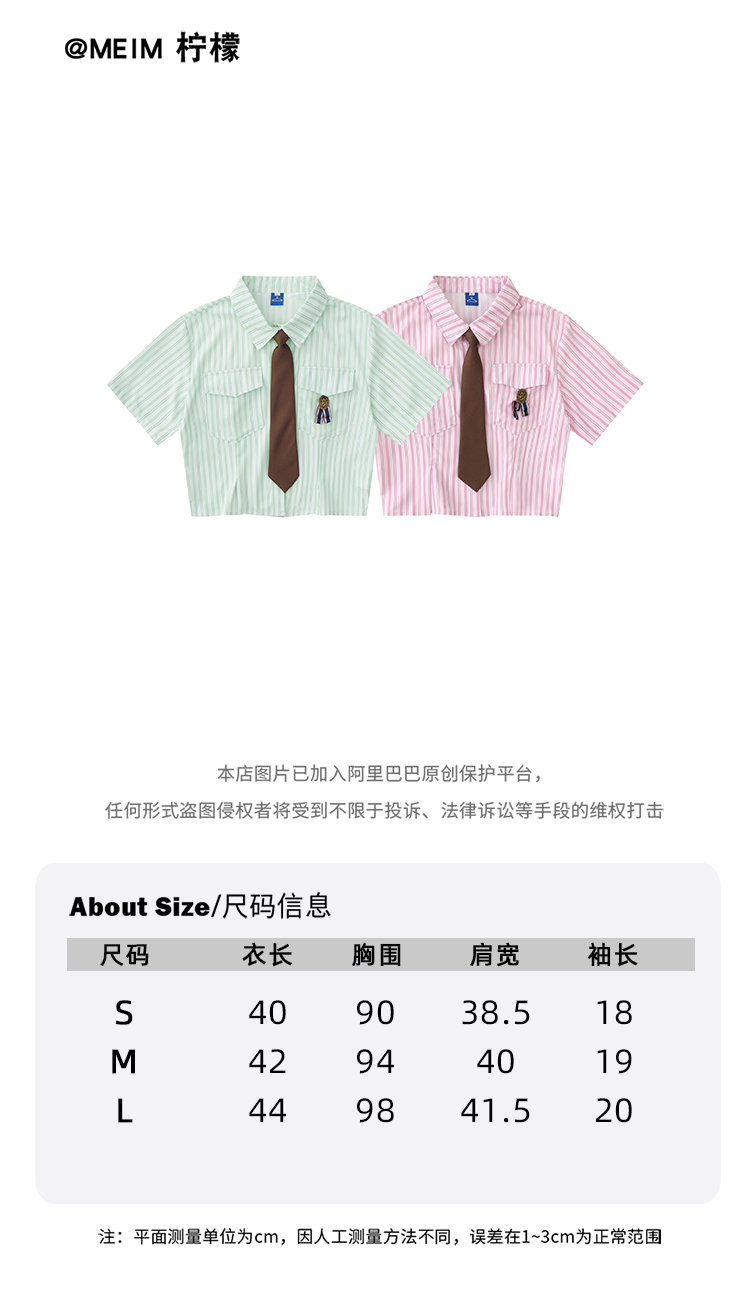 MEIM檸檬學院風豎條紋小清新襯衫上衣夏季日系甜美領帶短款上衣潮