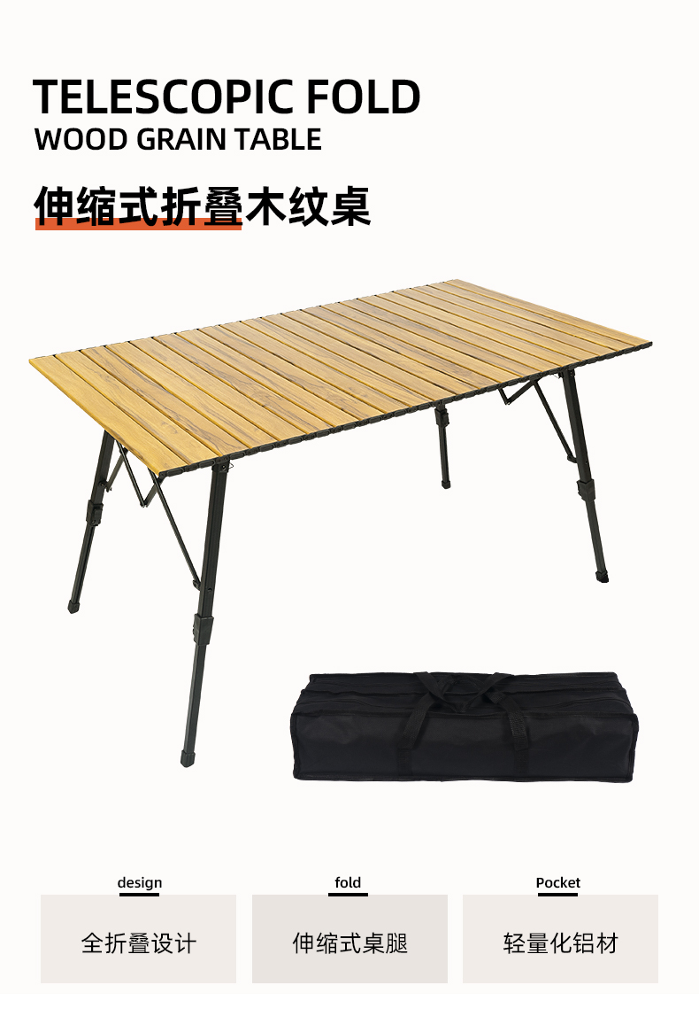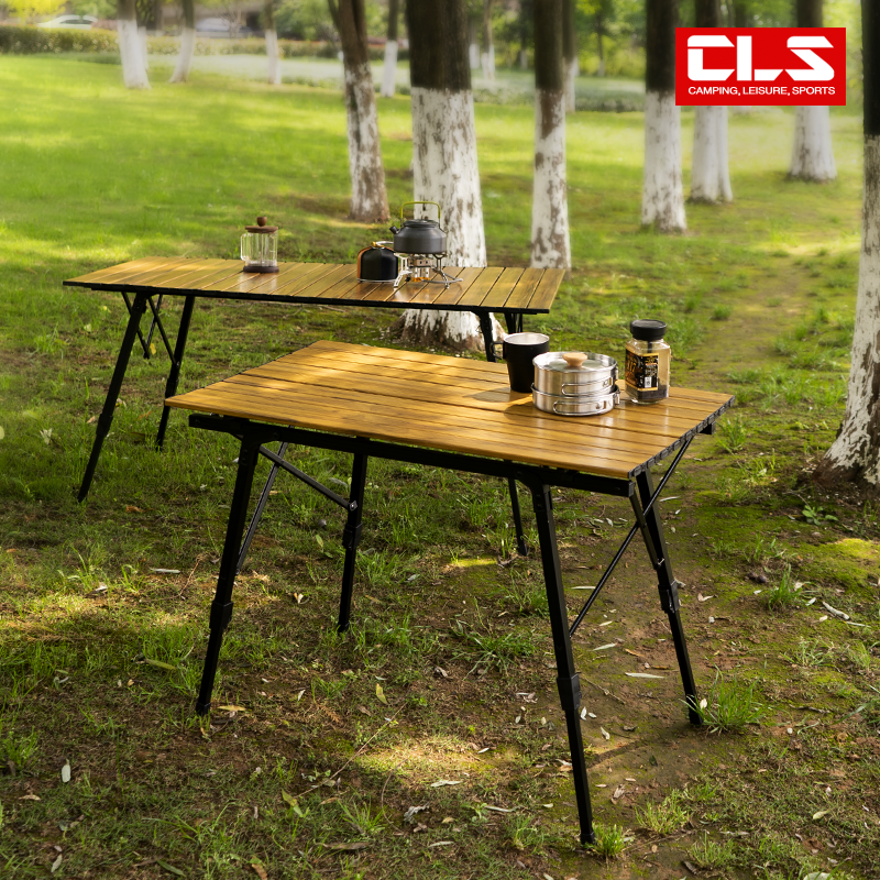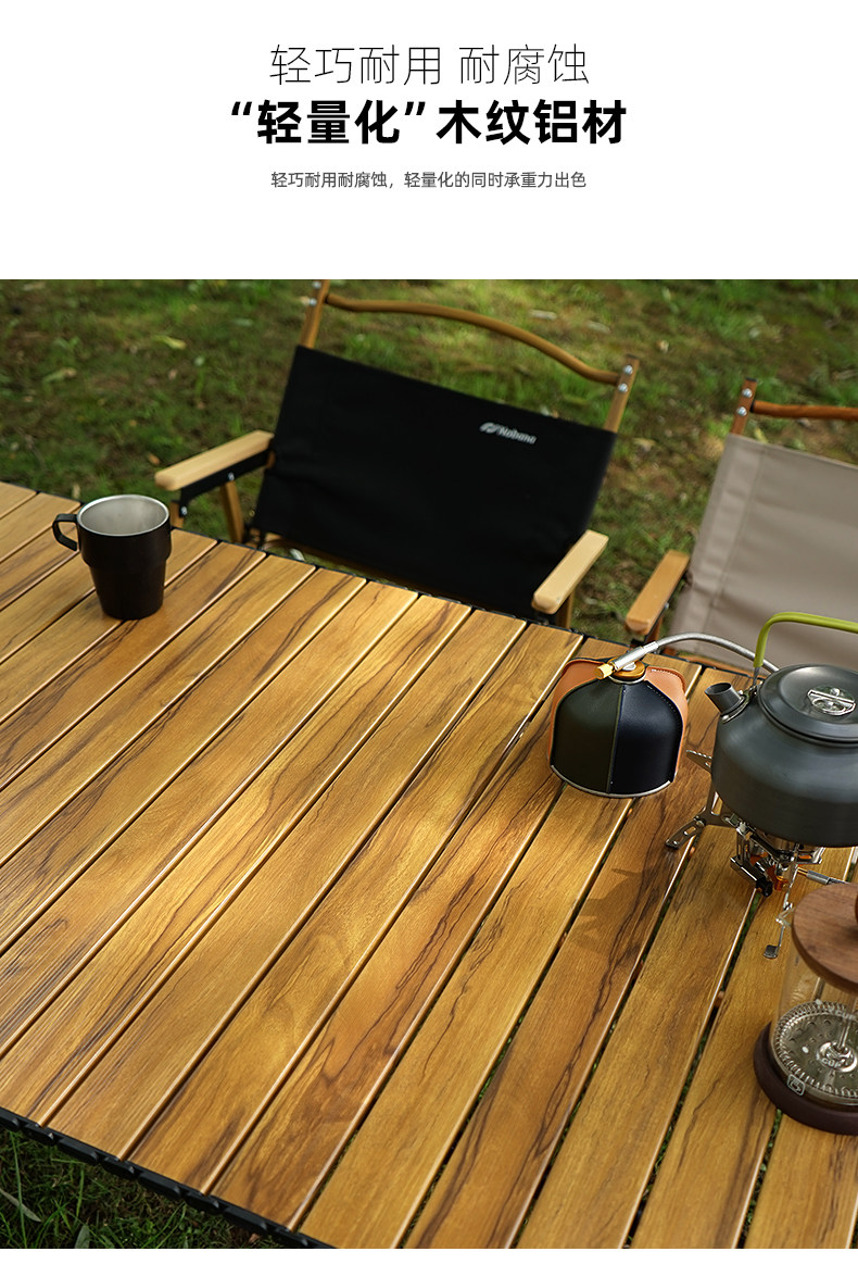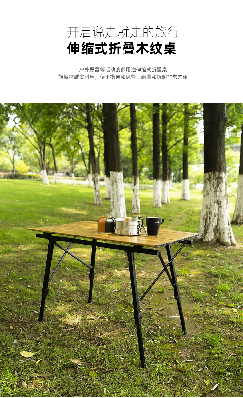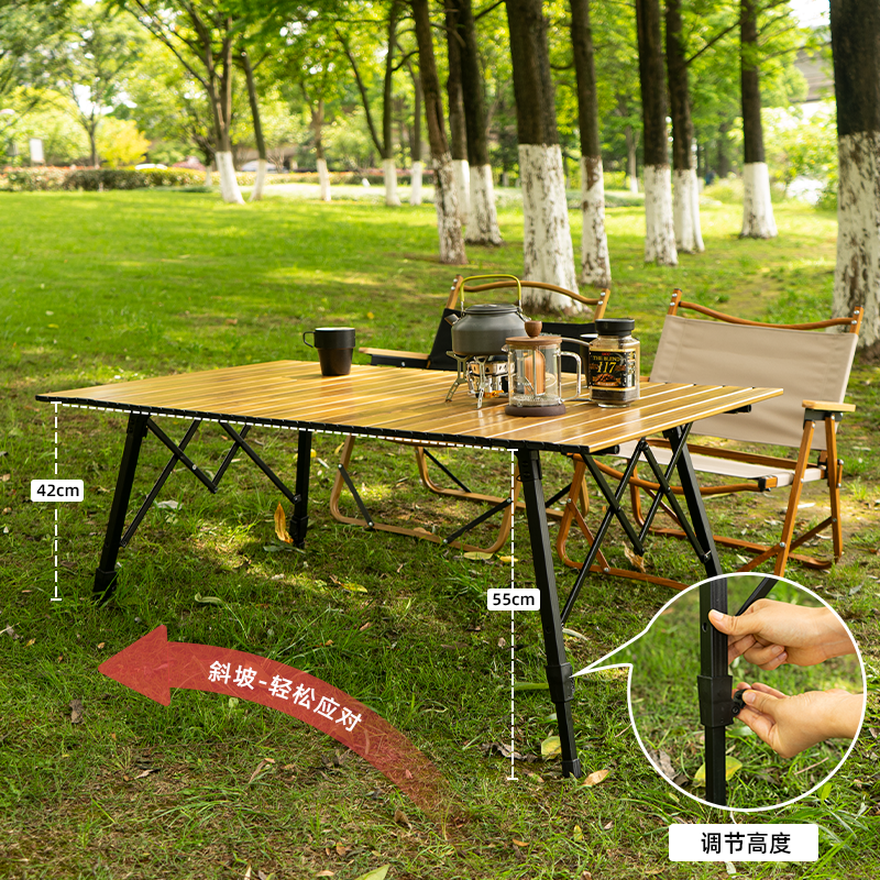 戶外野營摺疊桌木紋鋁合金蛋卷桌野餐燒烤桌可攜式可升降車載鋁板桌
