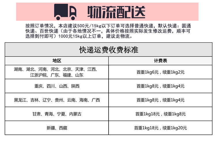 我们默认圆通和百事快递,由于各地情况不一,具体以实际发送修改运费,顺丰可选择到付,当天下午17:00前的订单,我们尽量当天给您发货,当天发不完的次日发货。