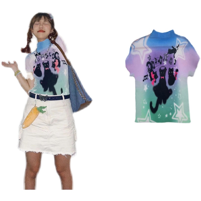 Bean Soup/豆湯 彩色塗鴉褶皺辣妹上衣女夏季多巴胺氛圍感顯瘦T恤