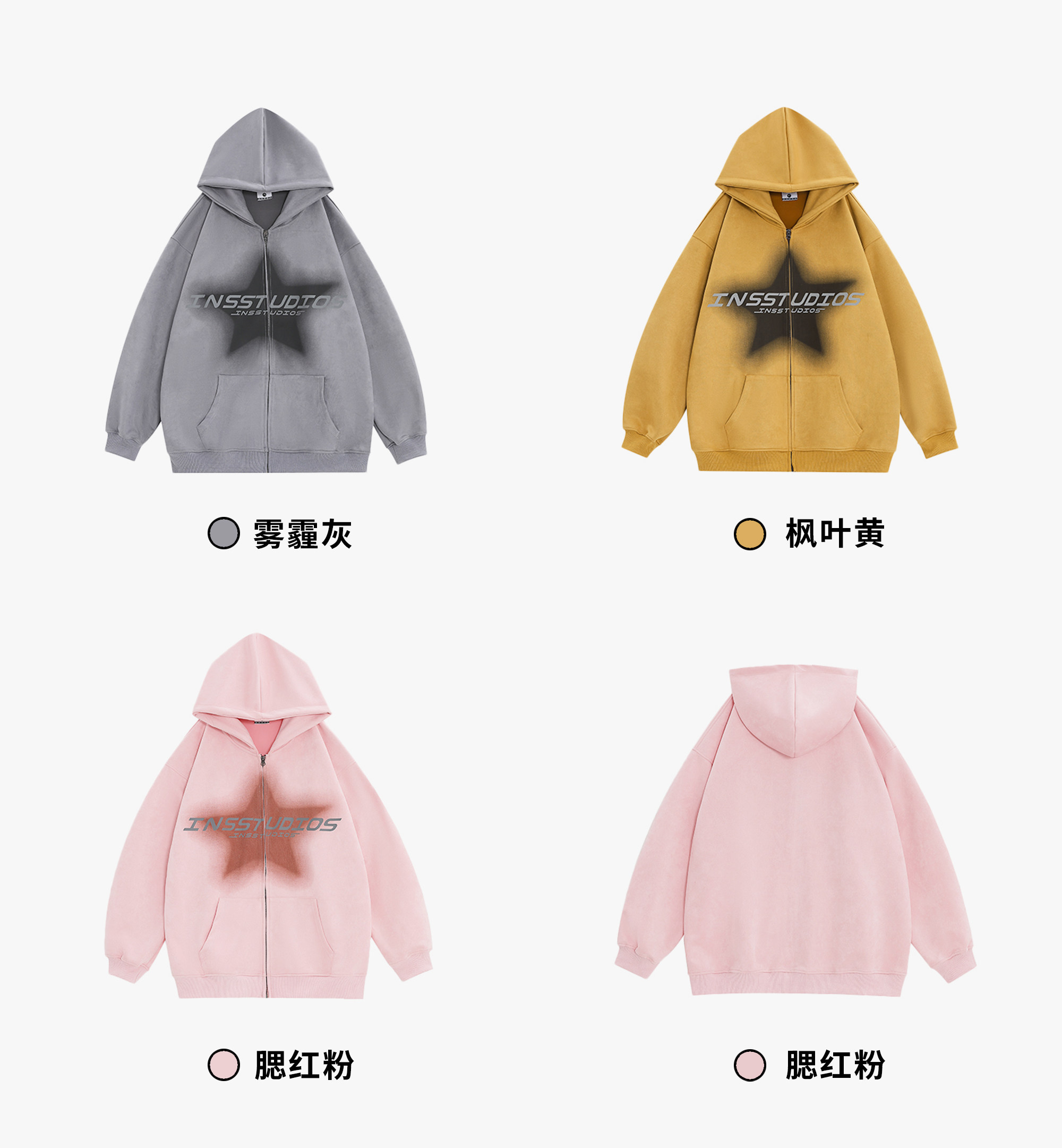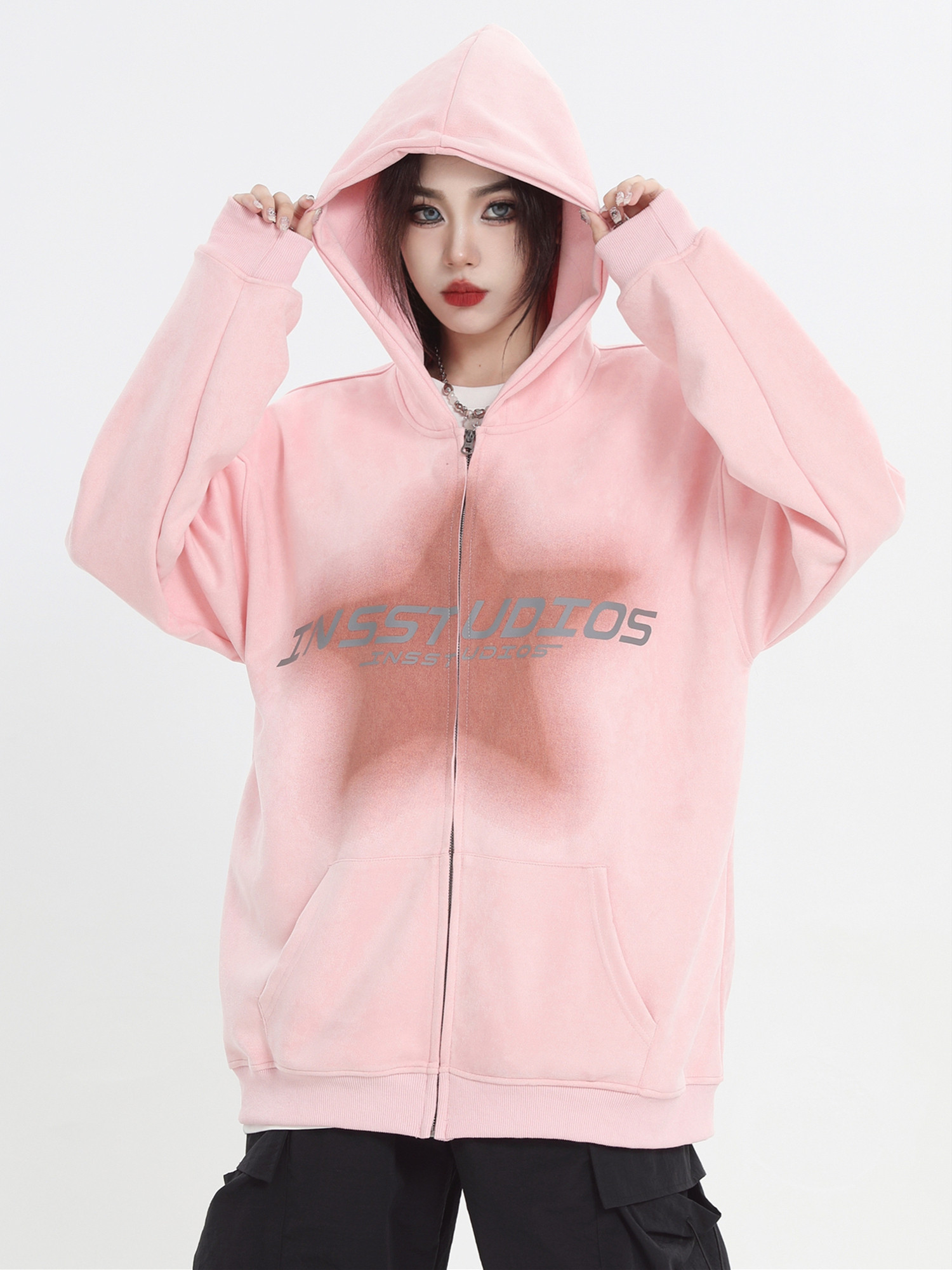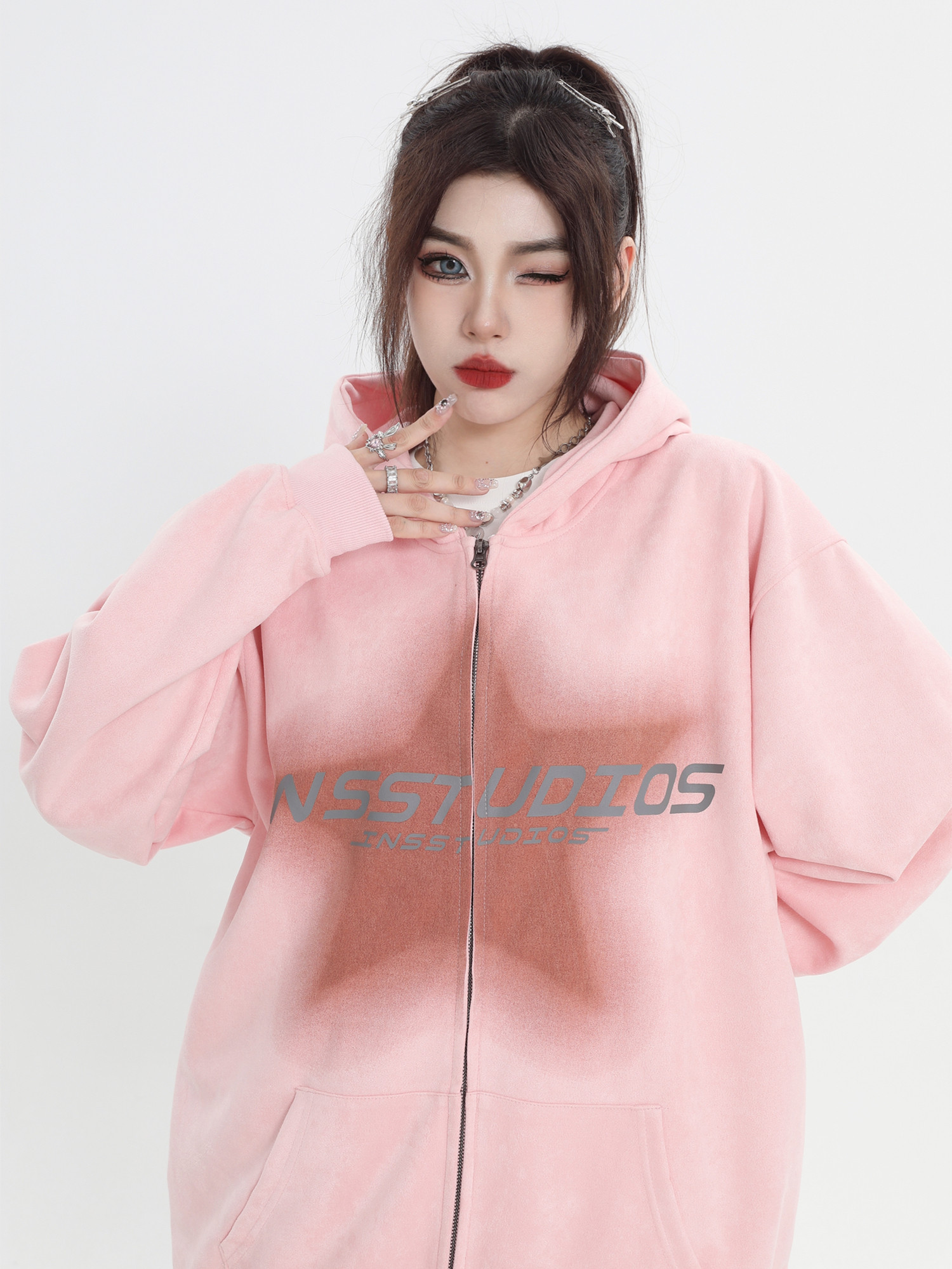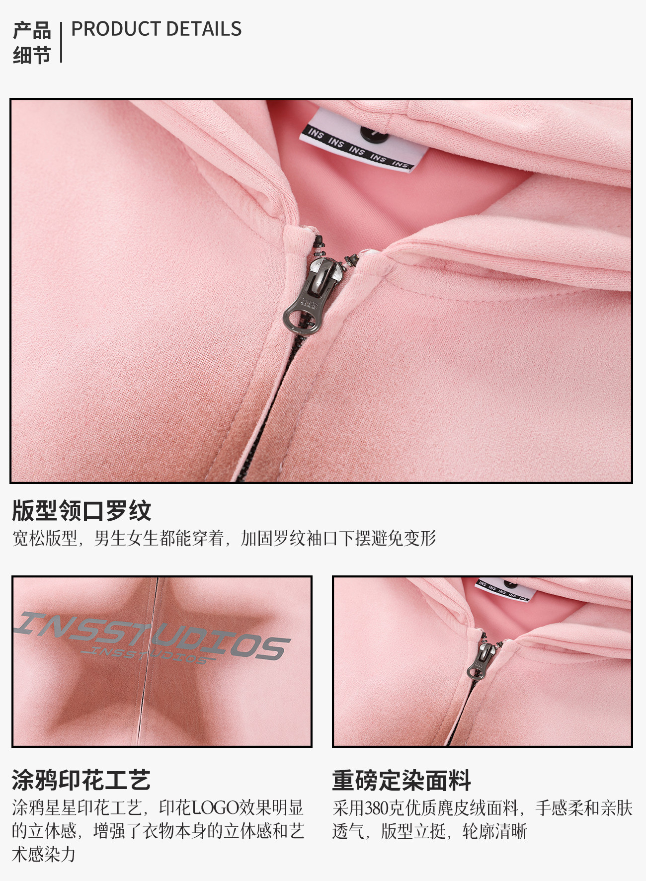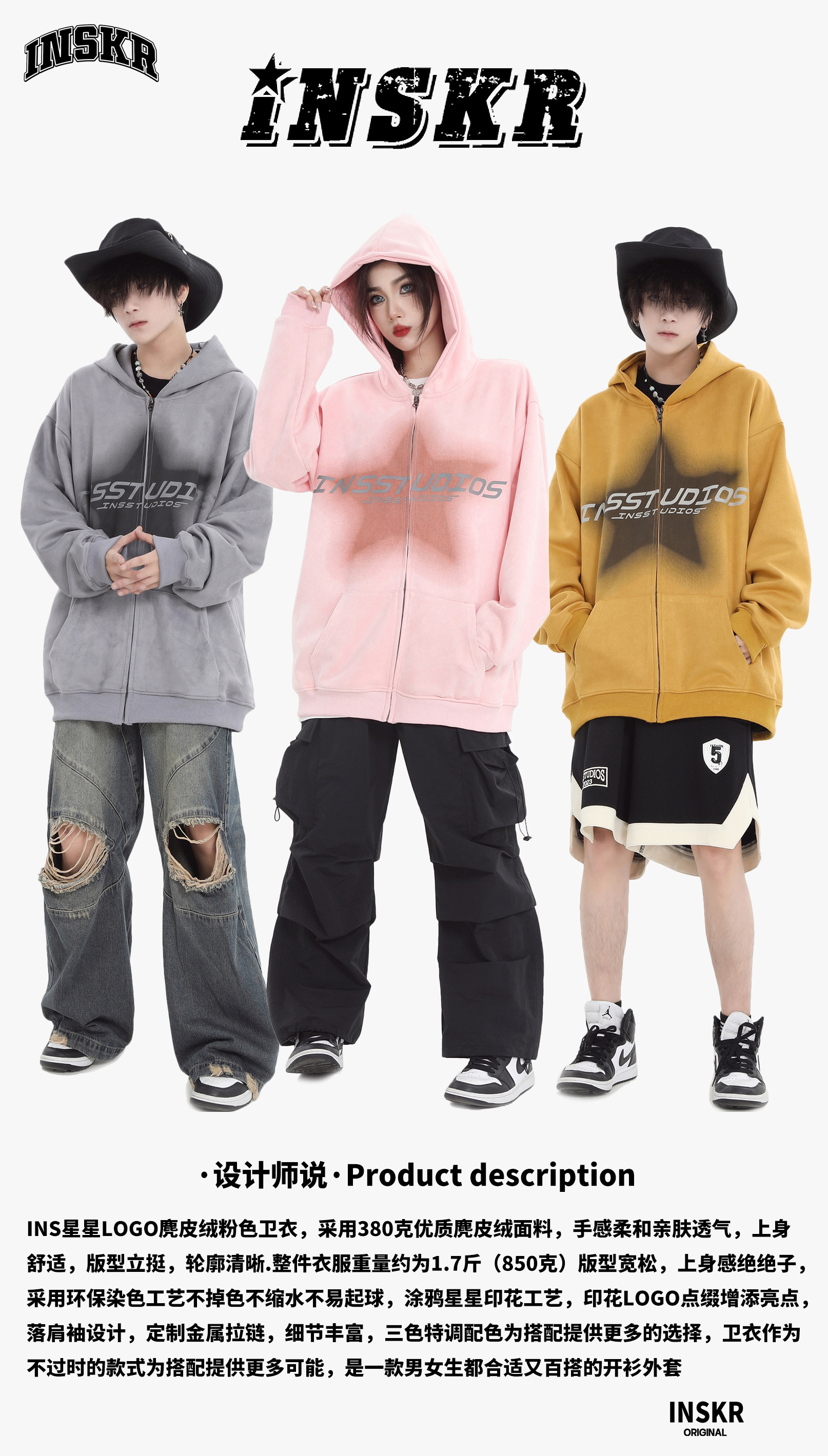 【INSKR】國潮牌情侶美式星星LOGO麂皮絨粉色衛衣拉鍊開衫外套男
