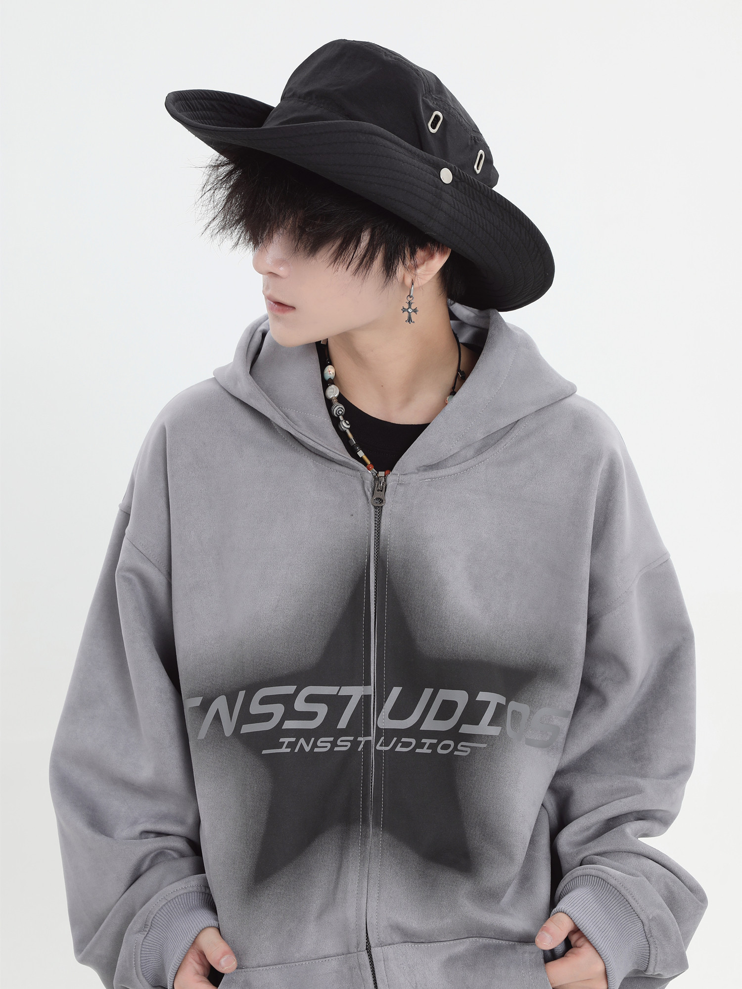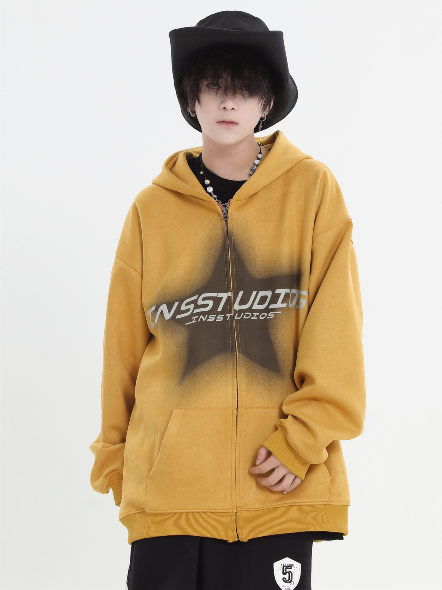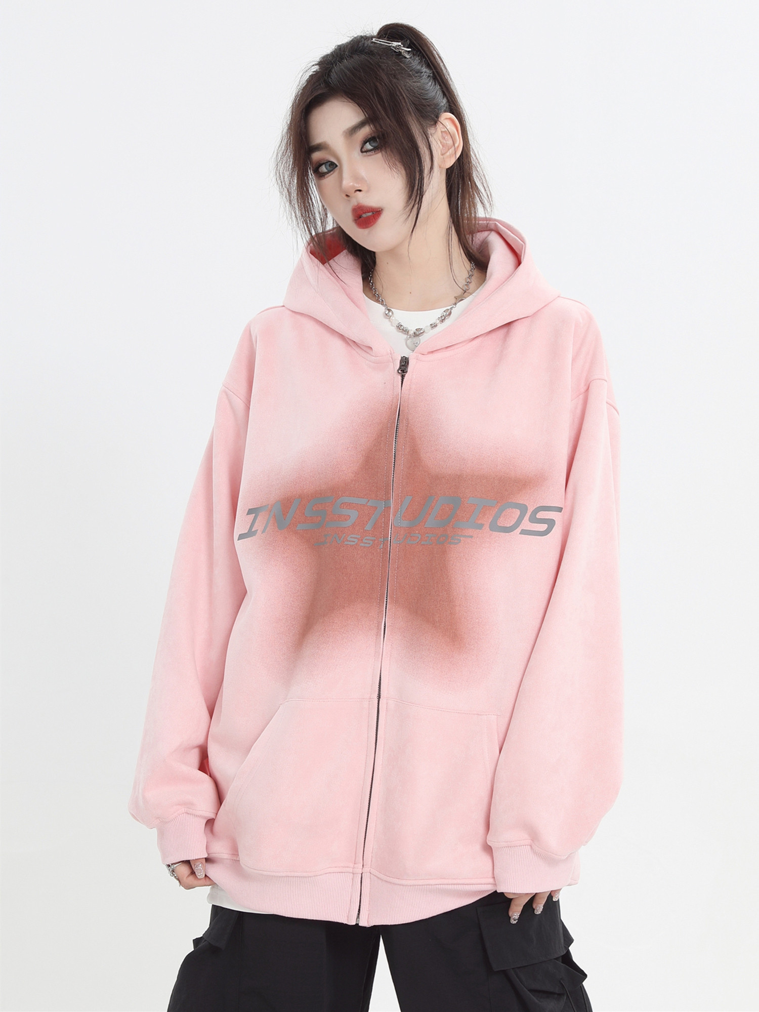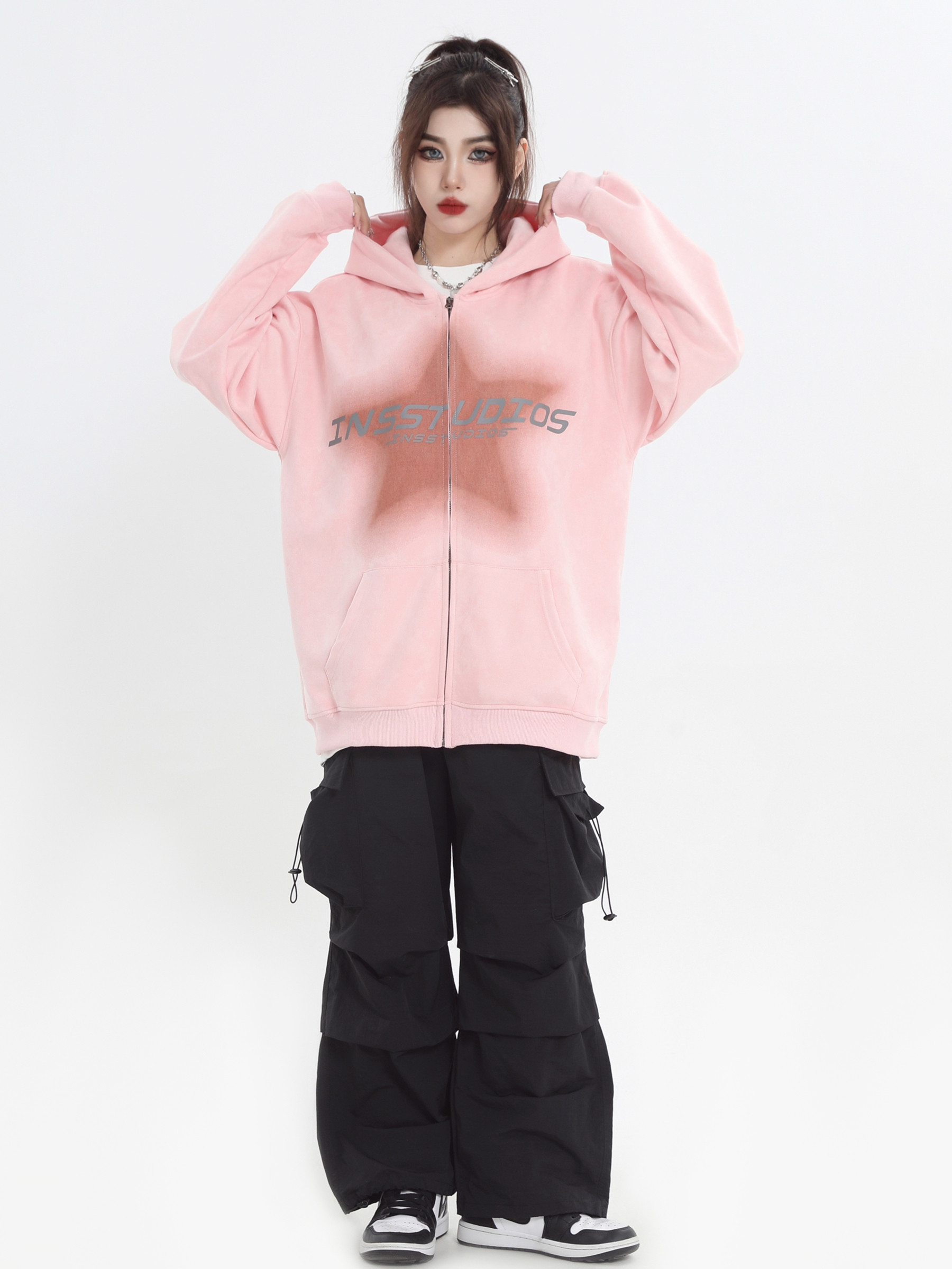 【INSKR】國潮牌情侶美式星星LOGO麂皮絨粉色衛衣拉鍊開衫外套男