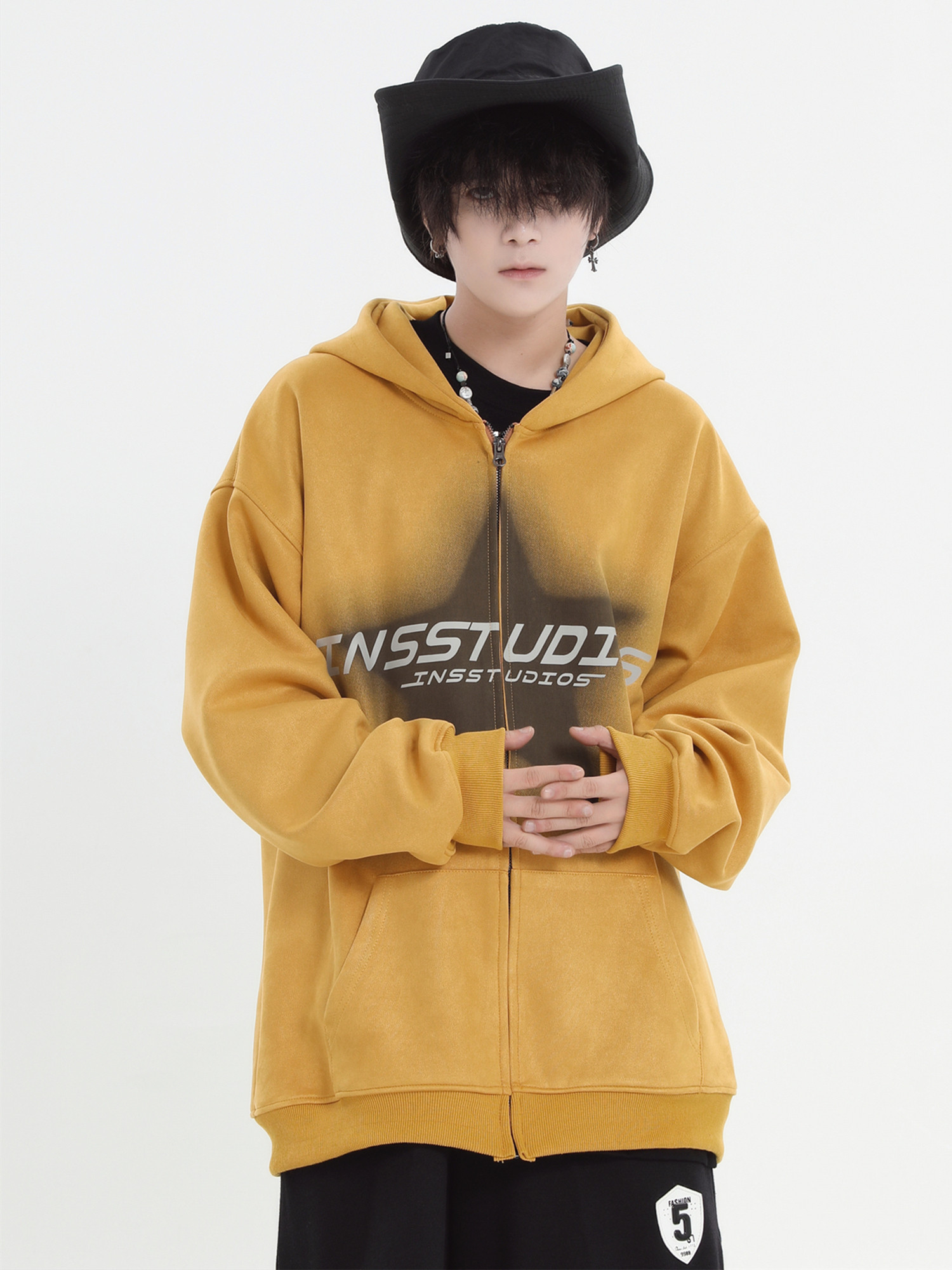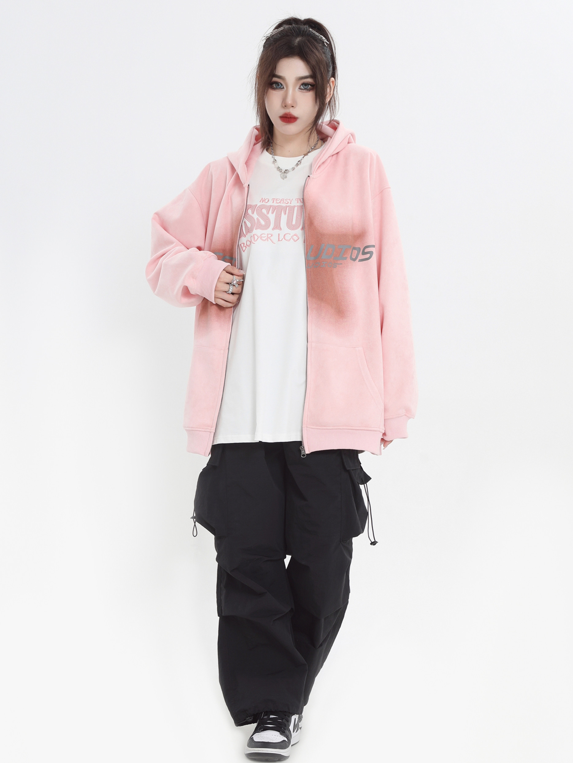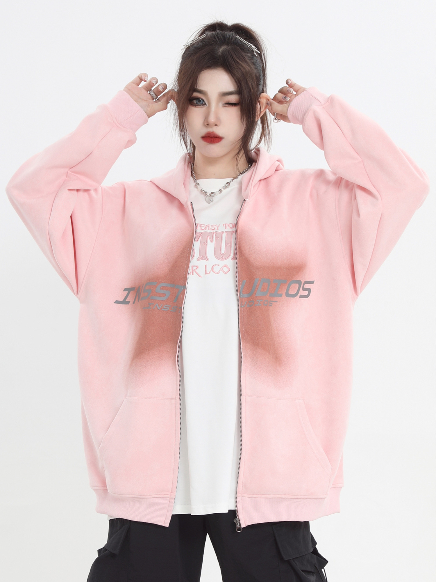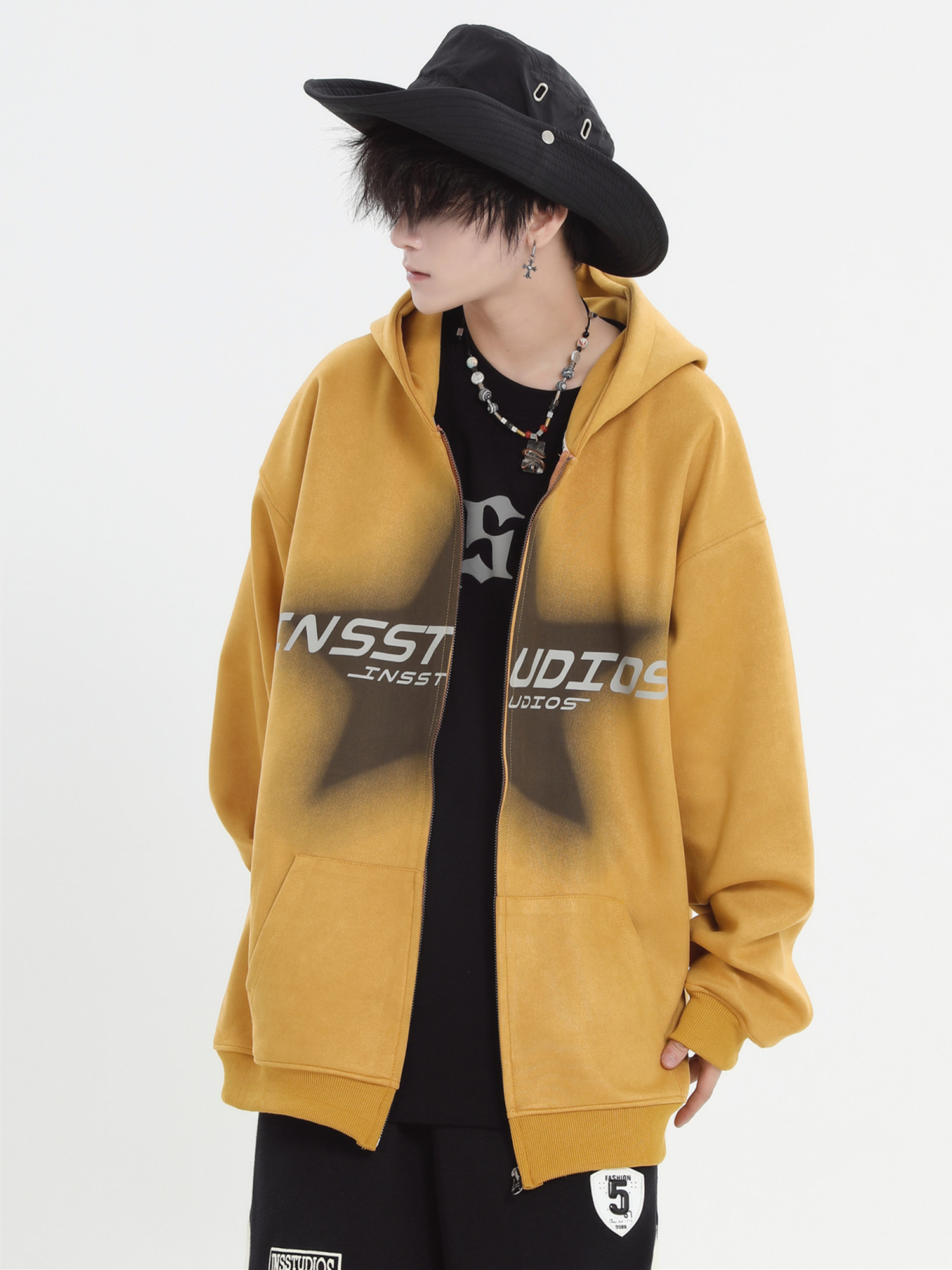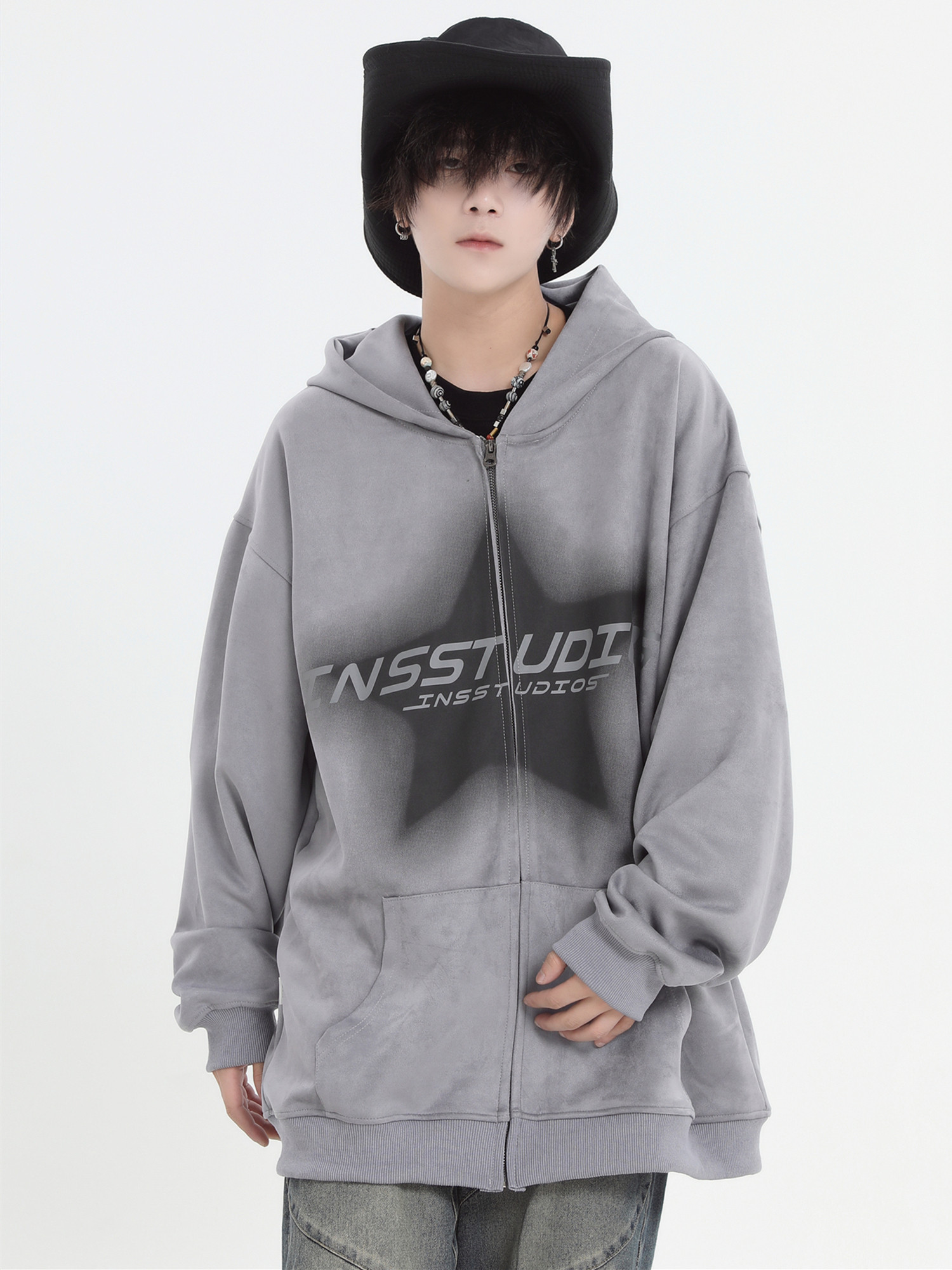【INSKR】國潮牌情侶美式星星LOGO麂皮絨粉色衛衣拉鍊開衫外套男