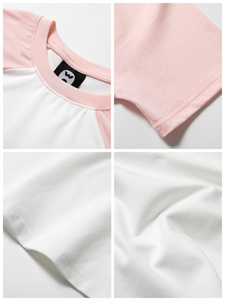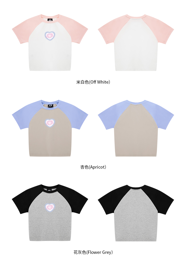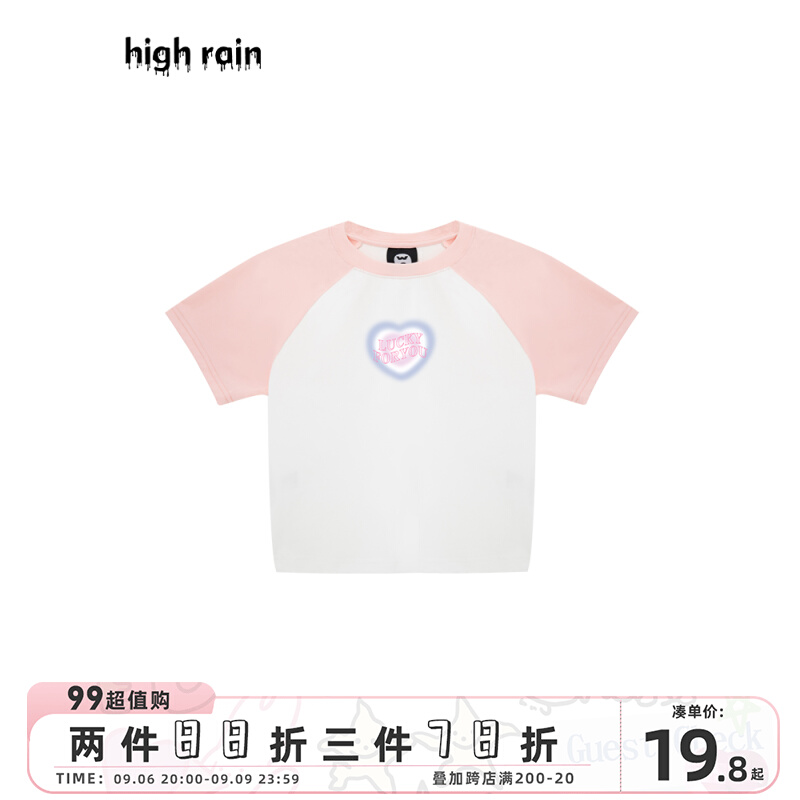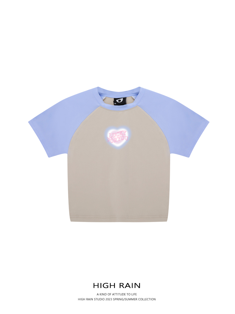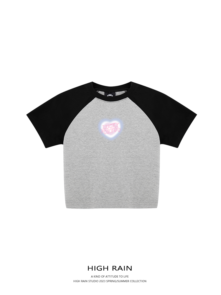 high rain 夏季新品愛心短款插肩袖女小清新T恤露臍修身拼接短袖