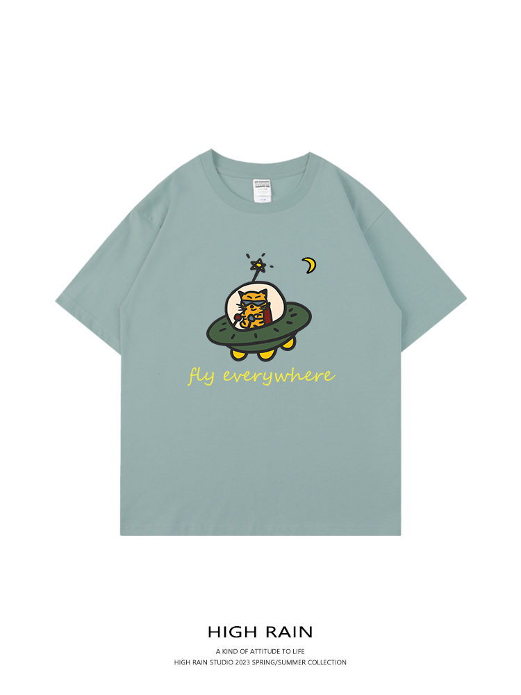 很潤工作室 小貓開飛船可愛夏季短袖T恤男女寬鬆休閒純棉黑色T恤