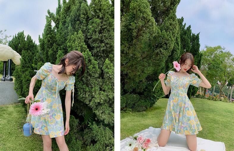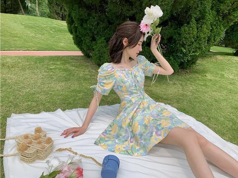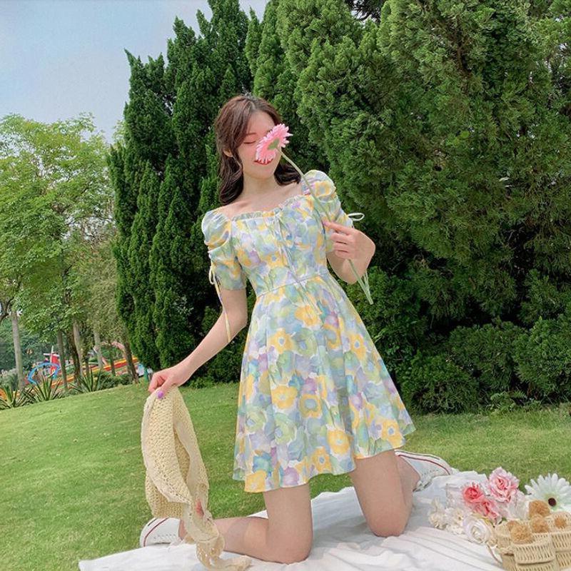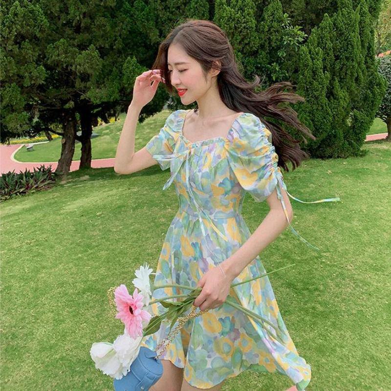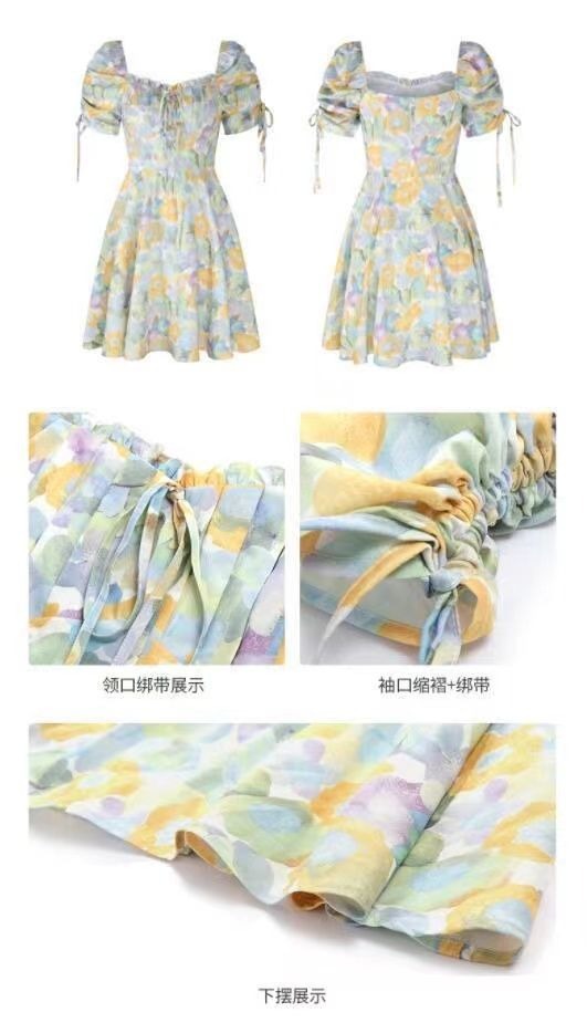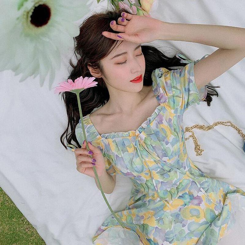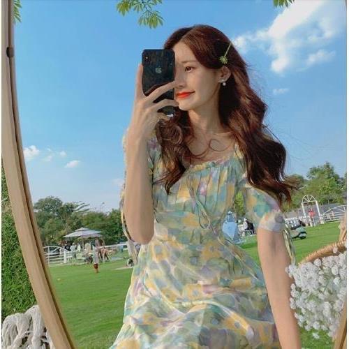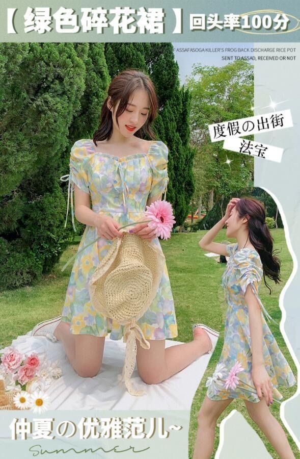 2023夏季新款裙子女装短袖气质高腰a字法式绿色方领碎花连衣裙
