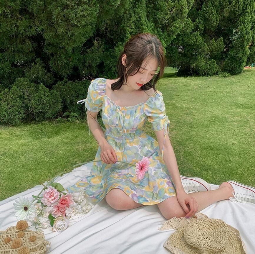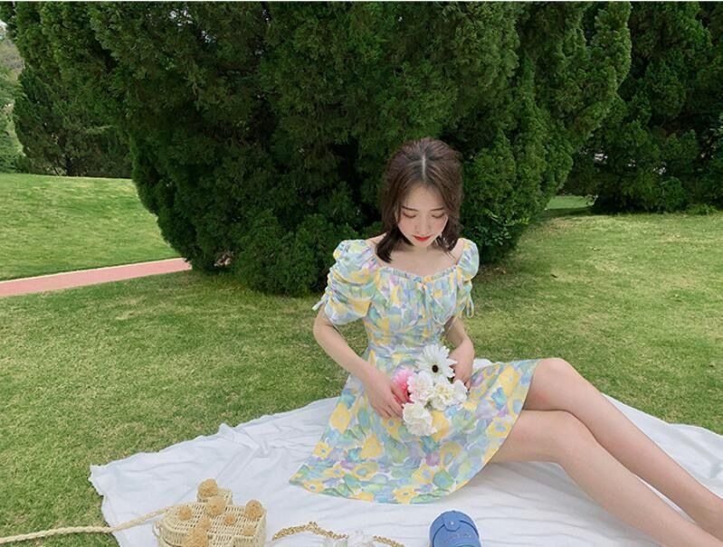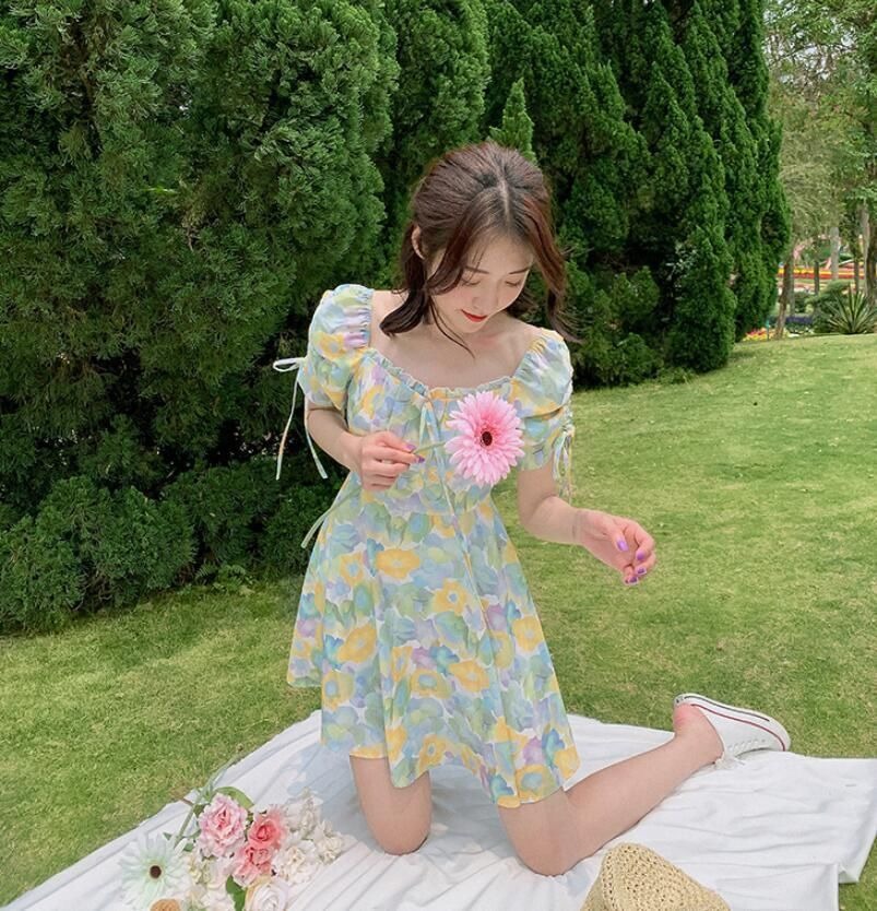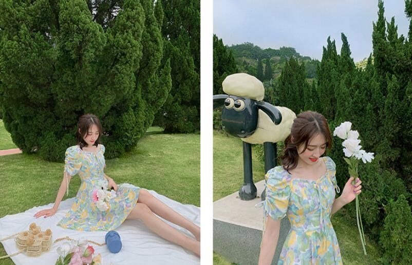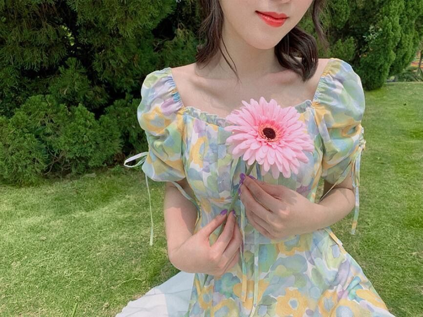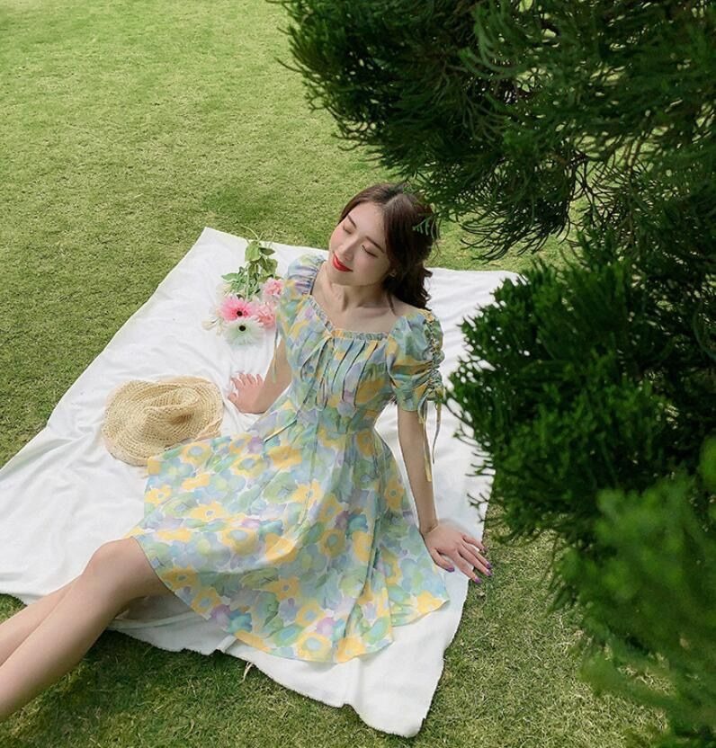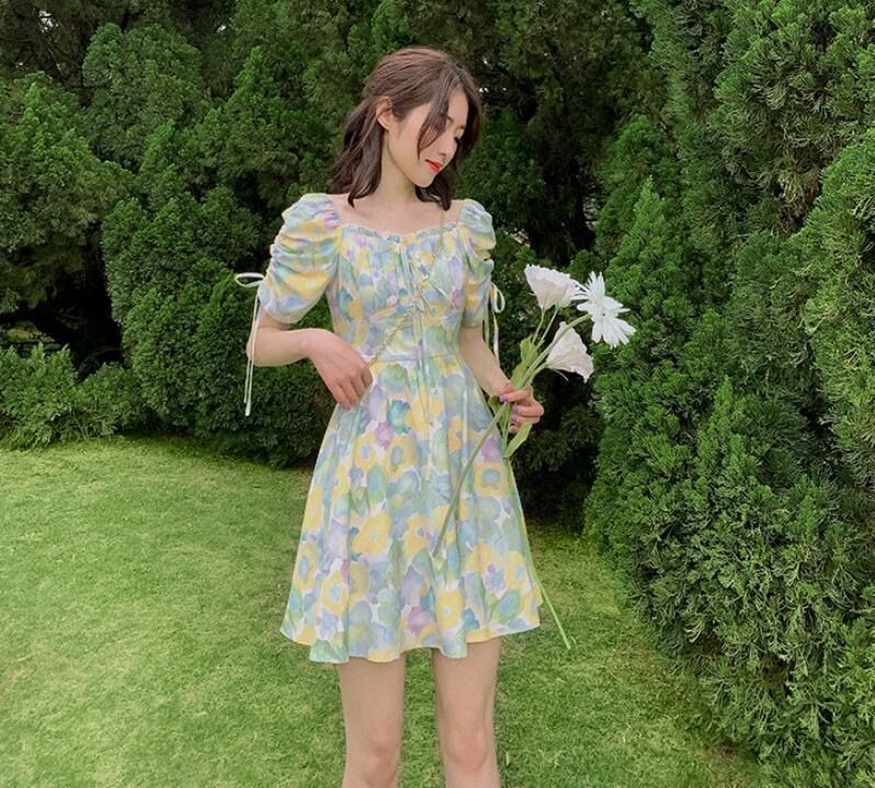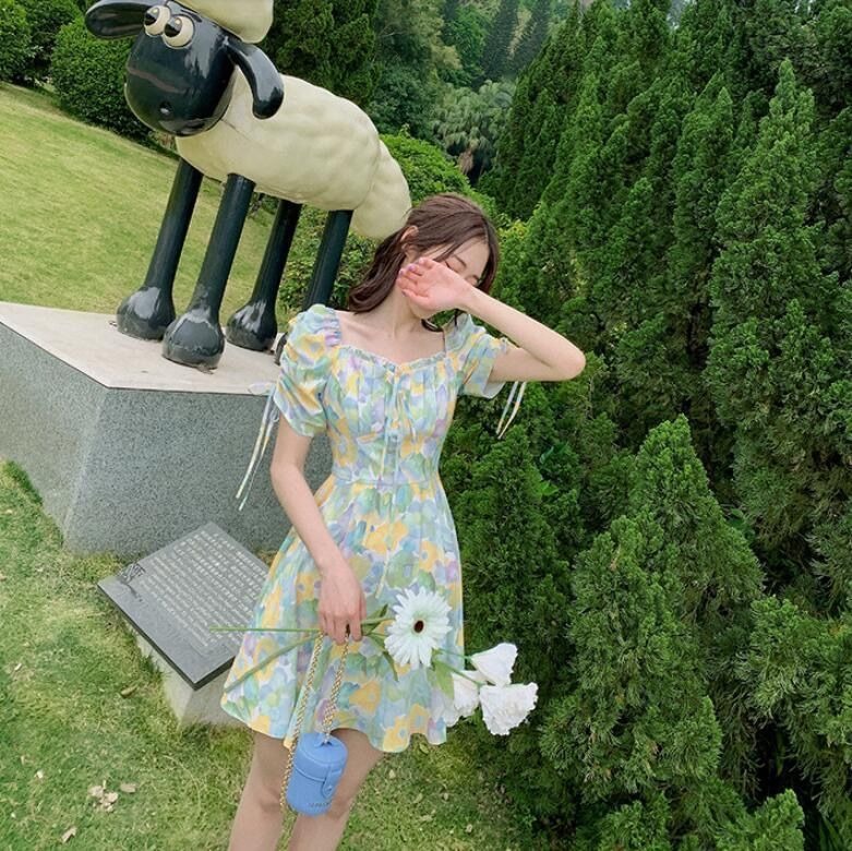 2023夏季新款裙子女装短袖气质高腰a字法式绿色方领碎花连衣裙