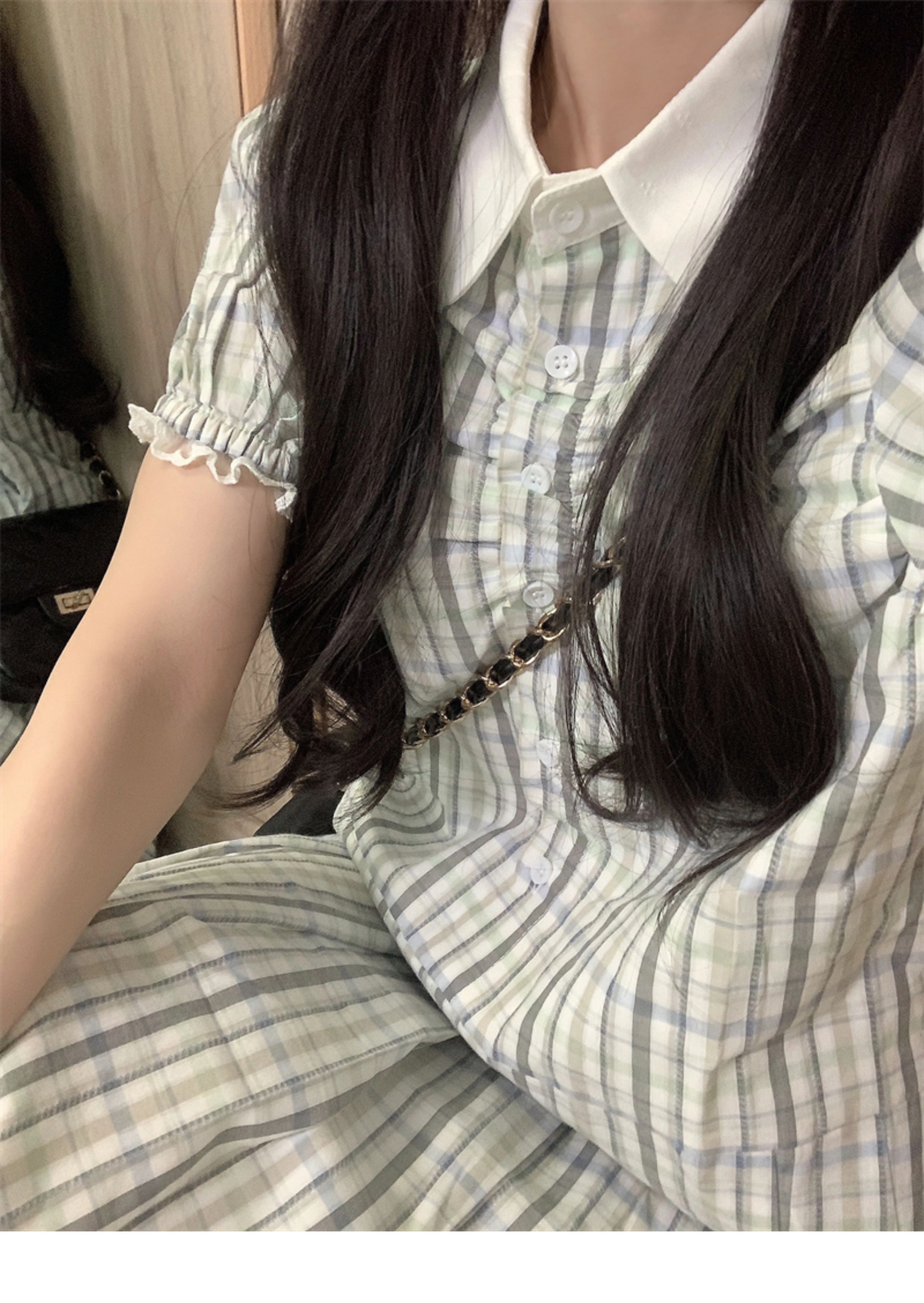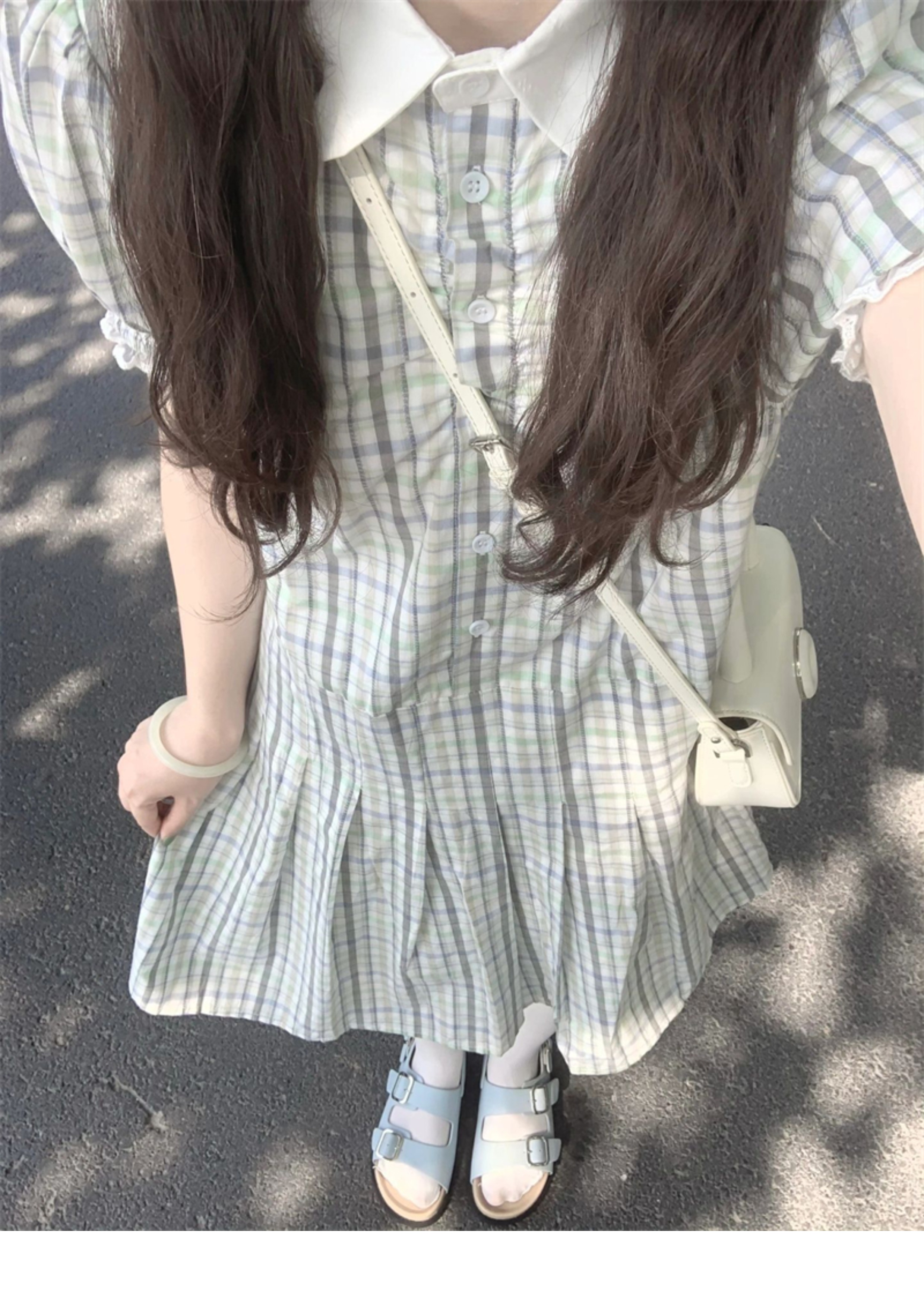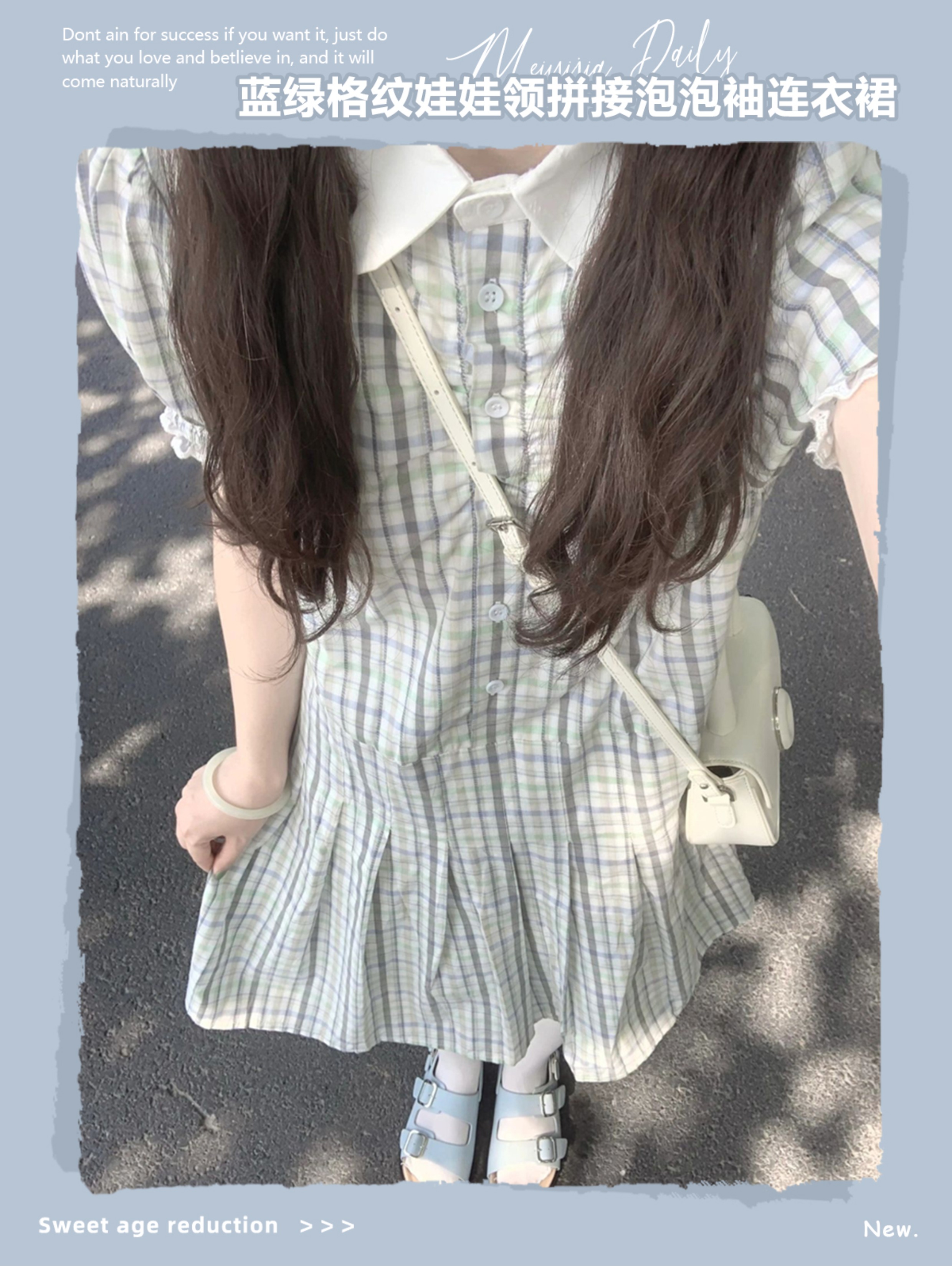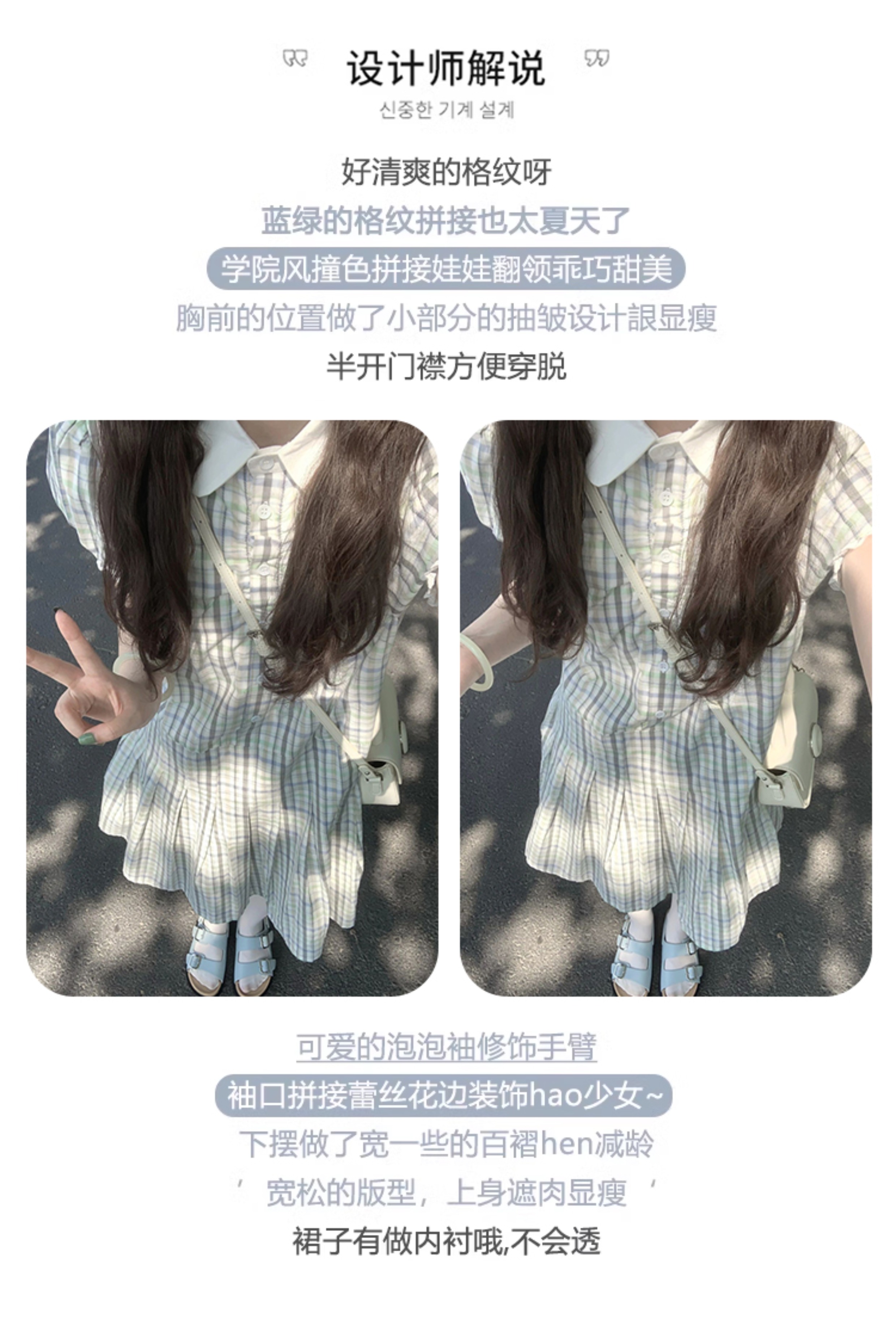 清新藍綠格娃娃領拼接抽皺蕾絲花邊泡泡袖格紋洋裝夏小個子短裙