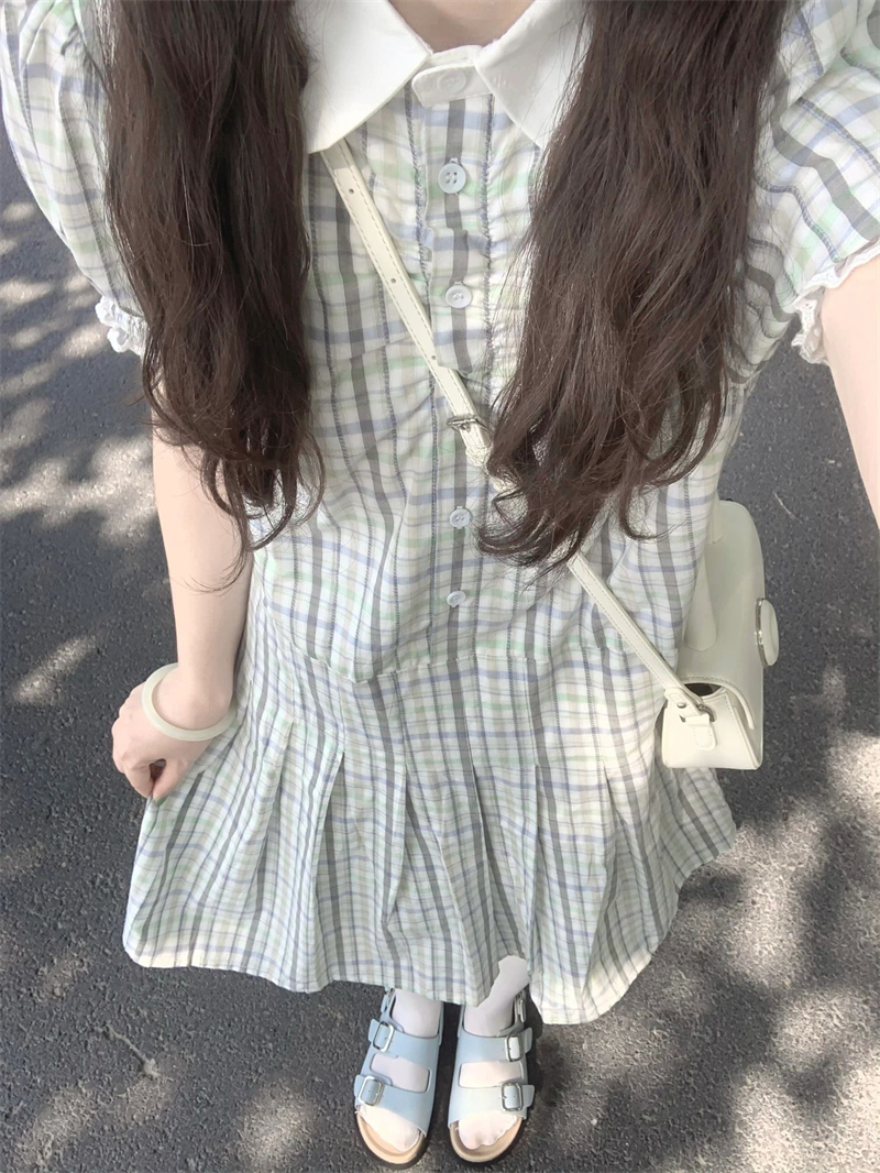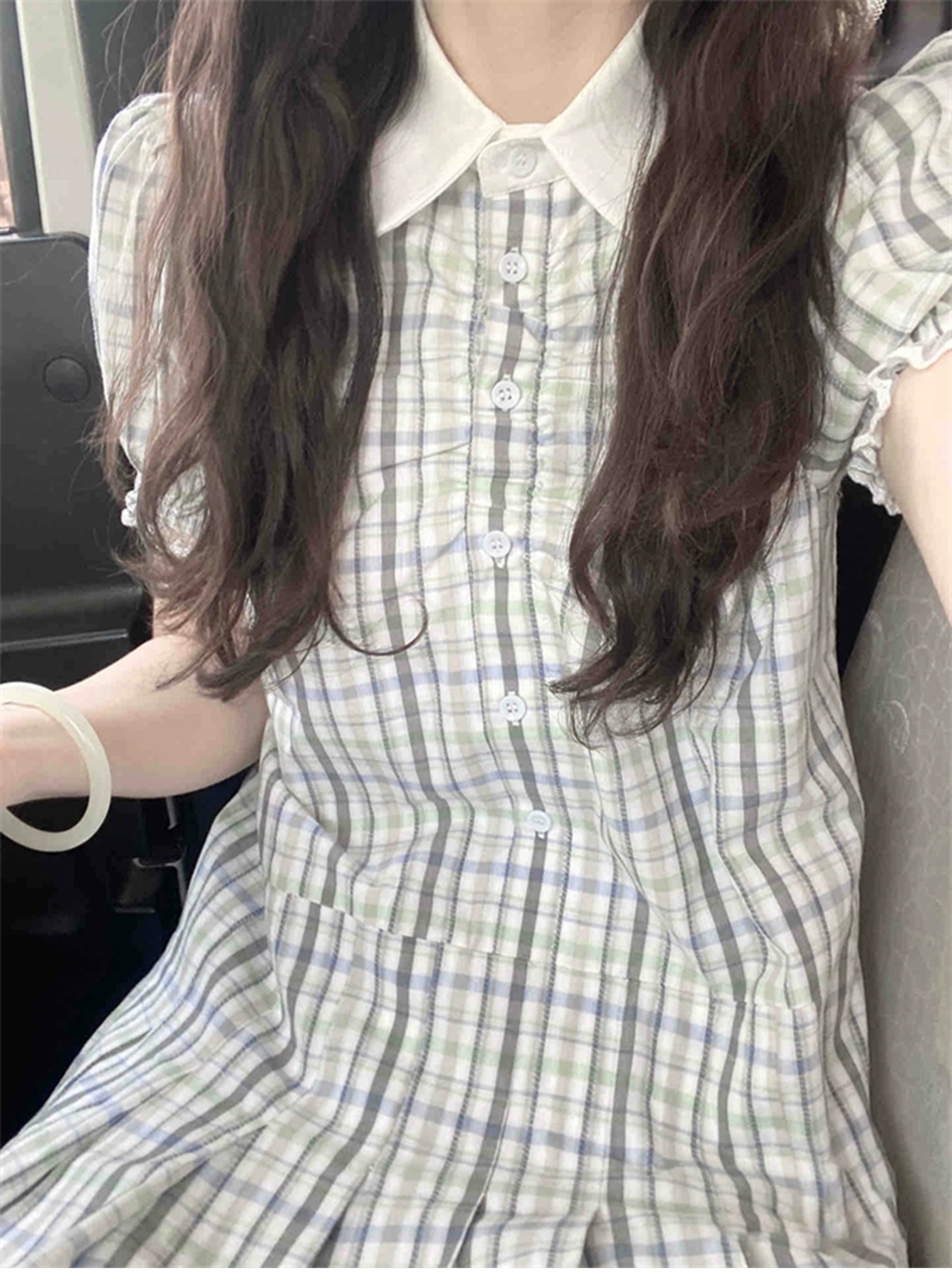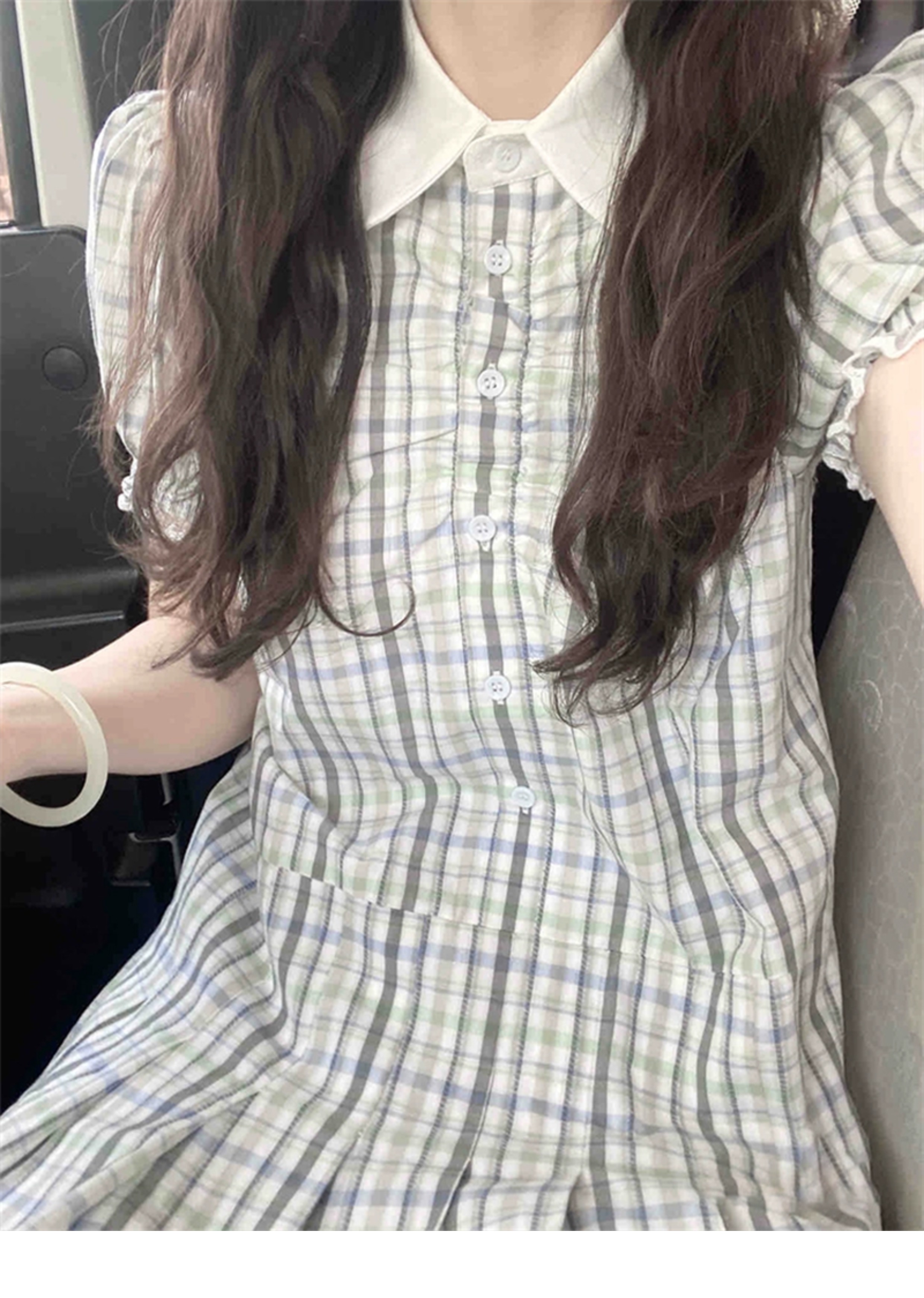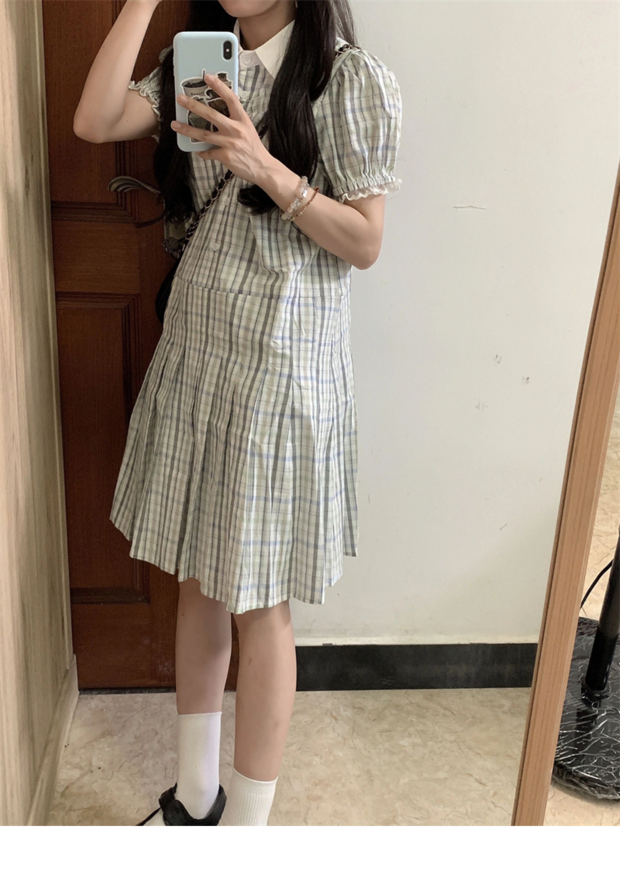 清新藍綠格娃娃領拼接抽皺蕾絲花邊泡泡袖格紋洋裝夏小個子短裙