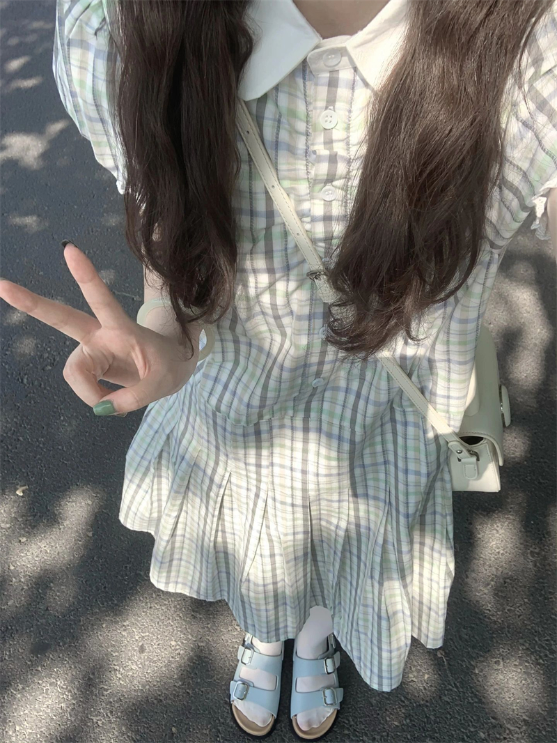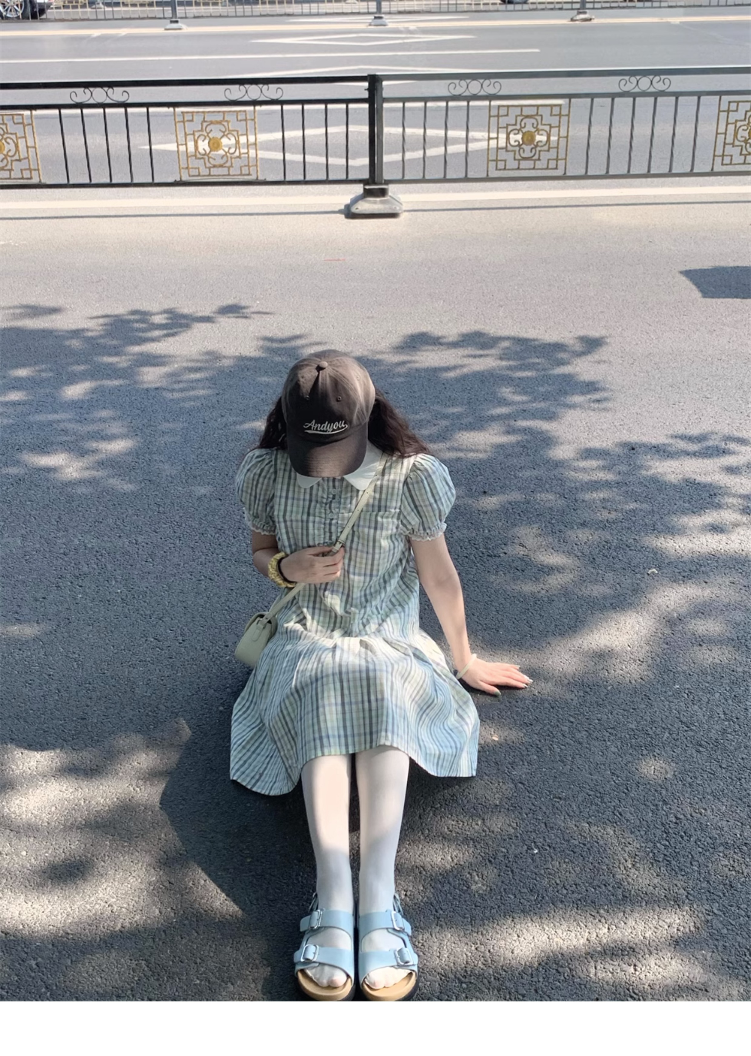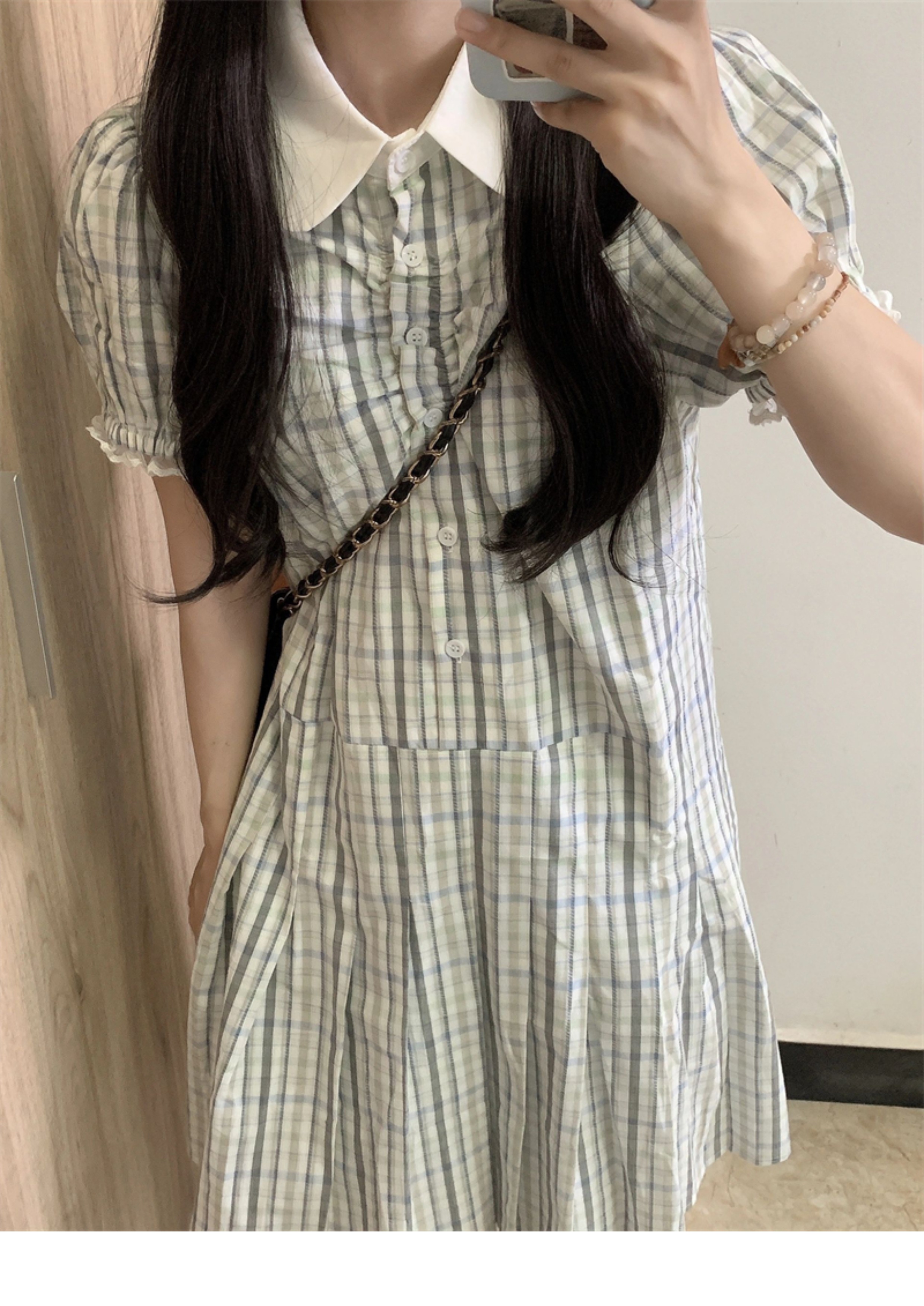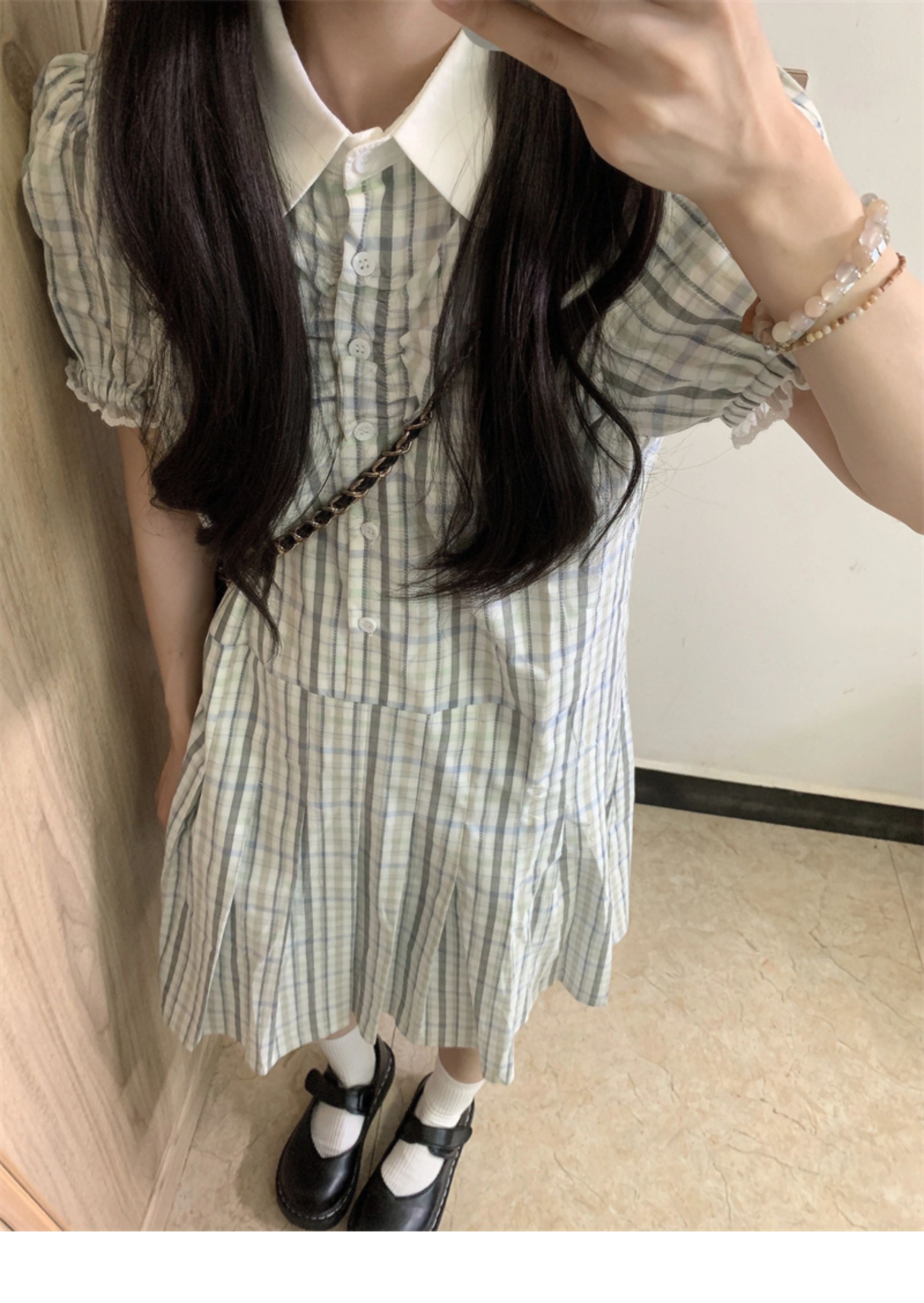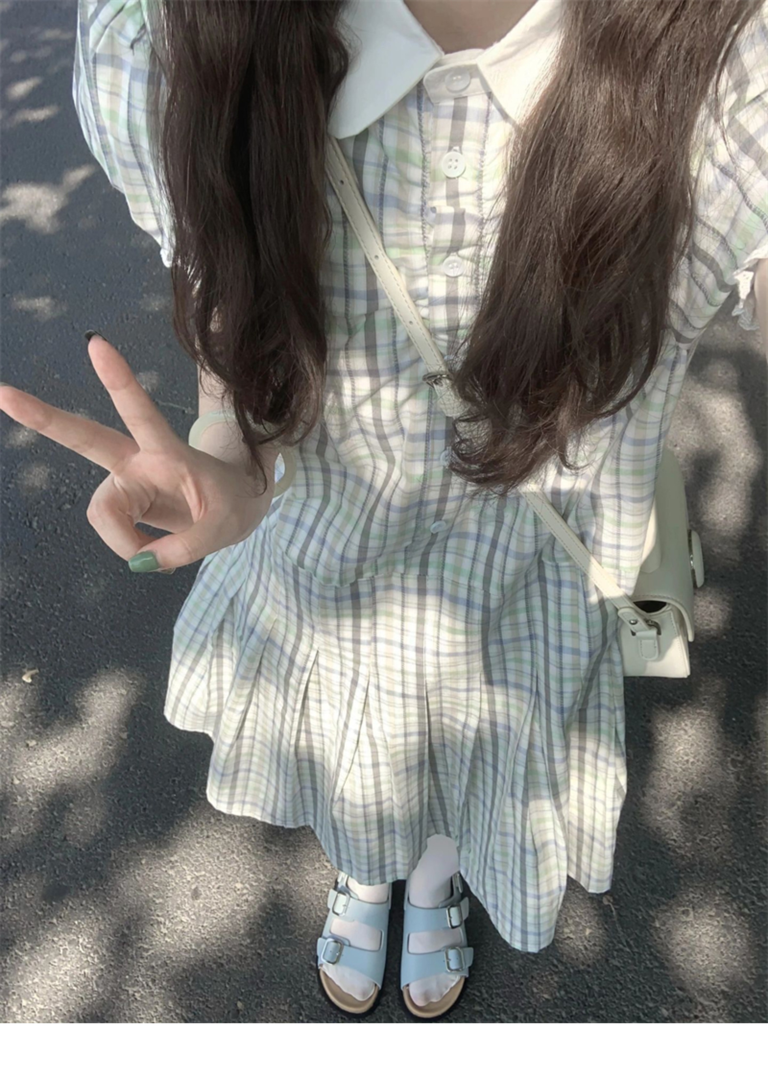 清新藍綠格娃娃領拼接抽皺蕾絲花邊泡泡袖格紋洋裝夏小個子短裙