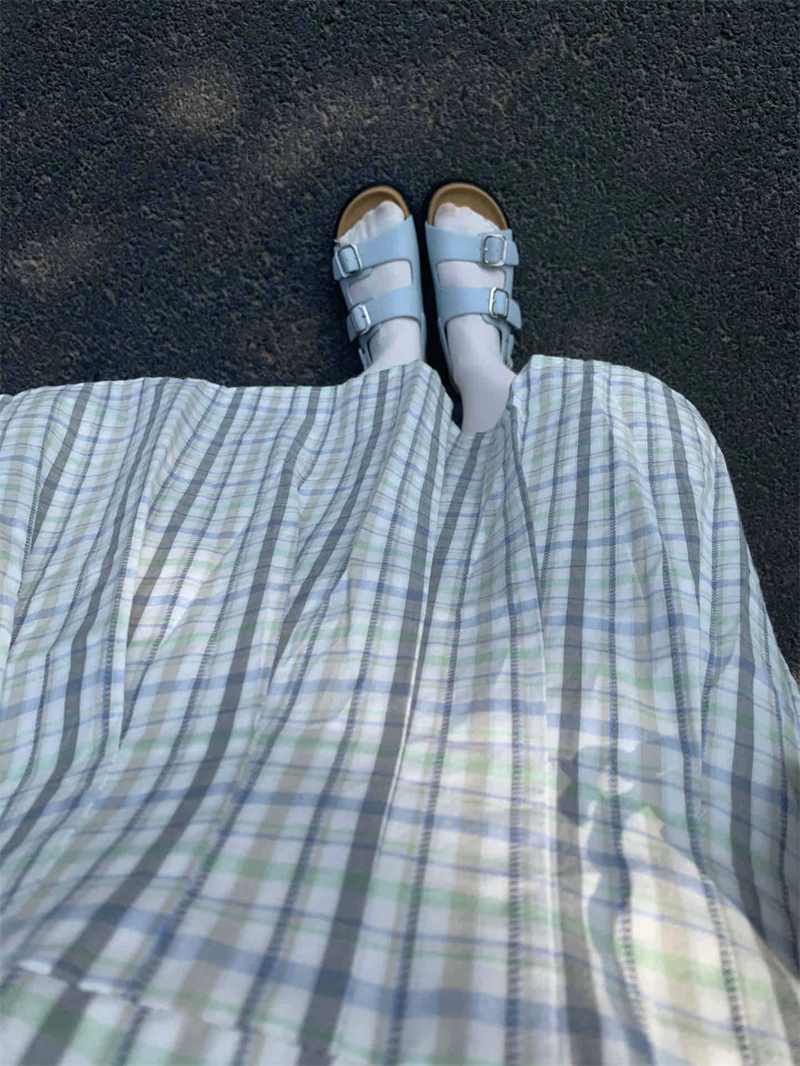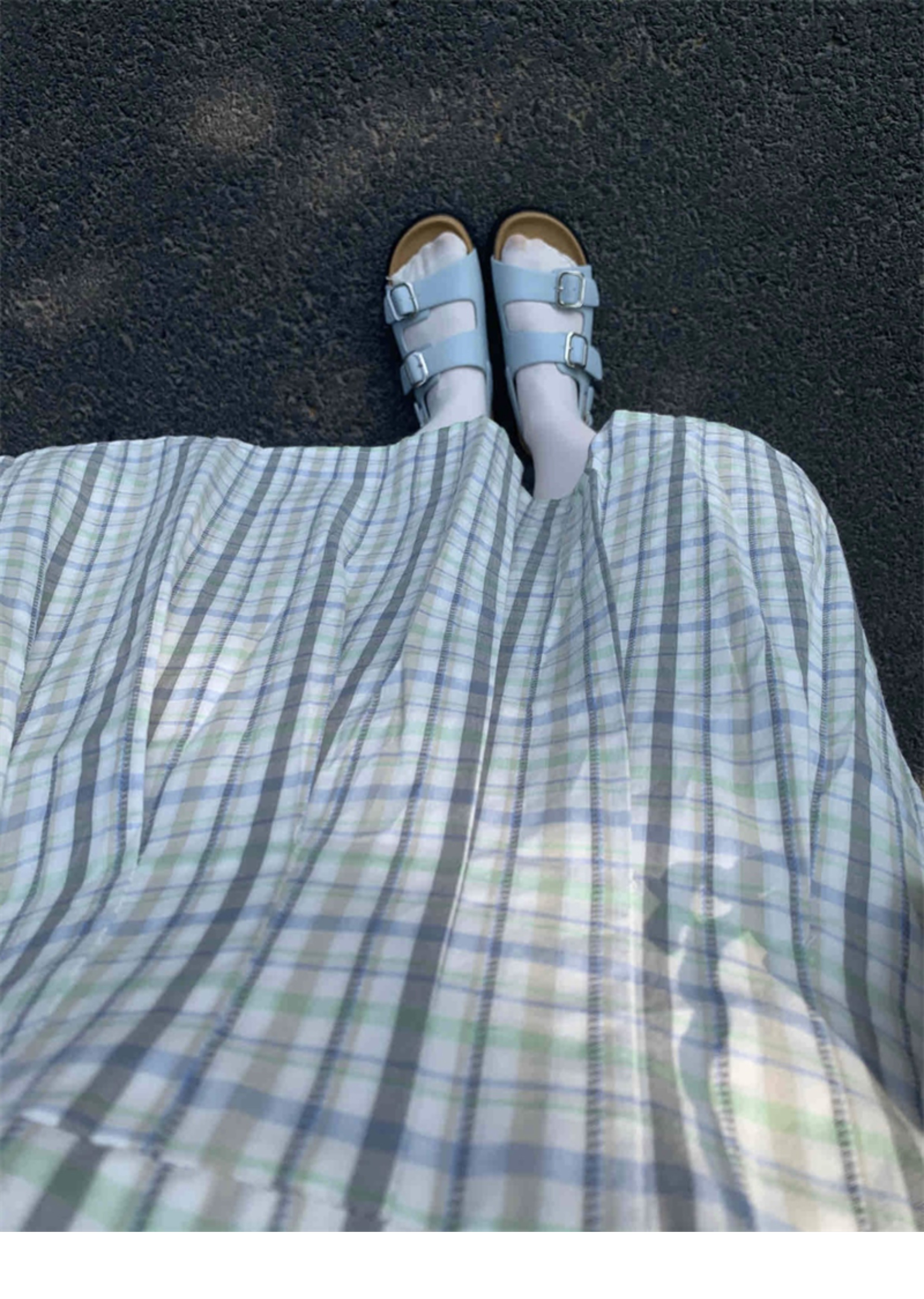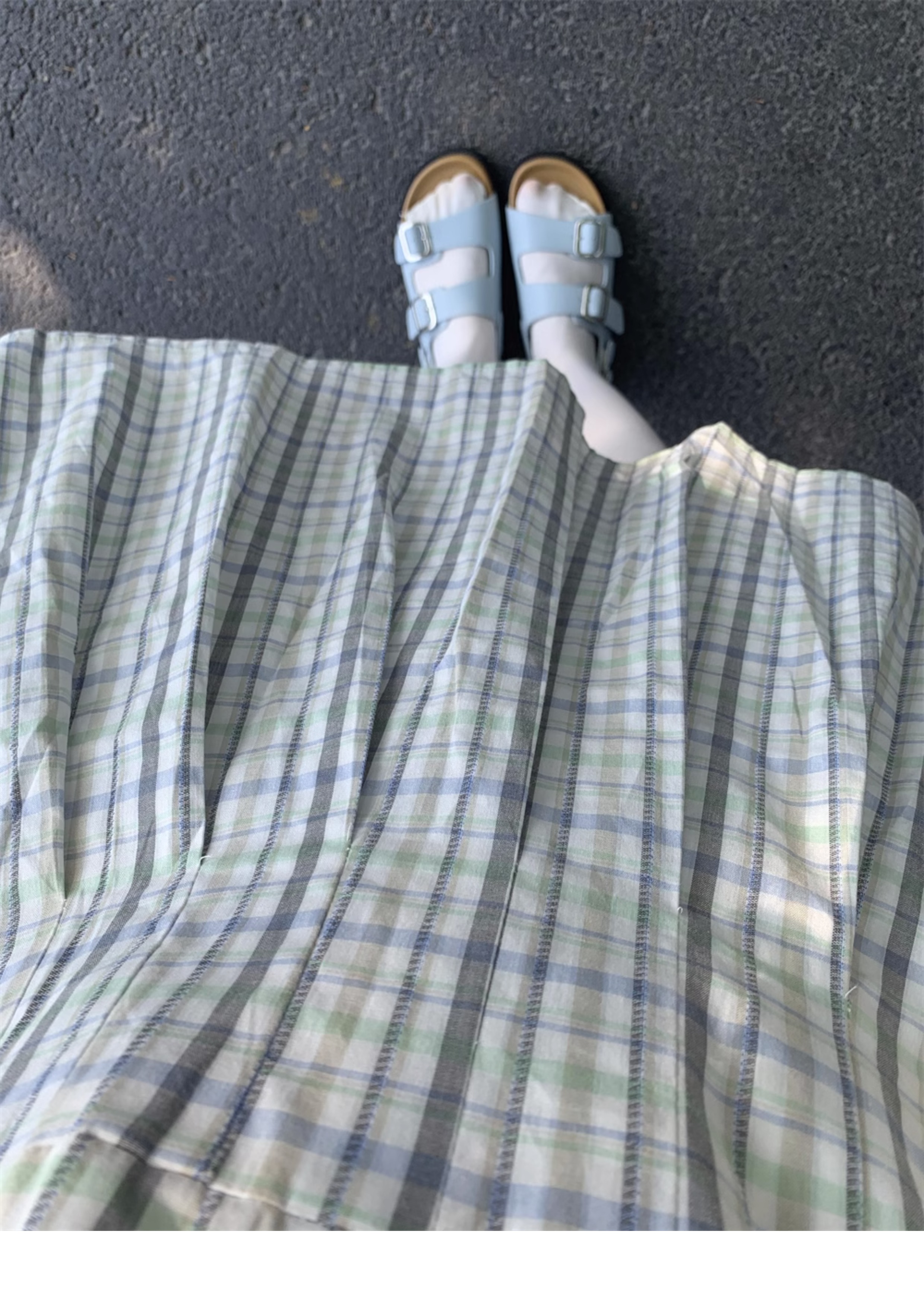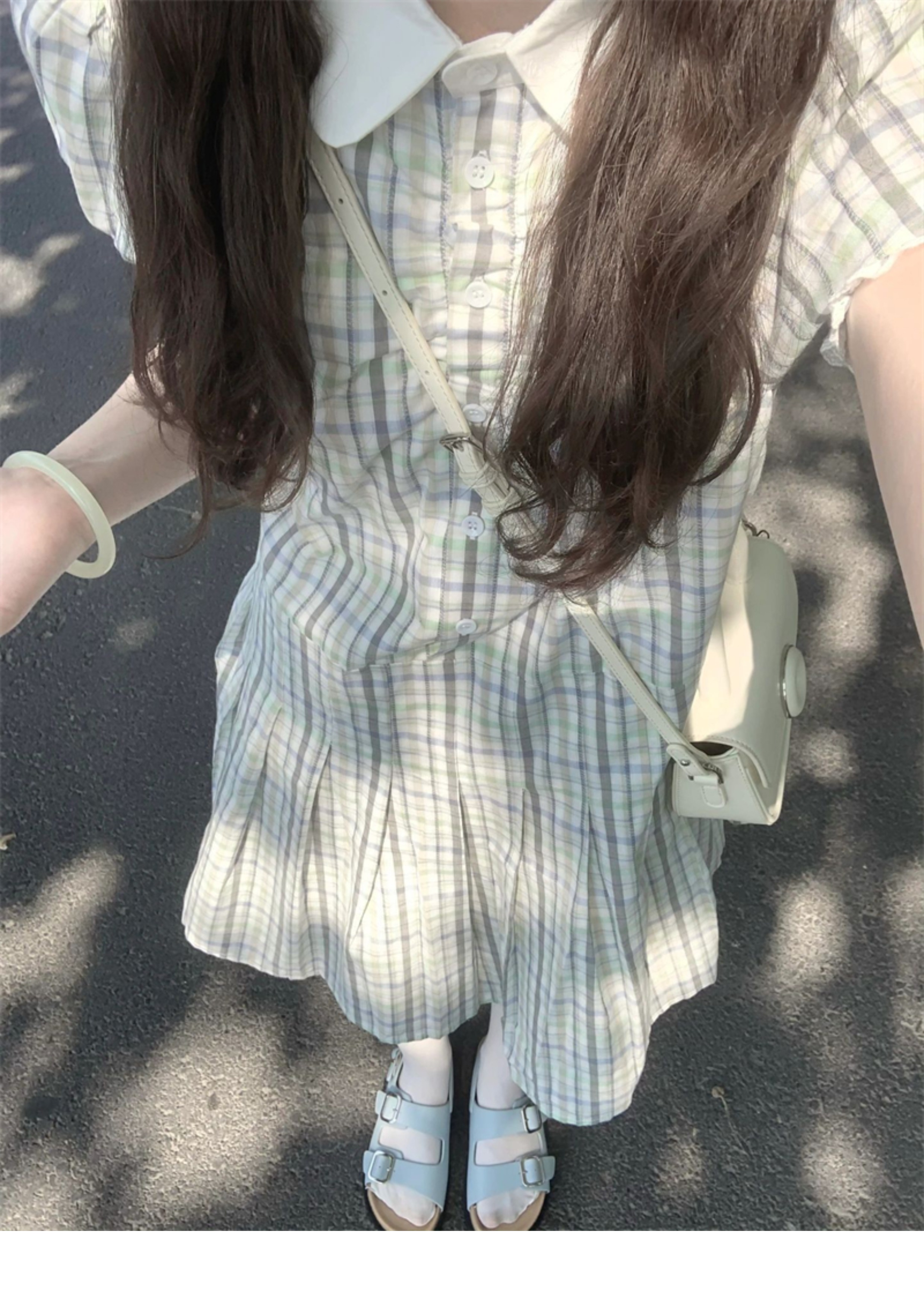 清新藍綠格娃娃領拼接抽皺蕾絲花邊泡泡袖格紋洋裝夏小個子短裙