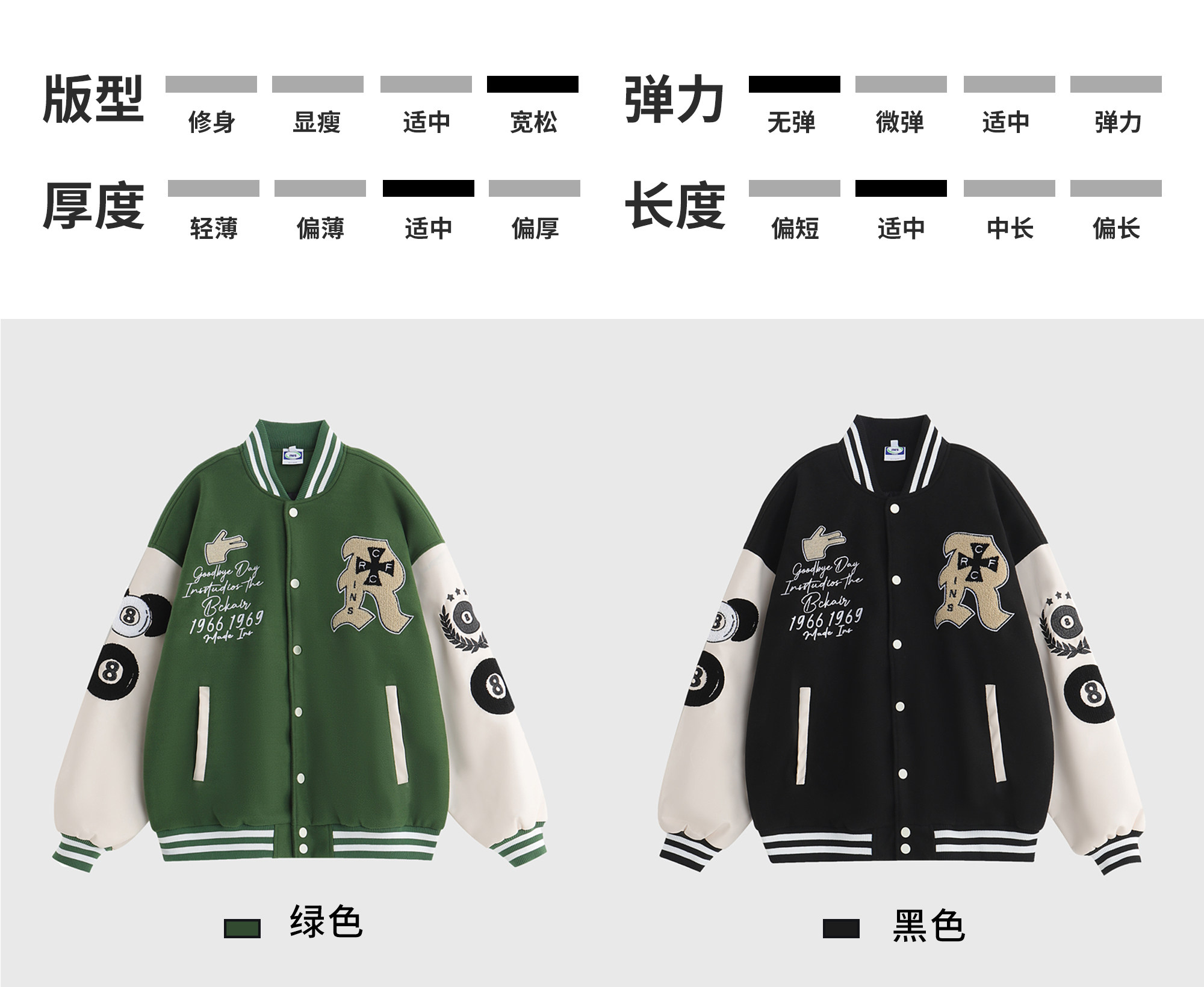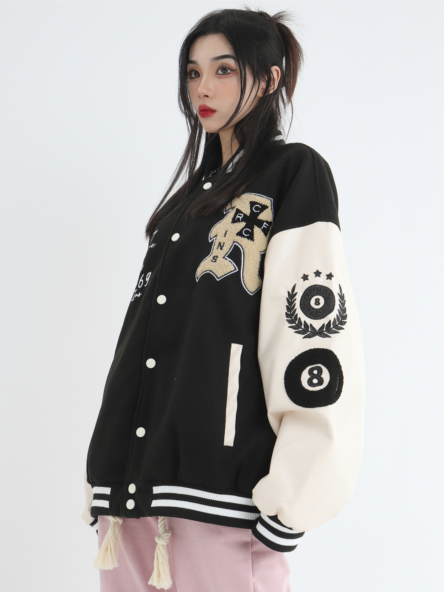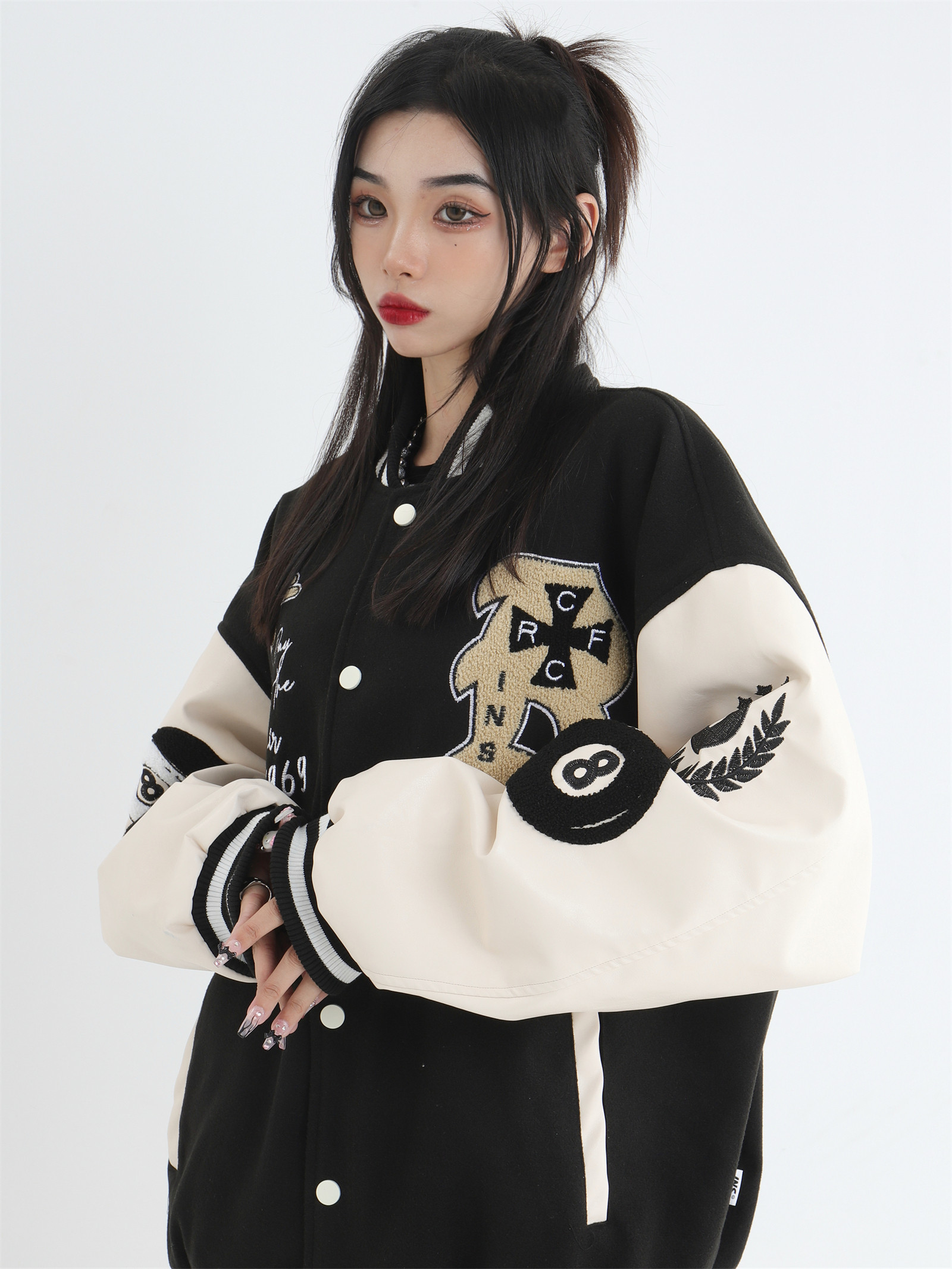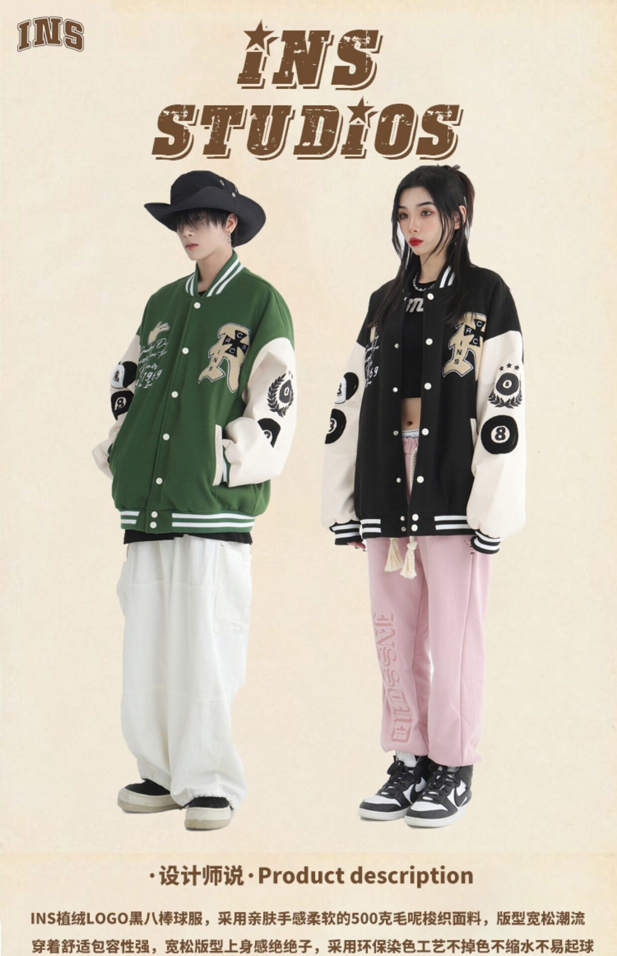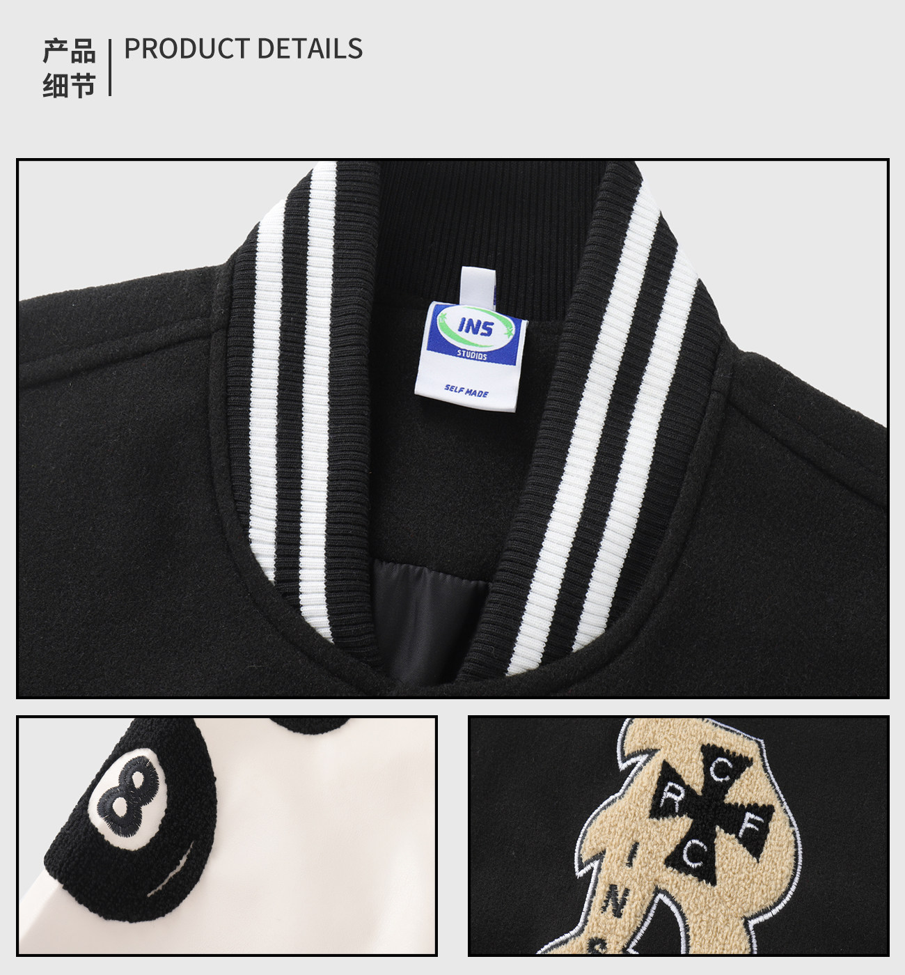 INSstudios 植絨LOGO黑八棒球服自制國潮情侶美式復古夾克外套男