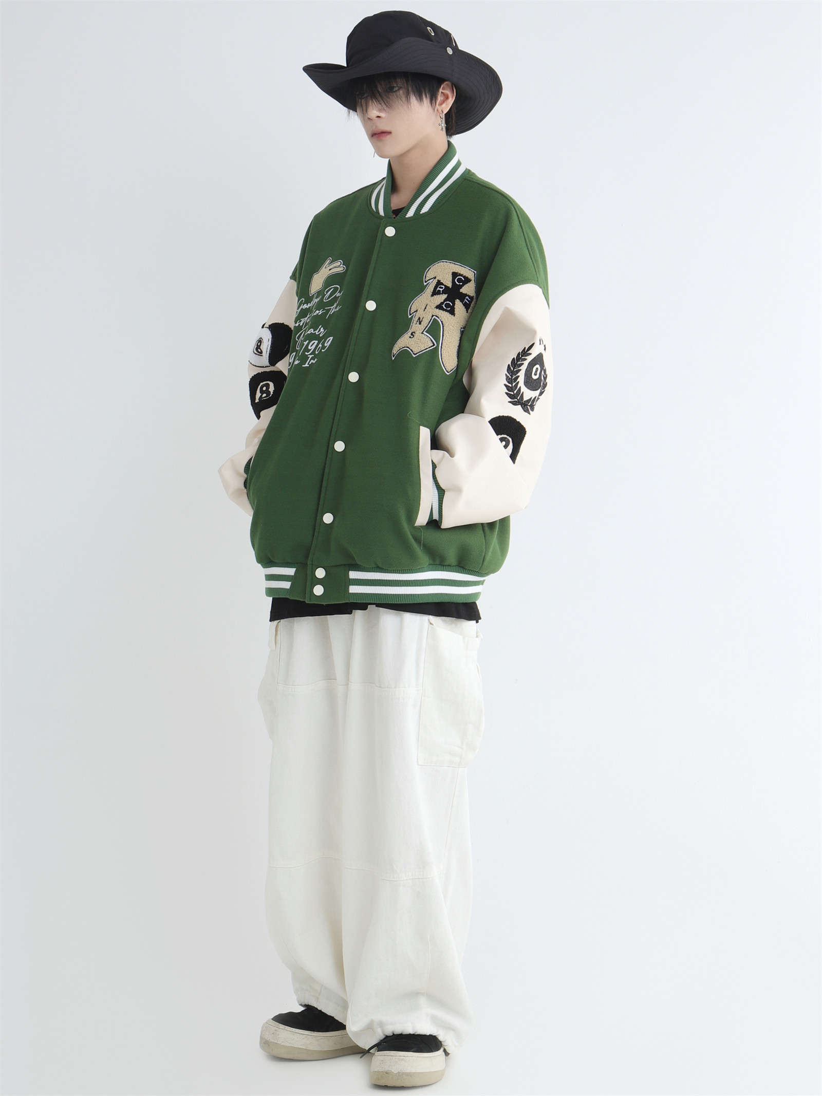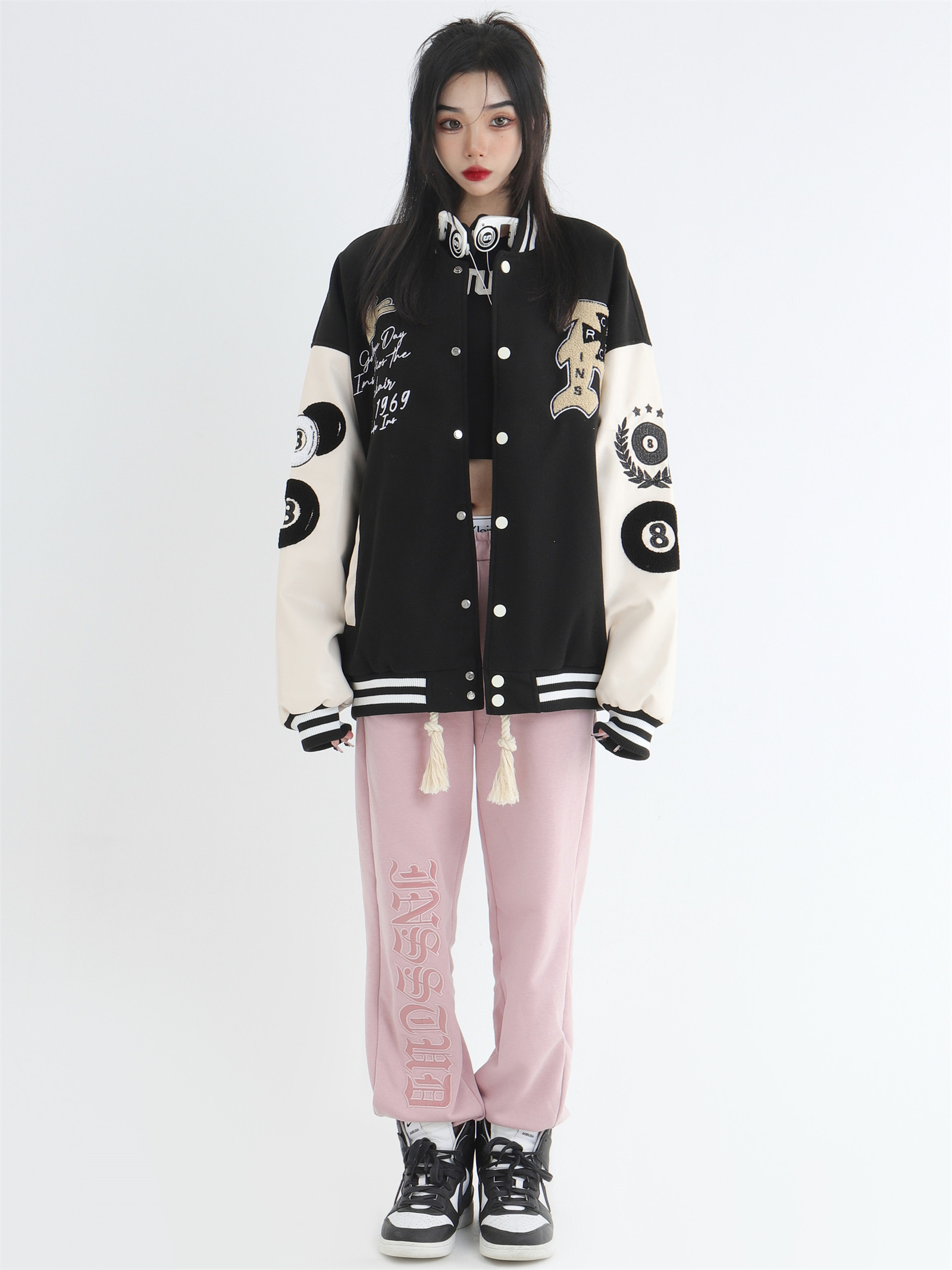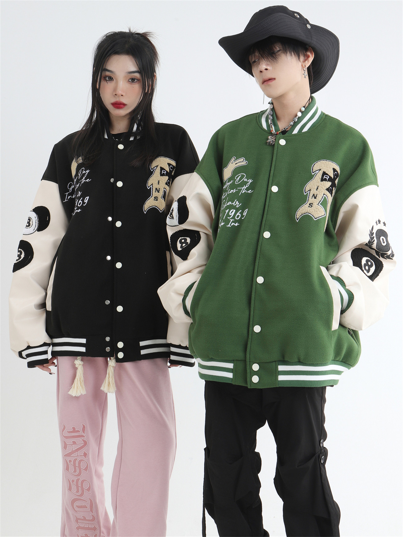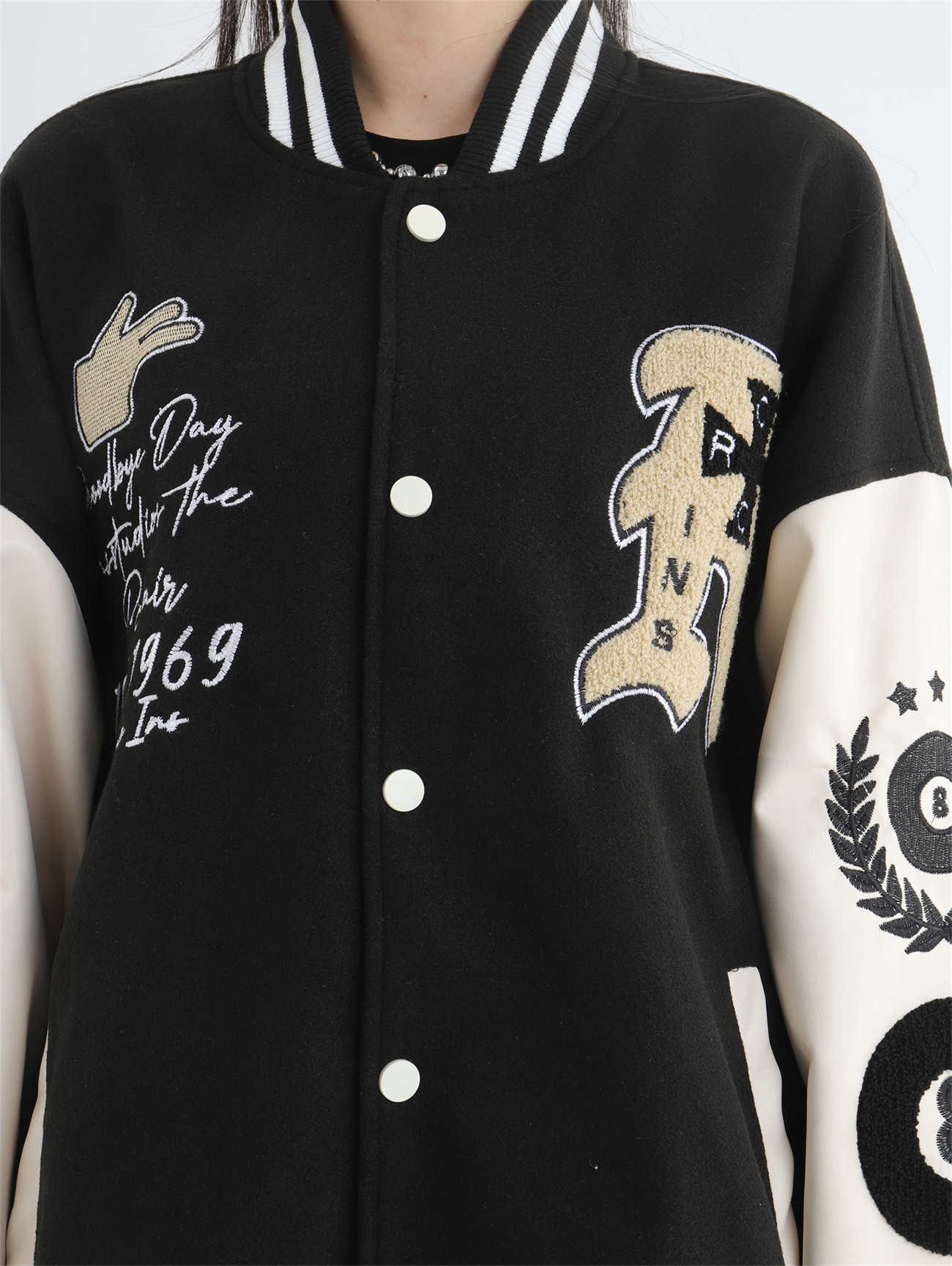 INSstudios 植絨LOGO黑八棒球服自制國潮情侶美式復古夾克外套男
