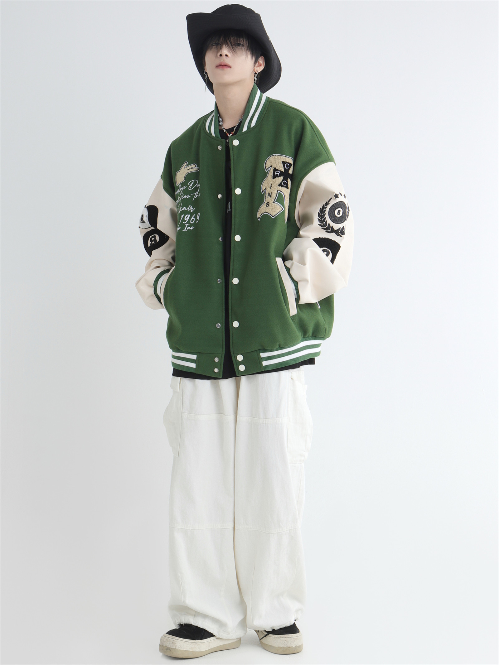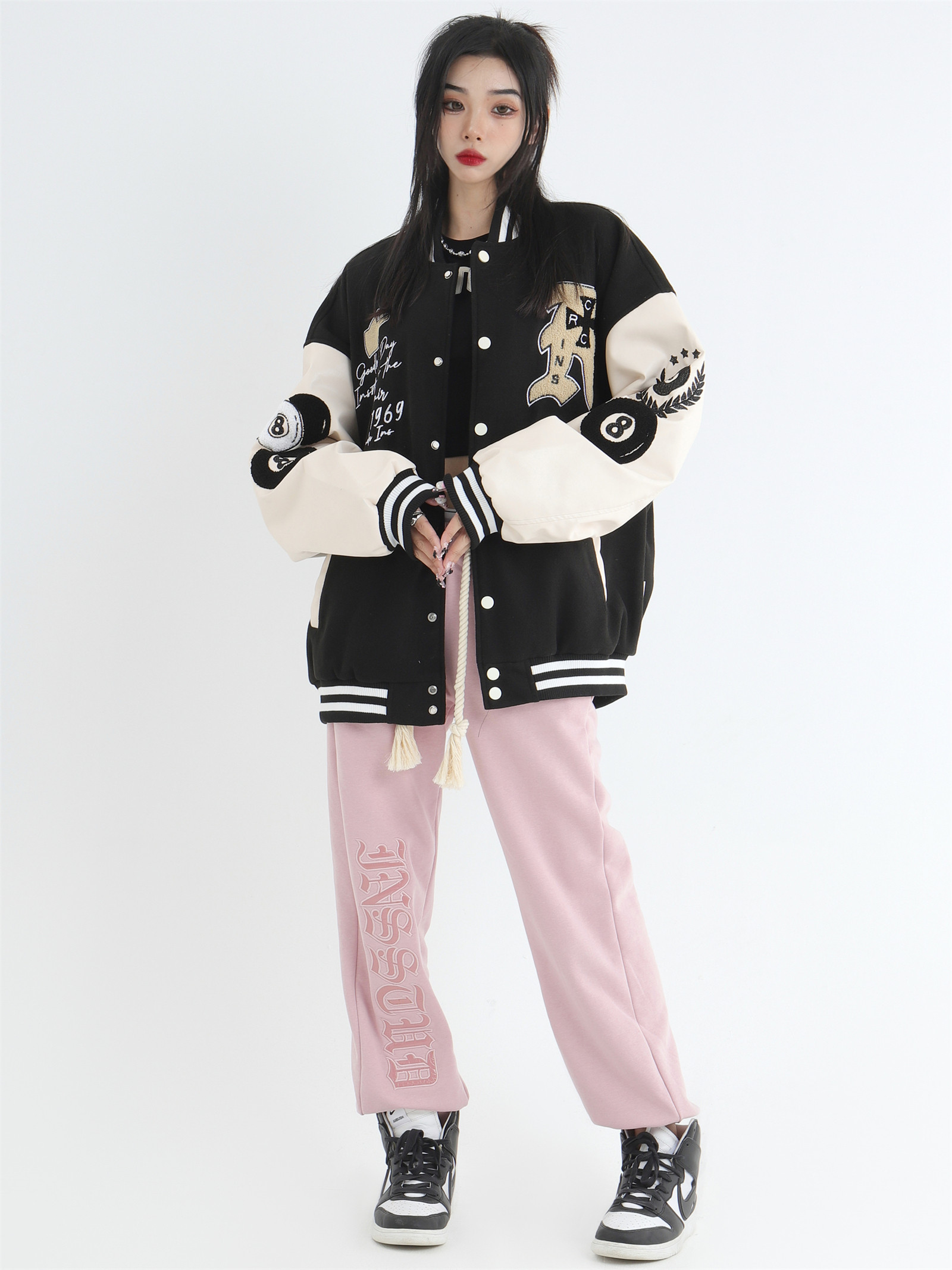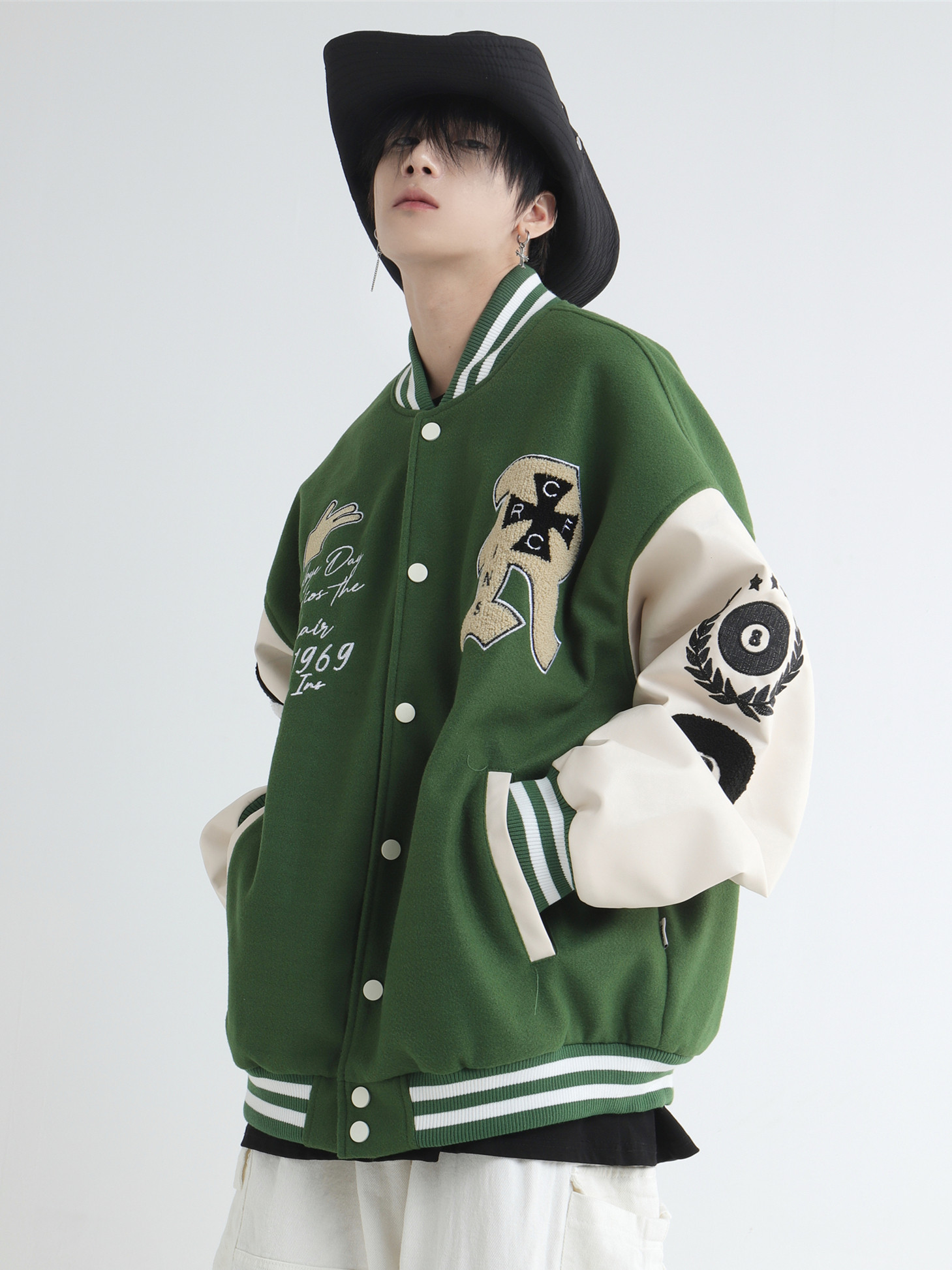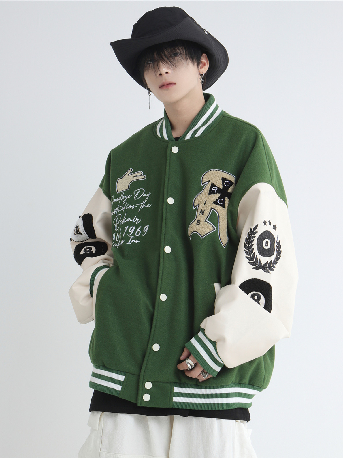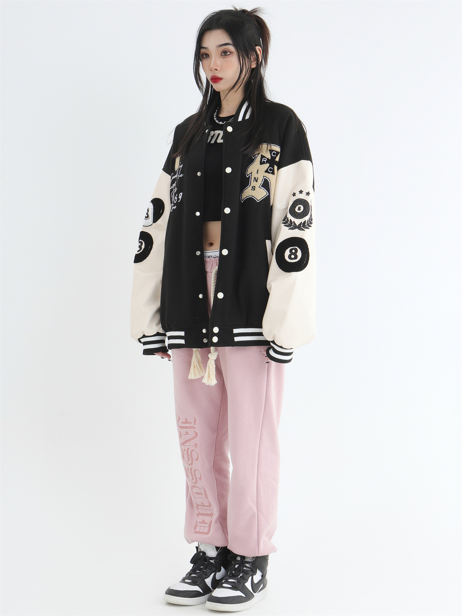 INSstudios 植絨LOGO黑八棒球服自制國潮情侶美式復古夾克外套男