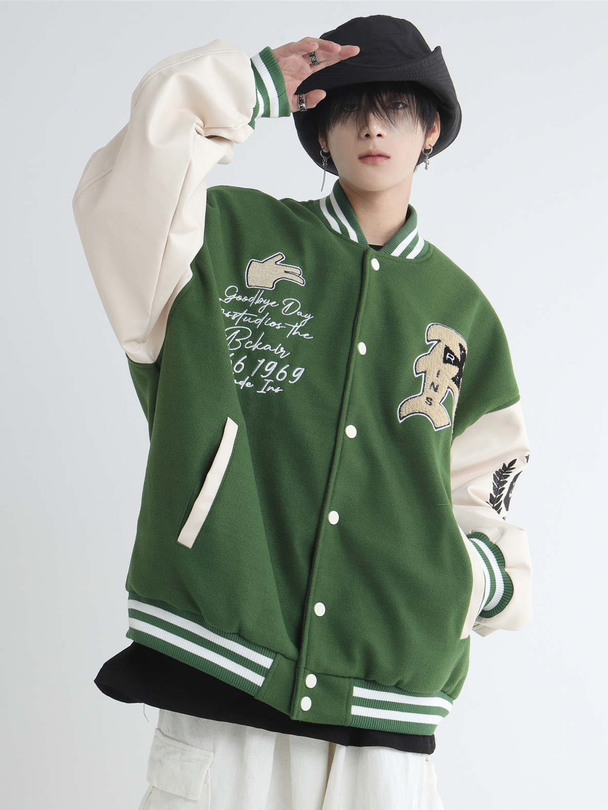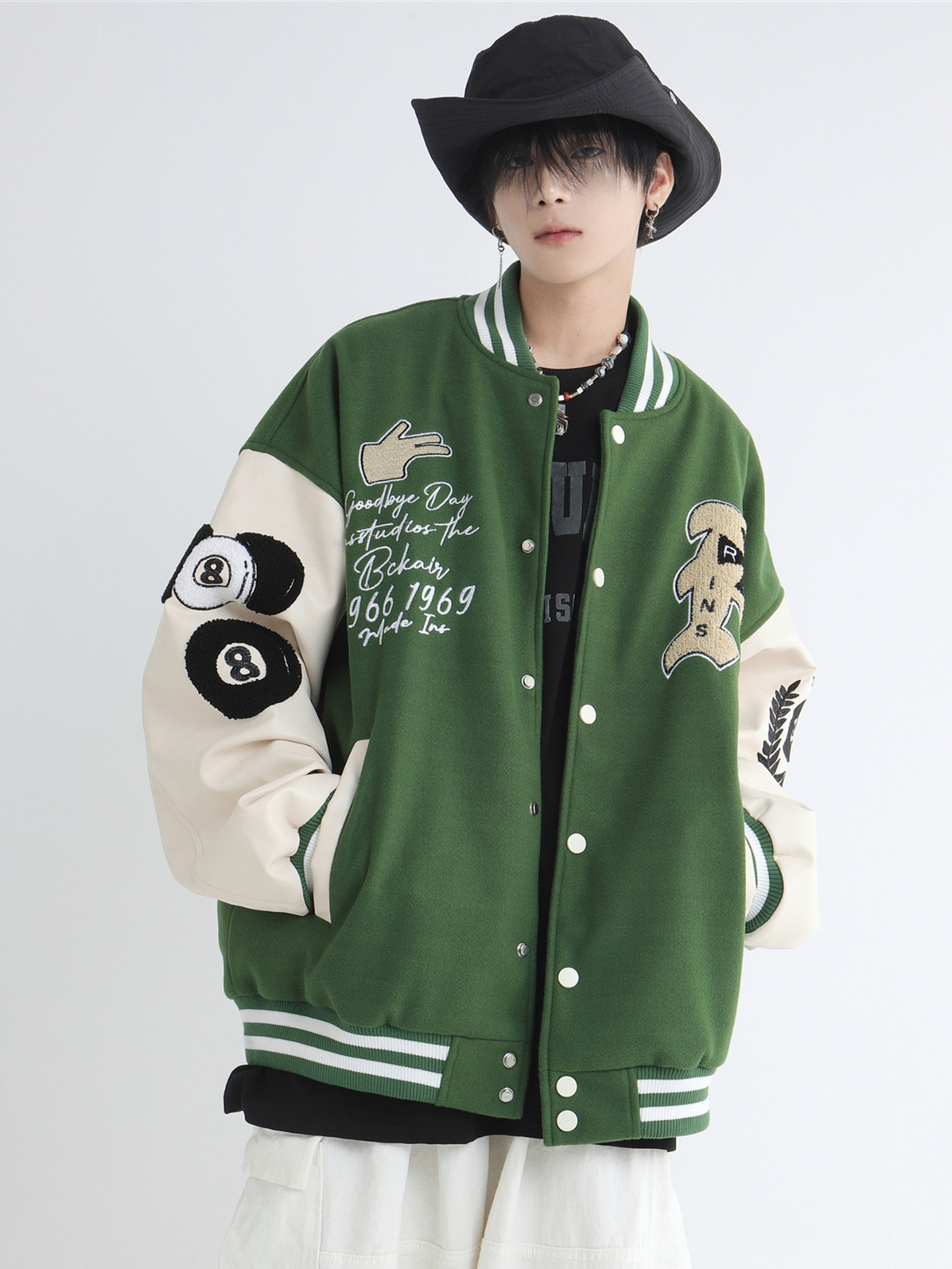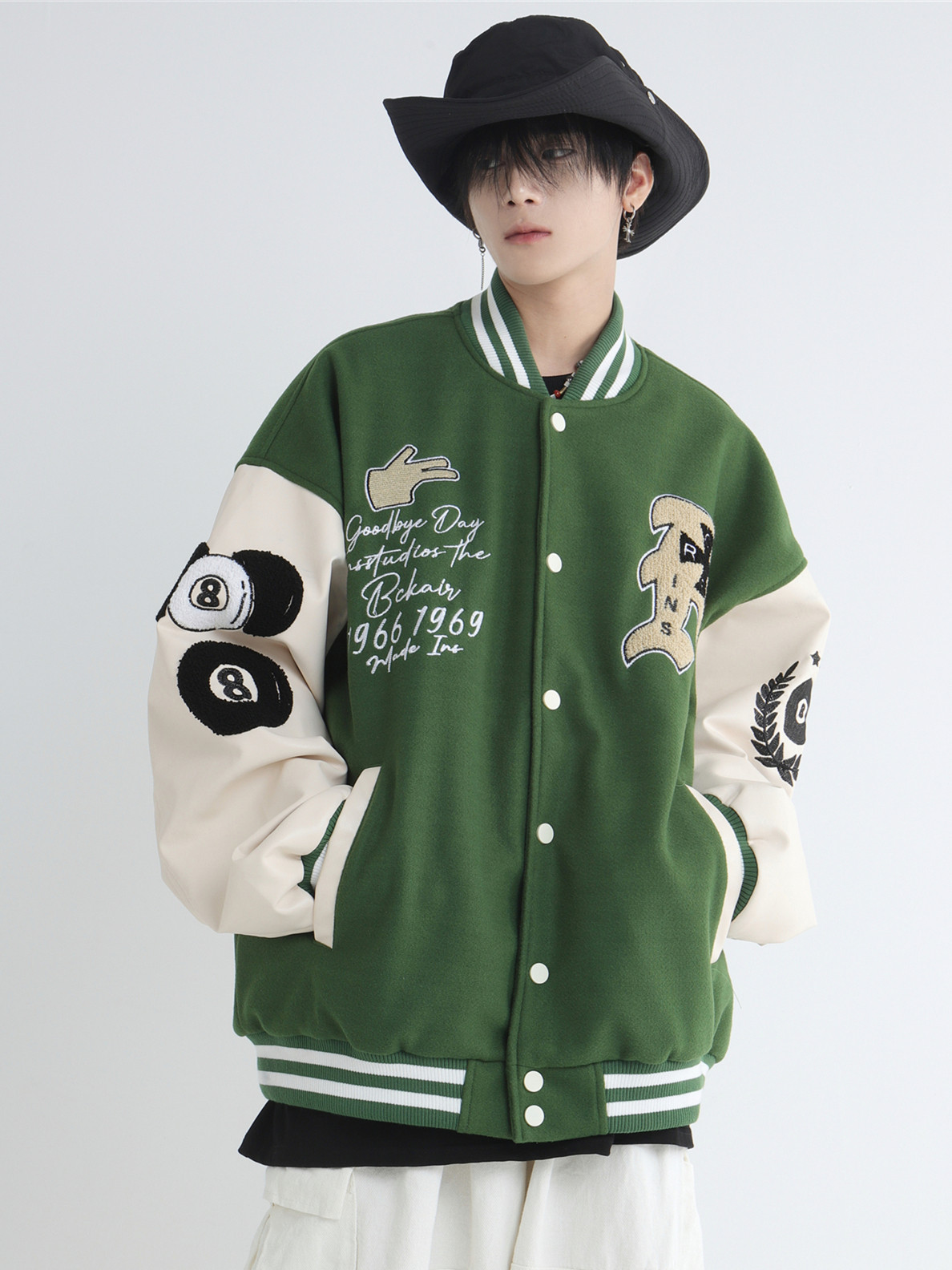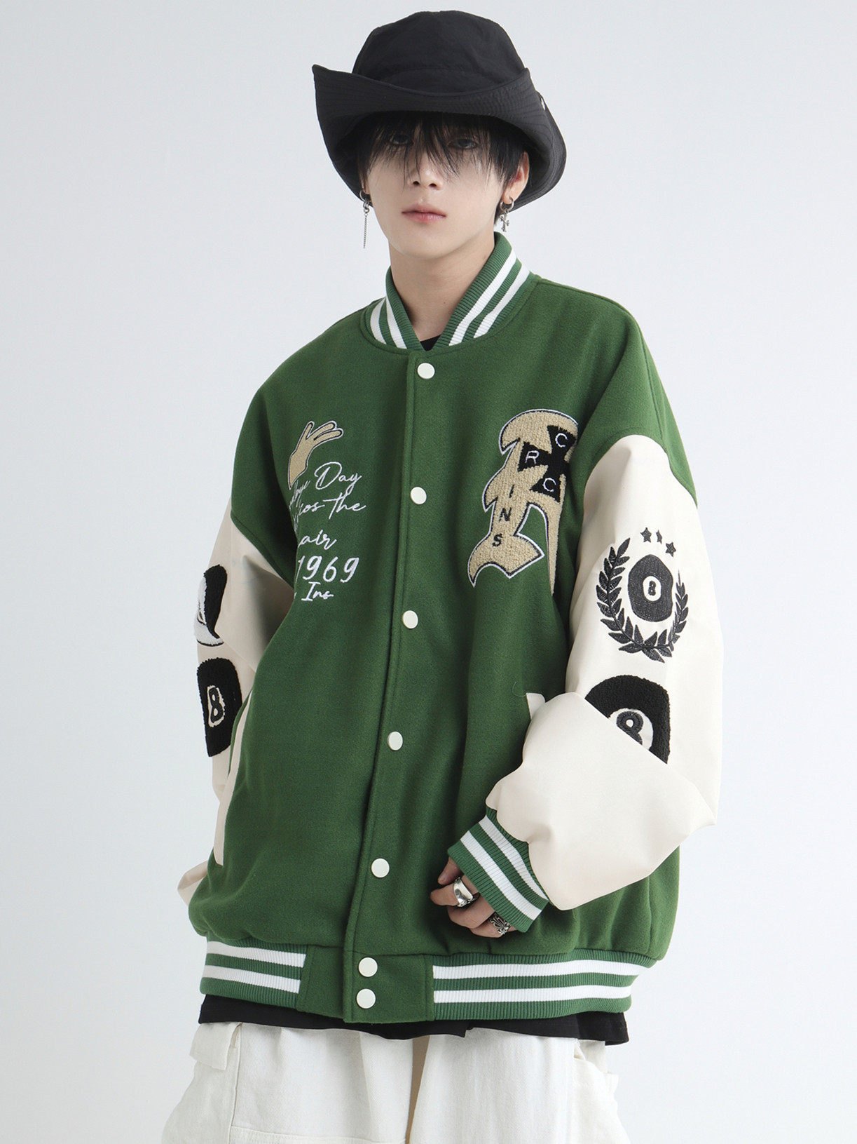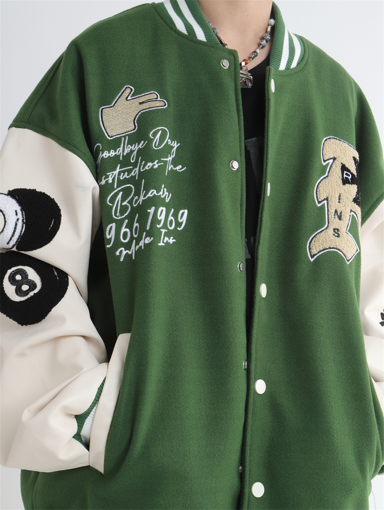INSstudios 植絨LOGO黑八棒球服自制國潮情侶美式復古夾克外套男