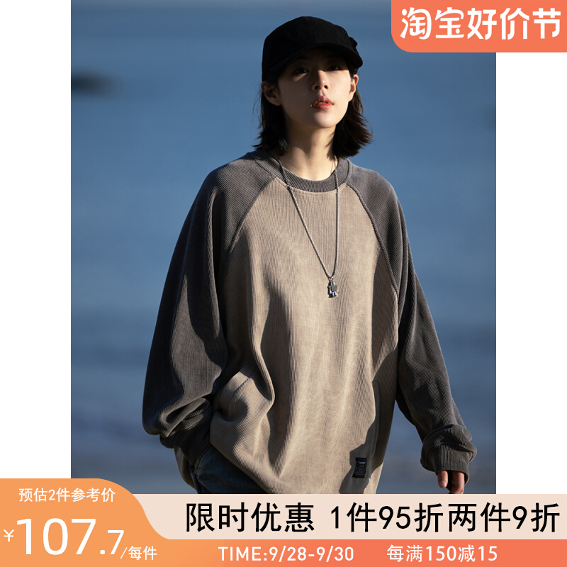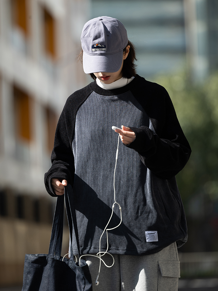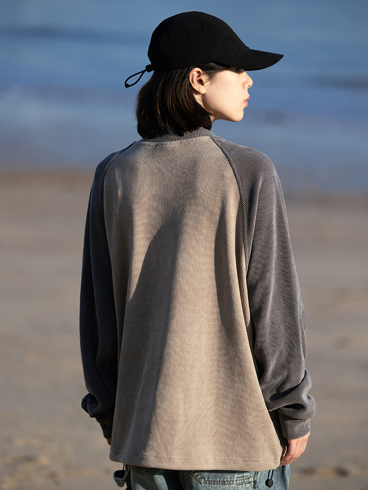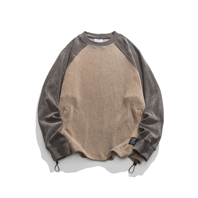 易燃空間2023春季新款插肩袖拼接華夫格圓領厚棉T男女款日系套頭衫
