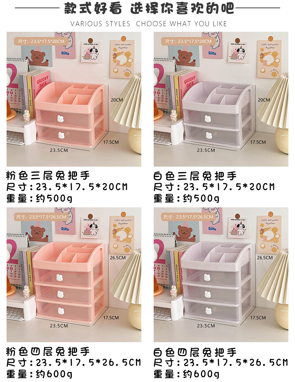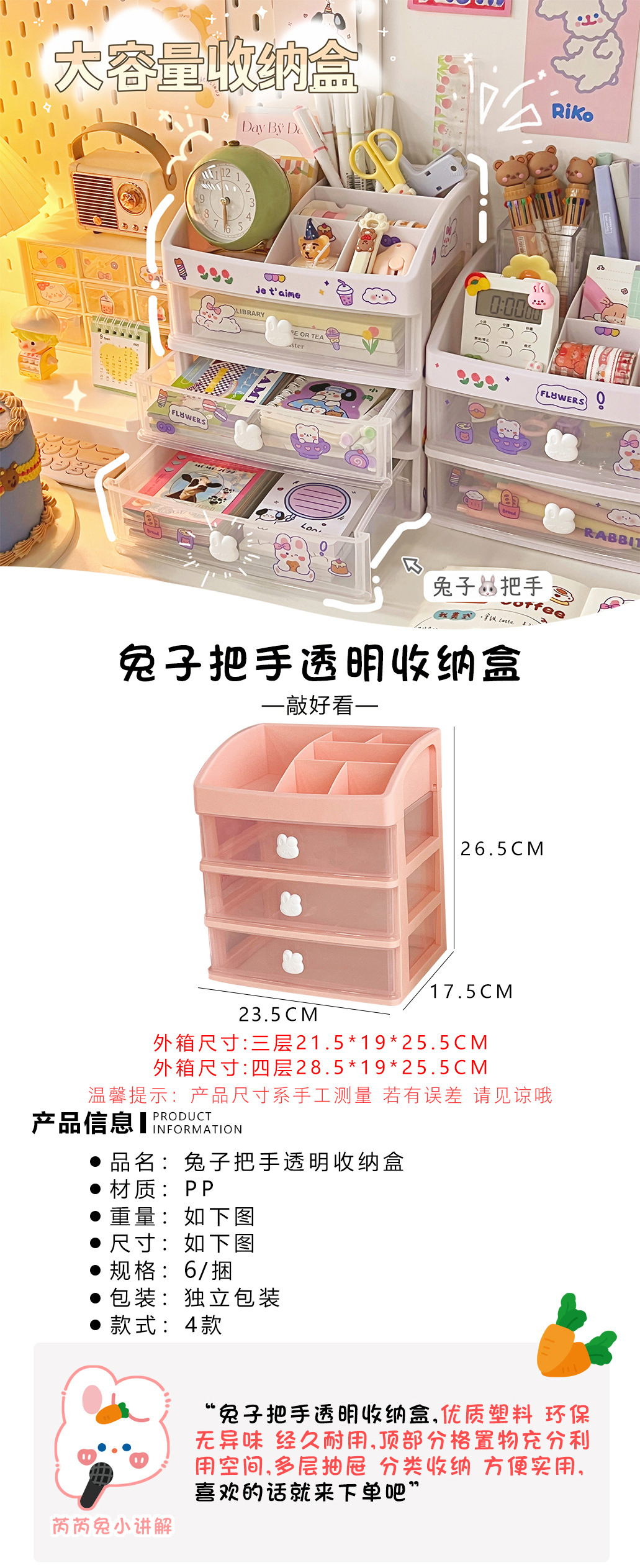 颜色 1#白色三层兔把手,2#粉色三层兔把手,3#白色四层兔把手,4#粉色四层兔把手,5#白色三层兔把手(送贴纸),6#粉色三层兔把手(送贴纸),7#白色四层兔把手(送贴纸),8#粉色四层兔把手(送贴纸),9#白色两层兔把手,10#粉色两层兔把手,11#白色两层兔把手(送贴纸),12#粉色两层兔把手(送贴纸)