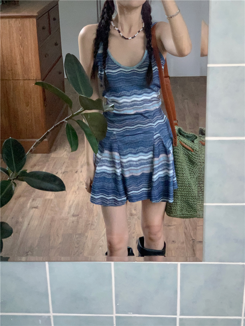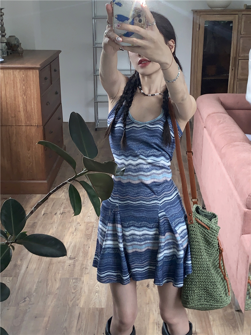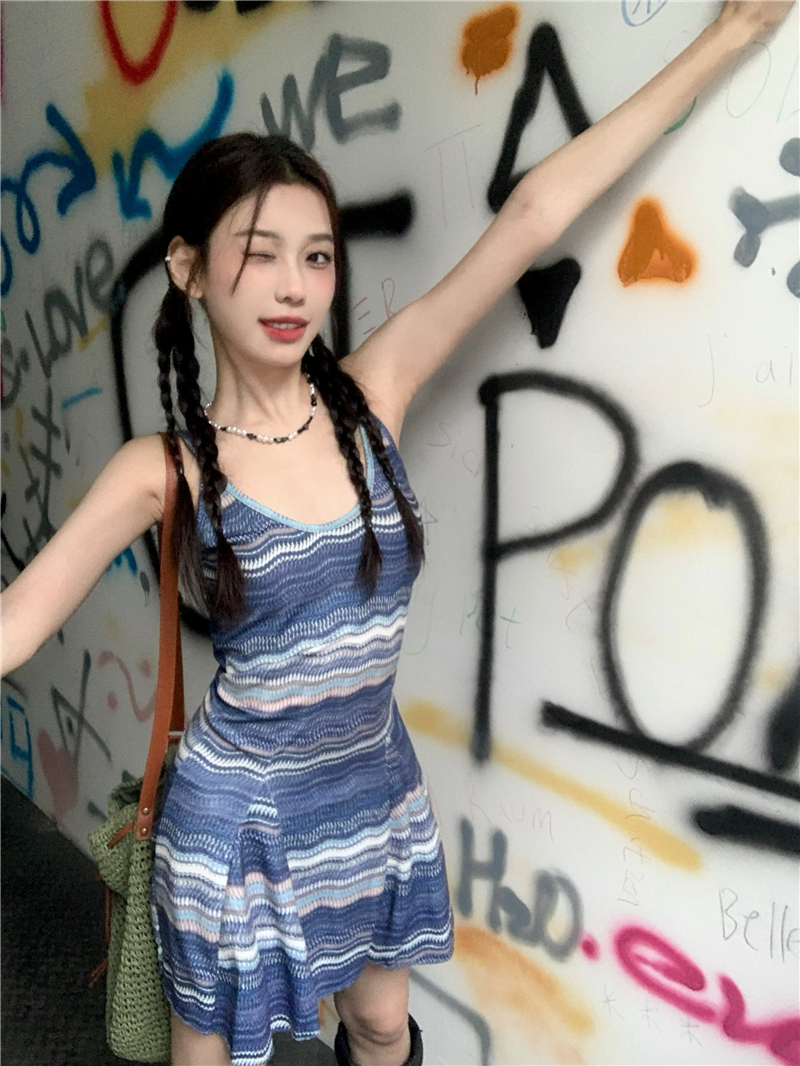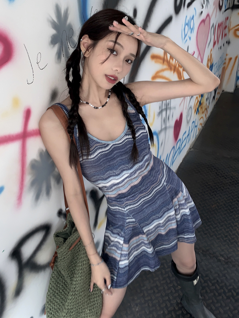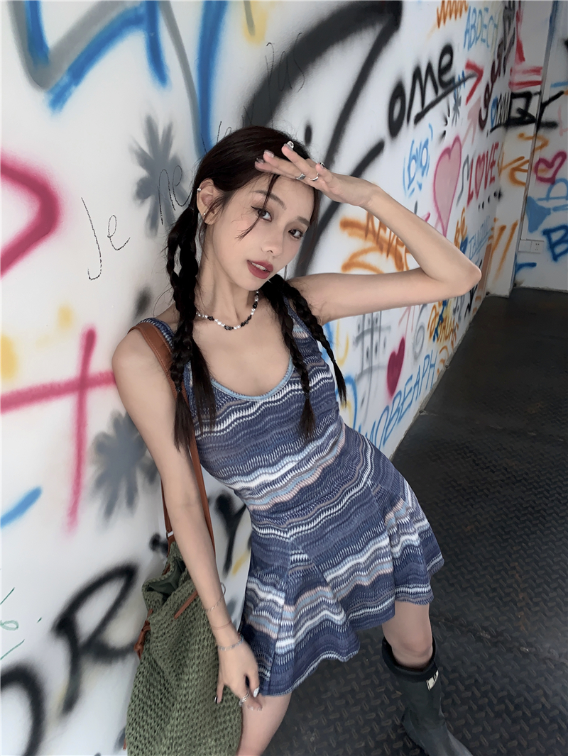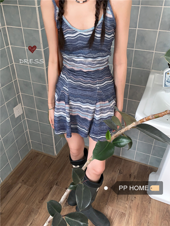 PPHOME澀谷朋克妹~復古小眾古著感條紋背心洋裝女收腰顯瘦短裙