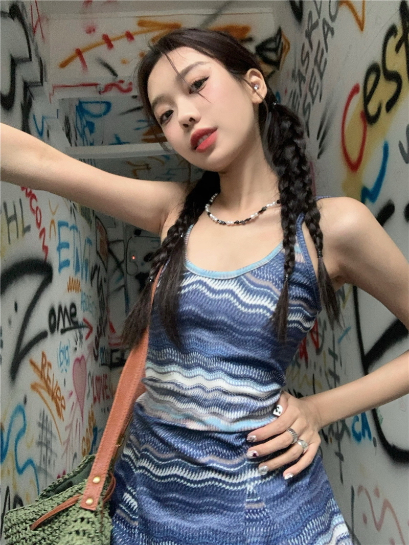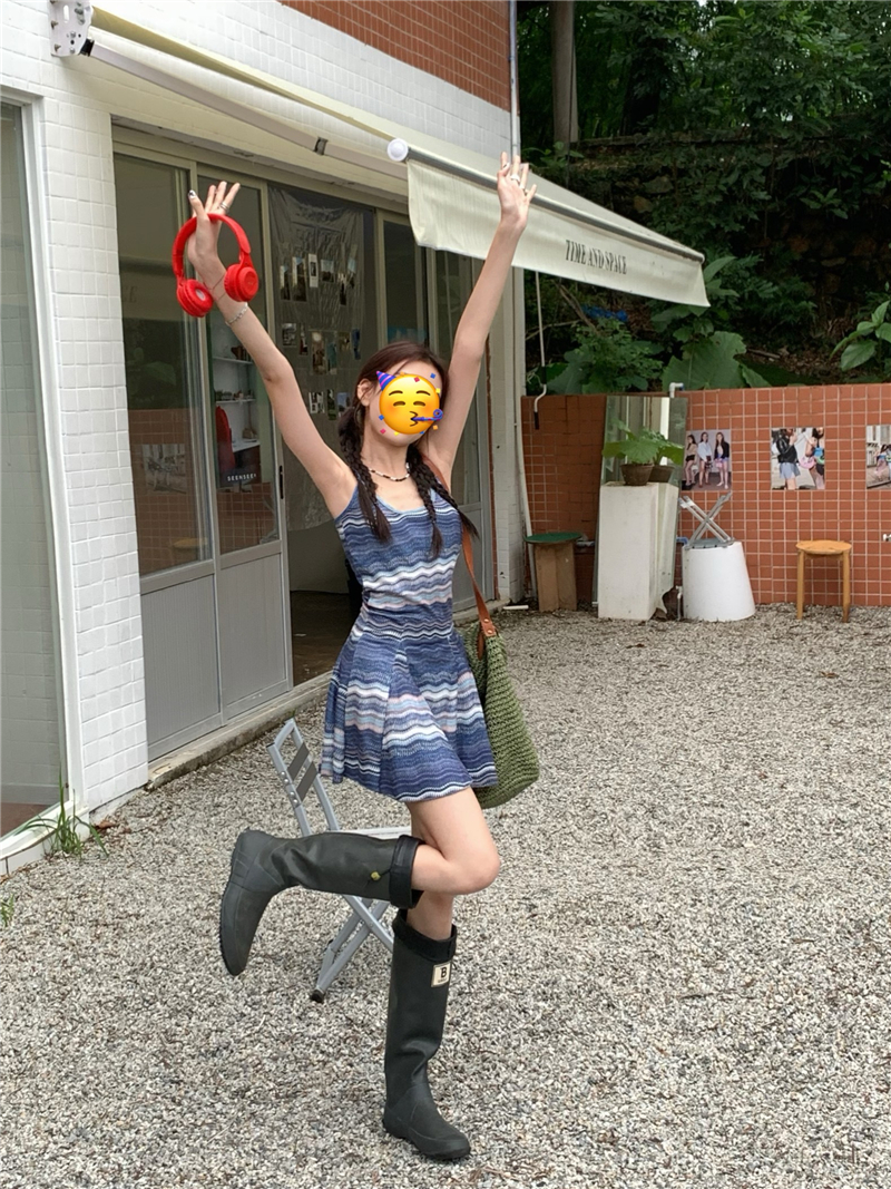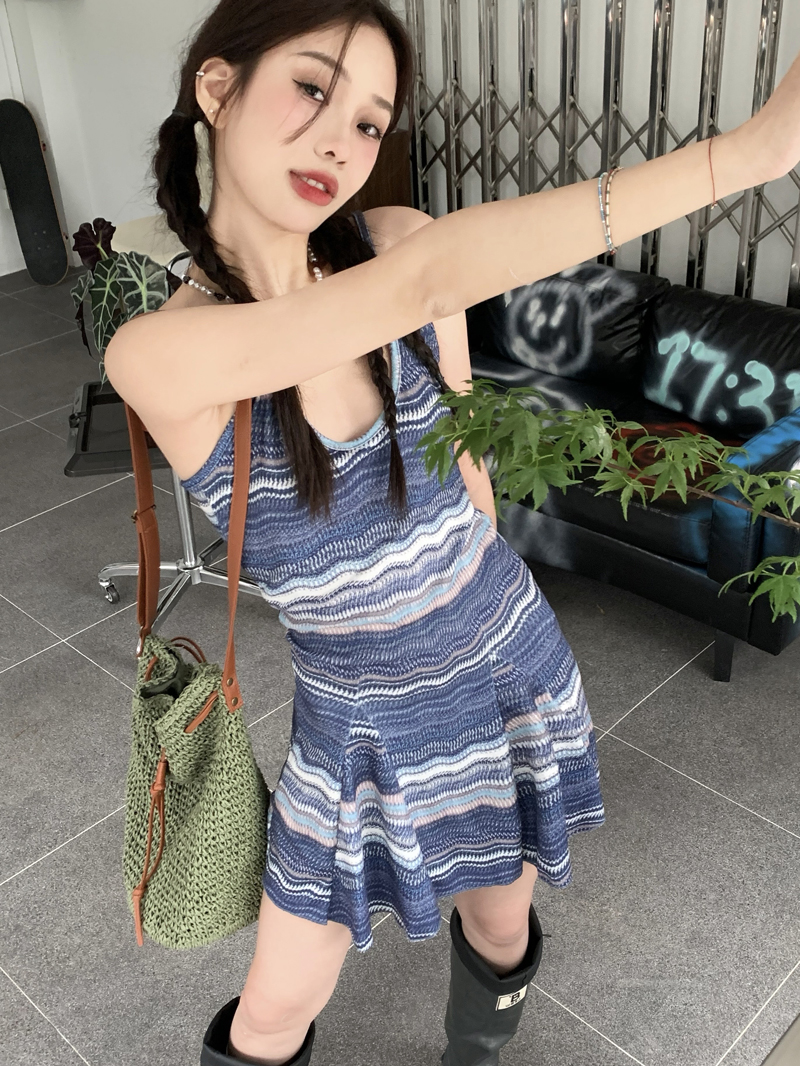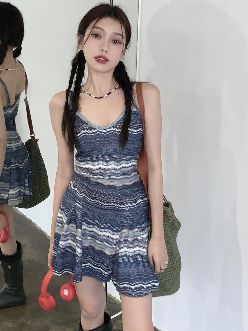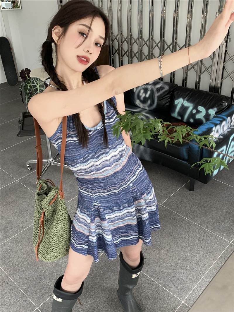 PPHOME澀谷朋克妹~復古小眾古著感條紋背心洋裝女收腰顯瘦短裙