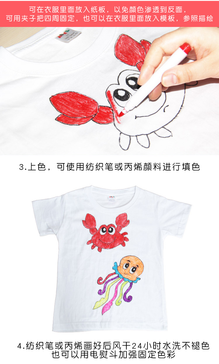 功能:未经许可:可用绘画模板,纺织笔,丙烯颜料等进行上色,也可用不织布、纽扣等进行DIY创作。用纺织颜料专用笔和丙烯颜料上色,风干24小时后水洗不褪色