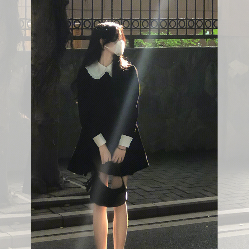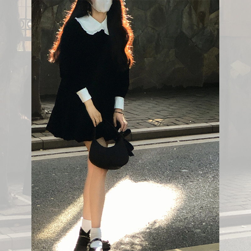 法式黑色赫本小香風娃娃領洋裝女秋季高級感小個子長袖小黑裙子